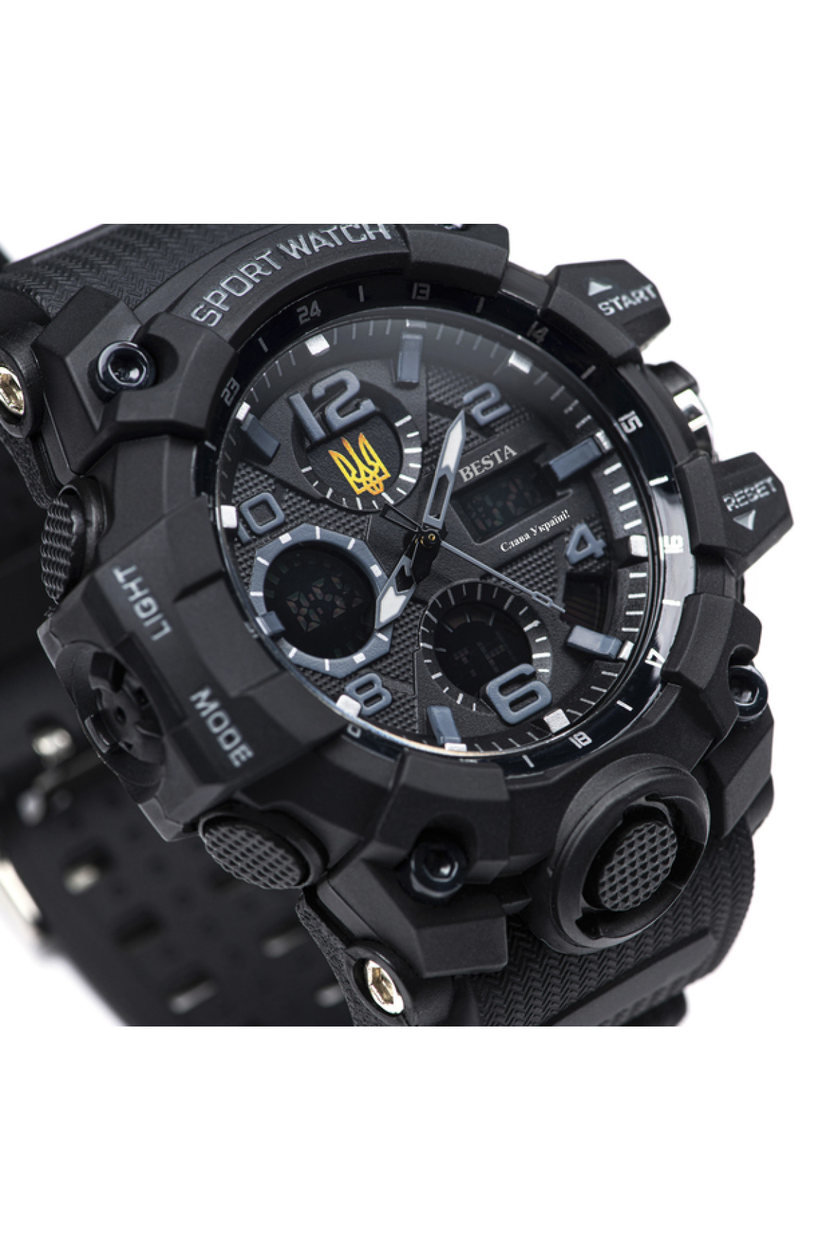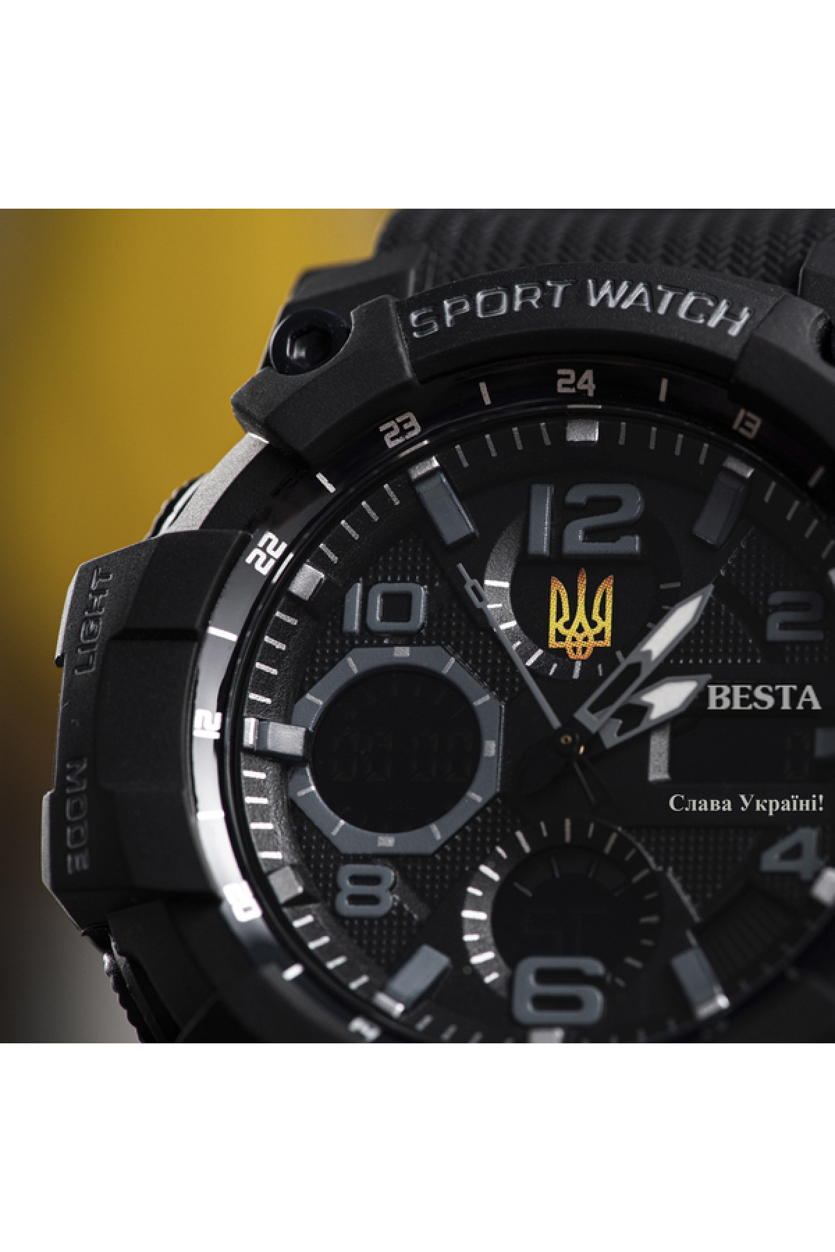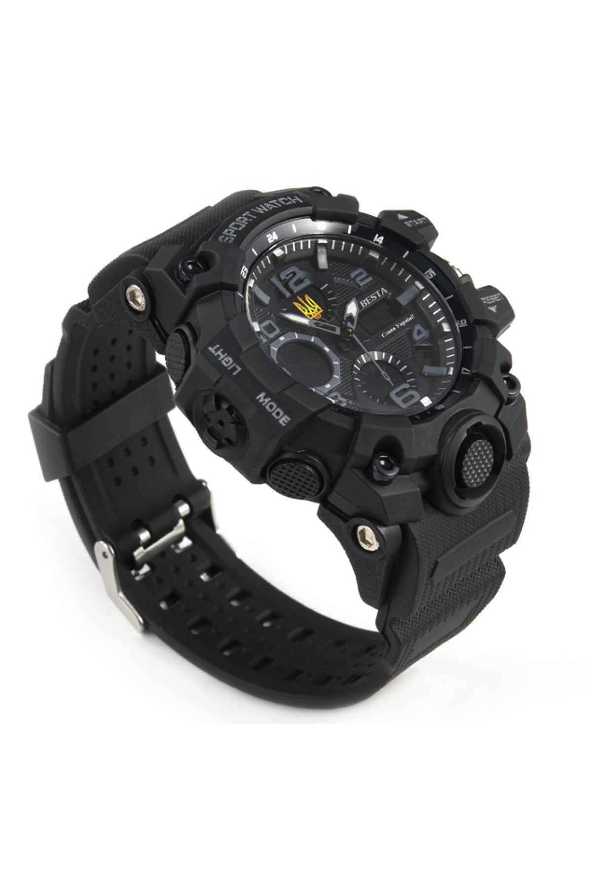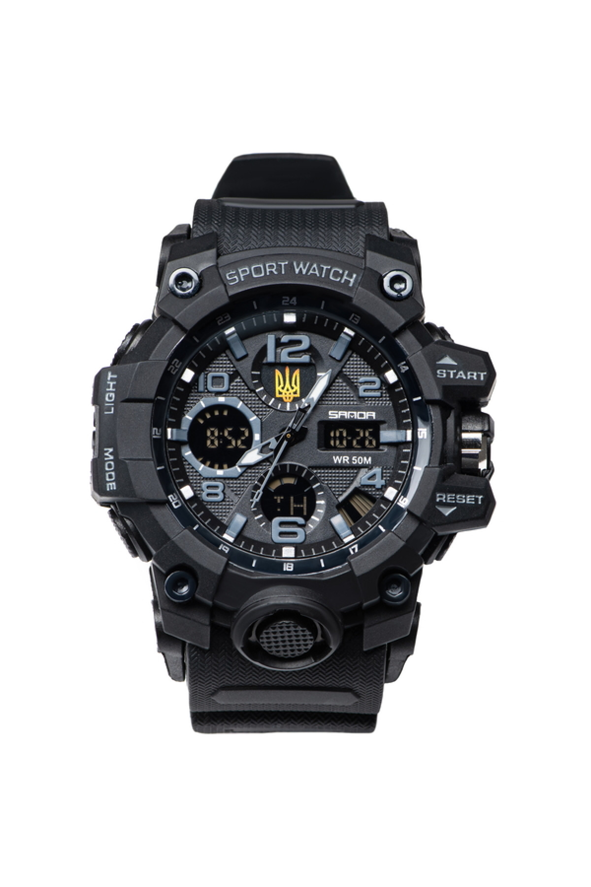 Трузуб, секундомір, будильник, підсвічування, час показується на циферблаті і стрілками, дата, день тижня, місяць