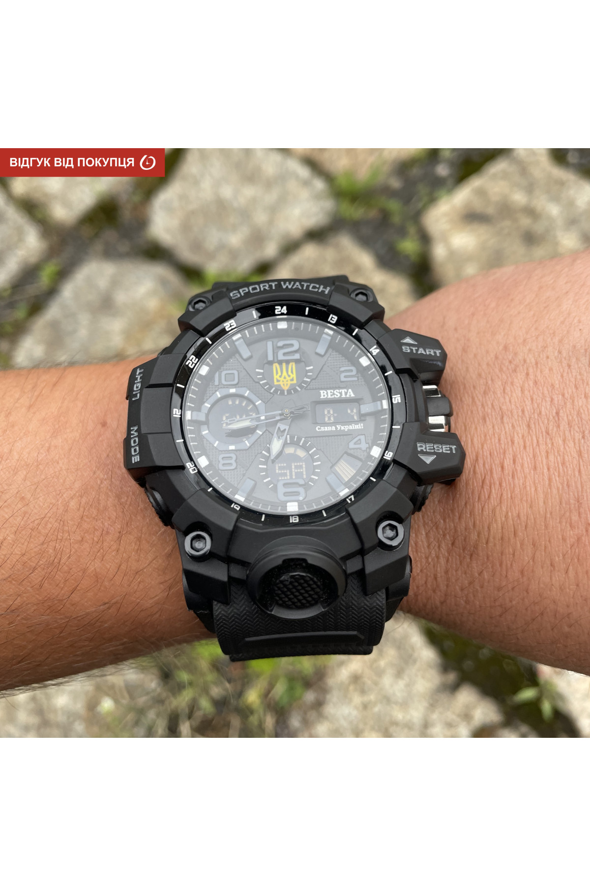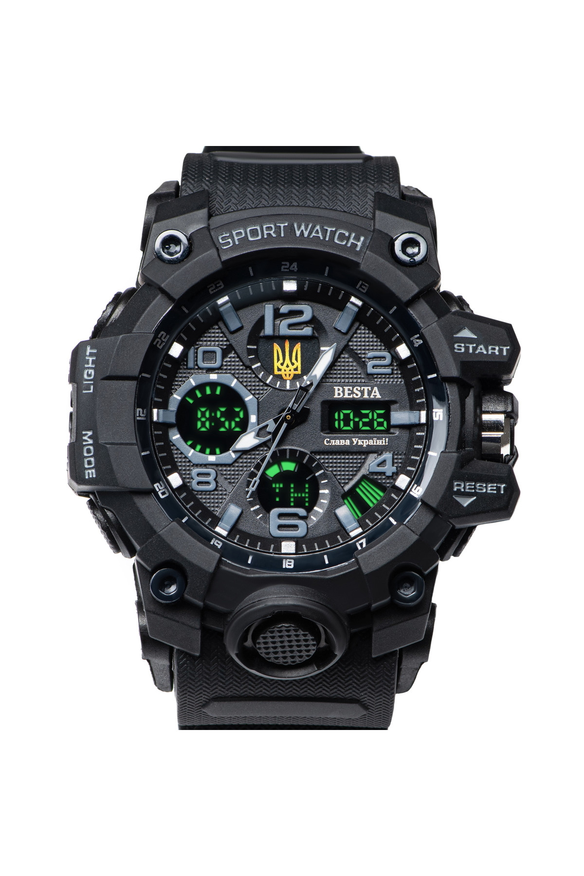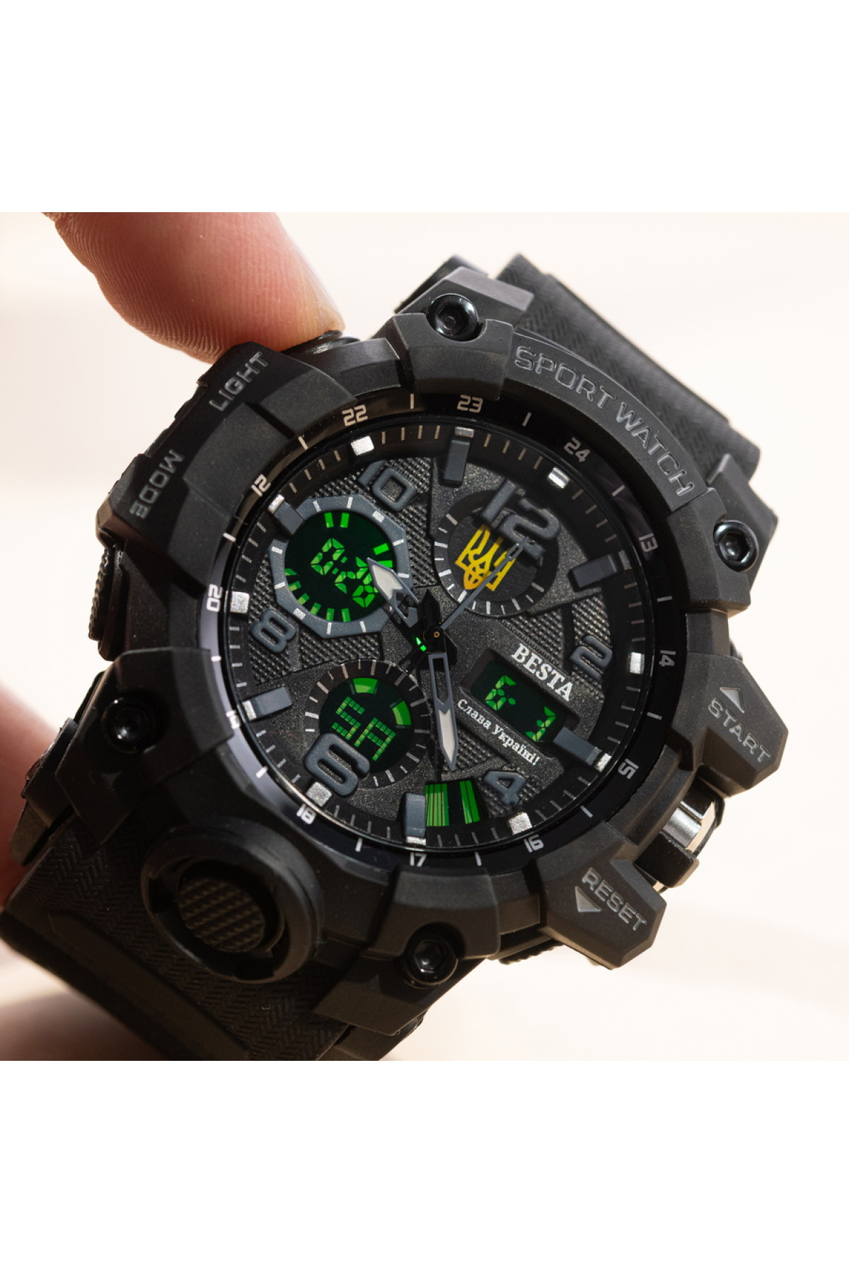Трузуб, секундомір, будильник, підсвічування, час показується на циферблаті і стрілками, дата, день тижня, місяць