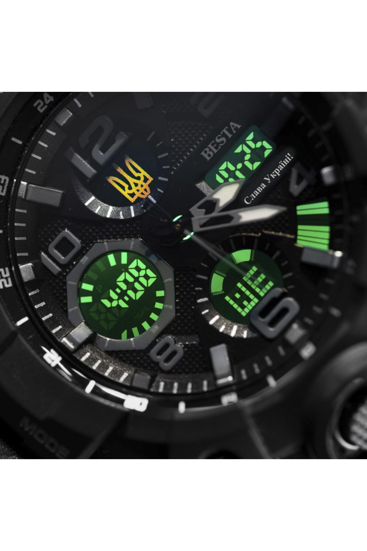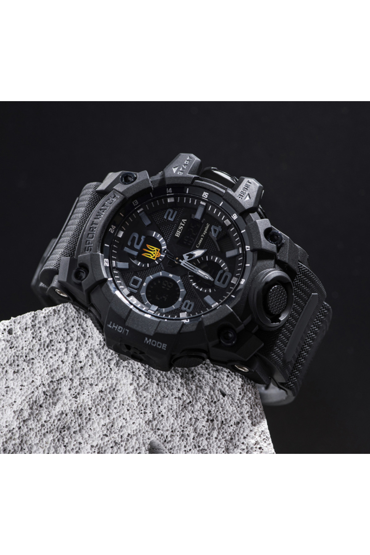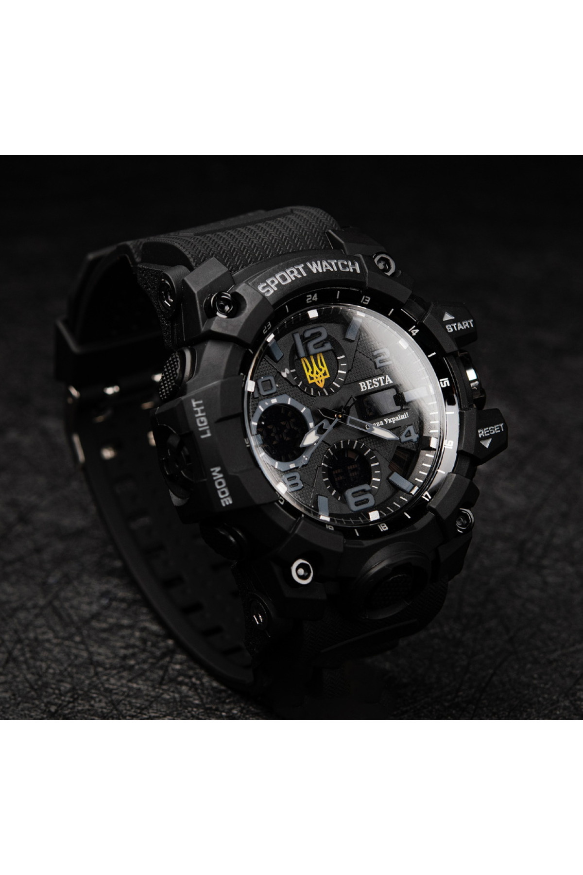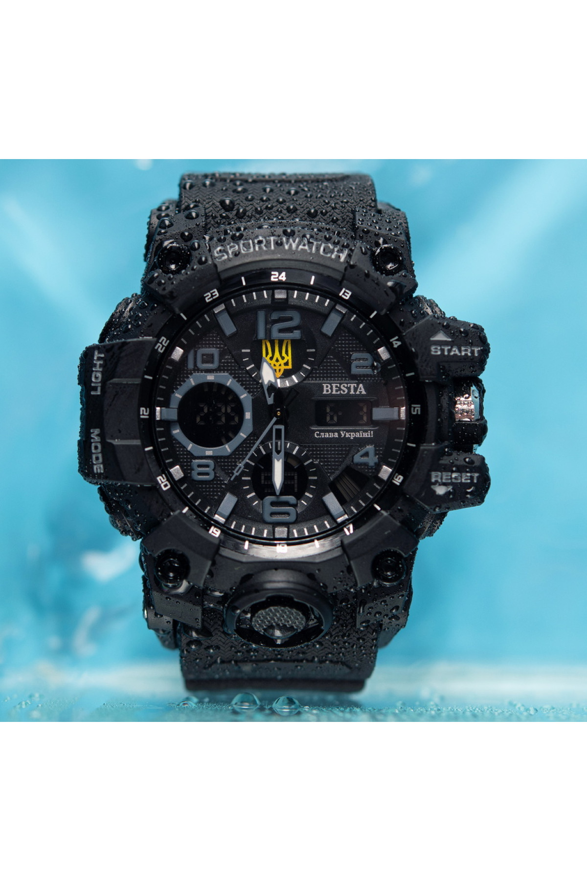Трузуб, секундомір, будильник, підсвічування, час показується на циферблаті і стрілками, дата, день тижня, місяць