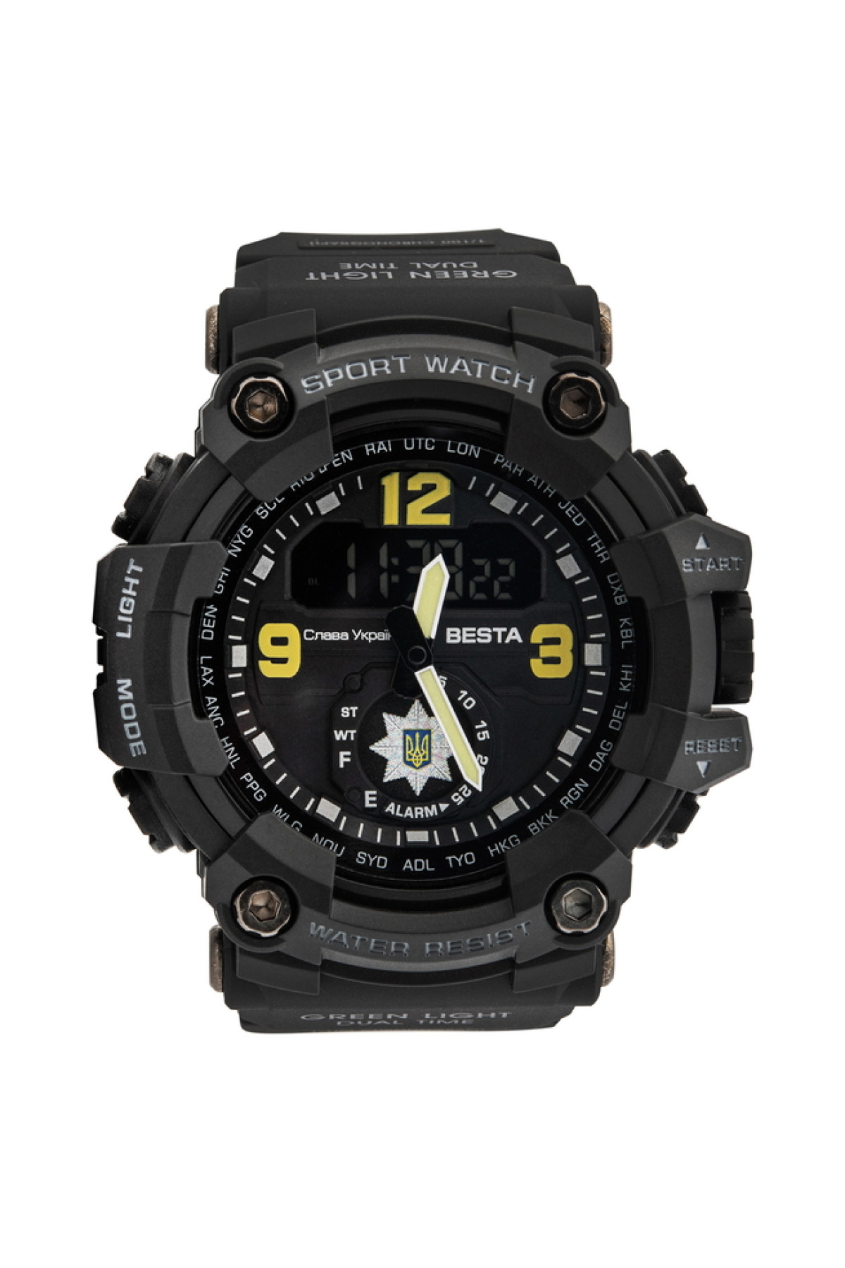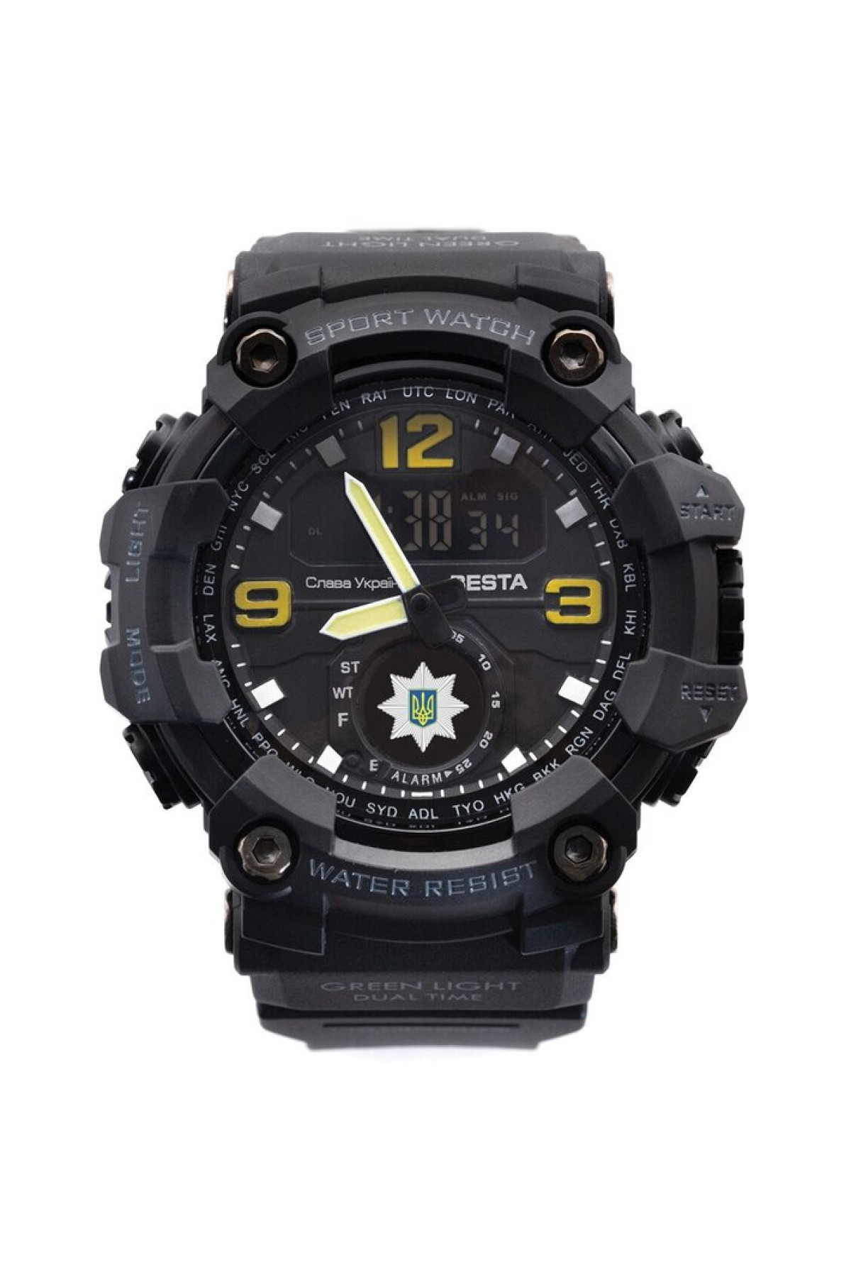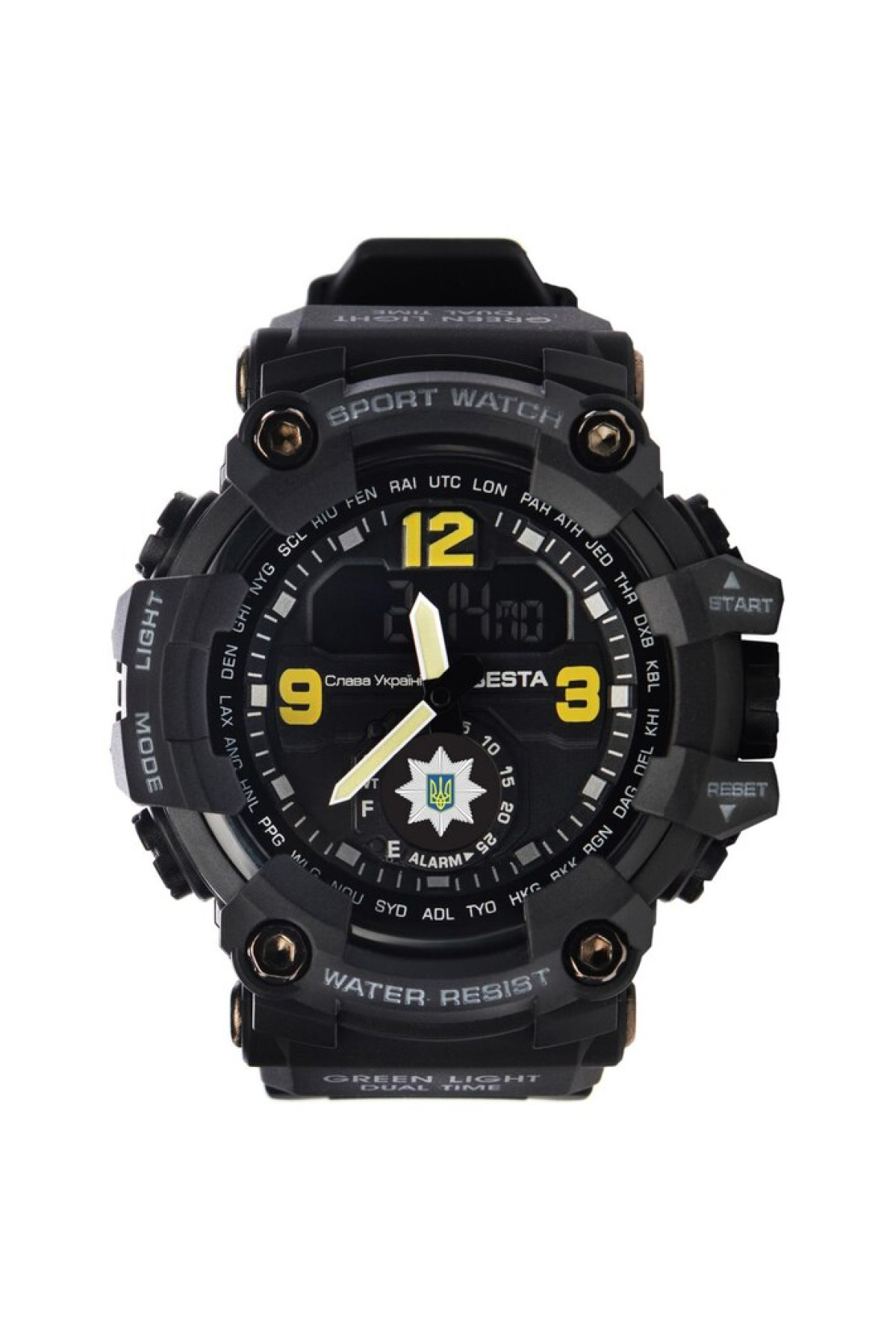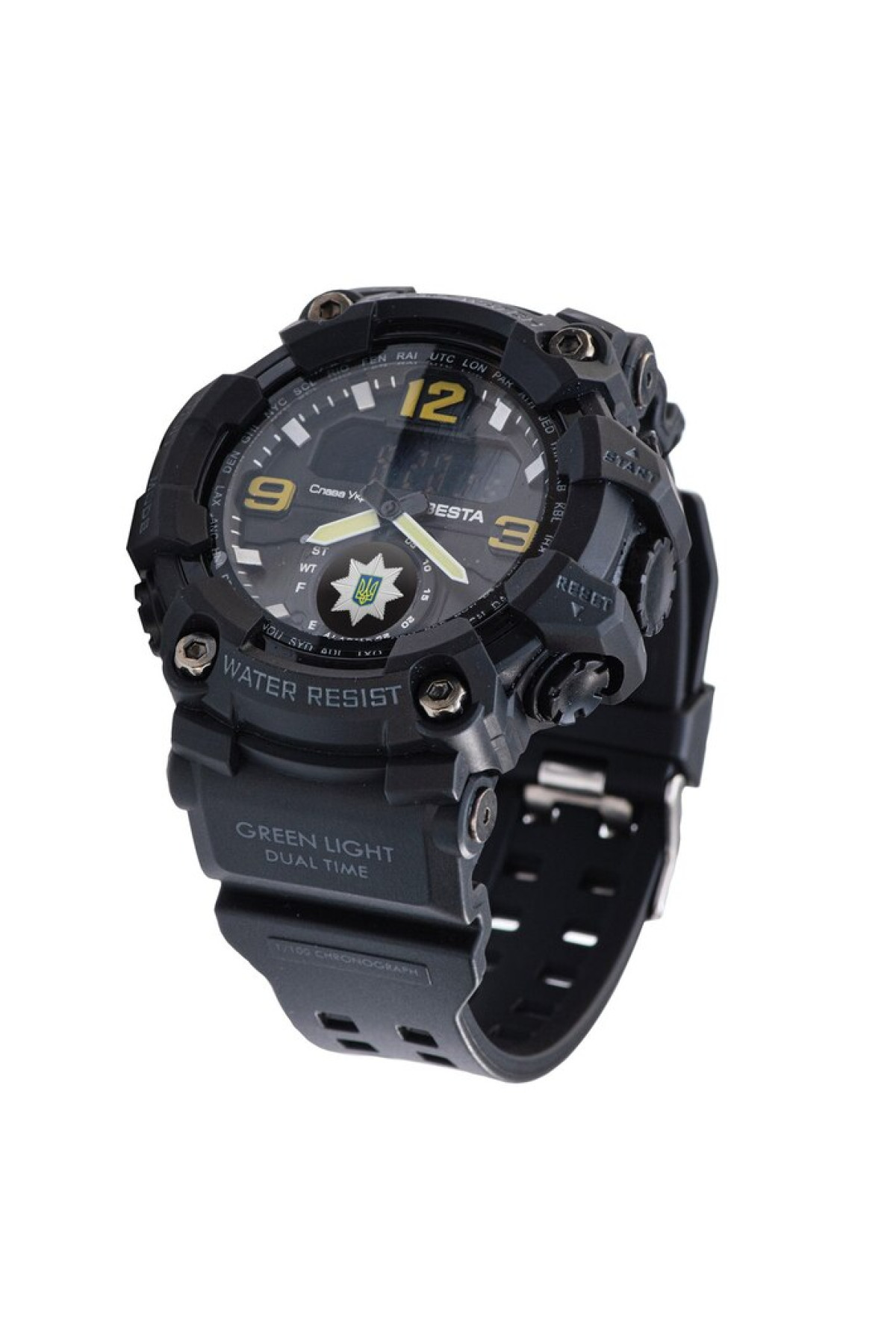 Знак поліції, секундомір, будильник, підсвічування, дата, день тижня, місяць, другий час (Dual Time)