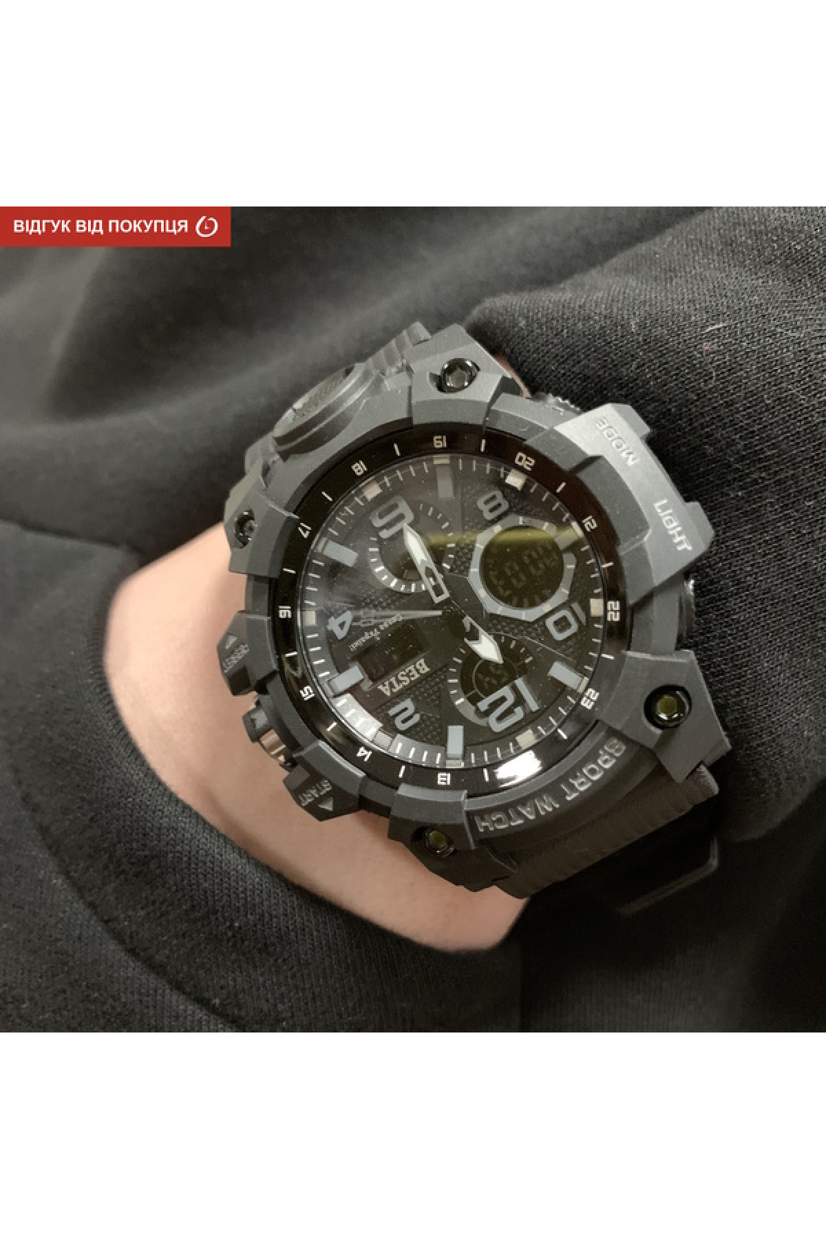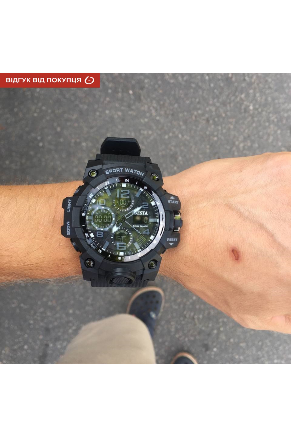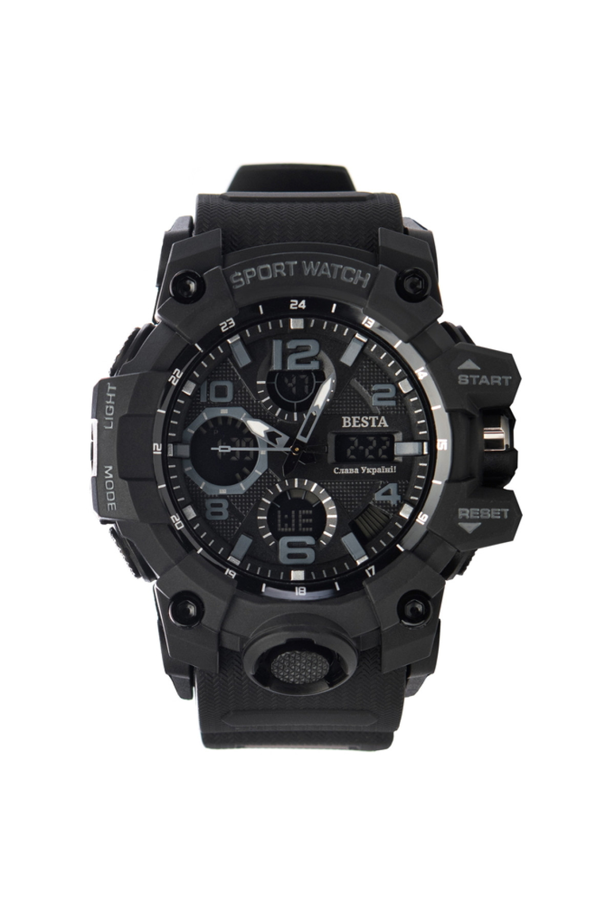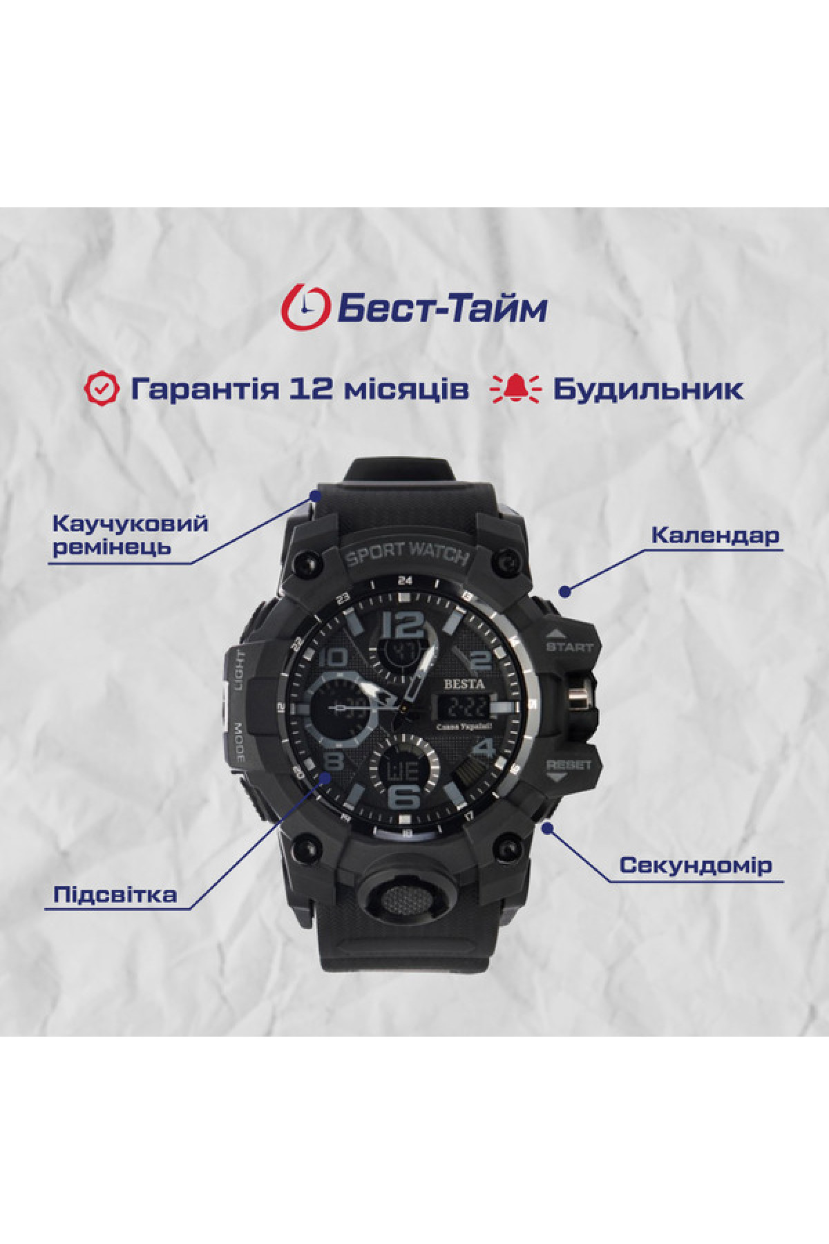 Секундомір, будильник, підсвічування, час показується на циферблаті й стрілками, дата, день тижня, місяць