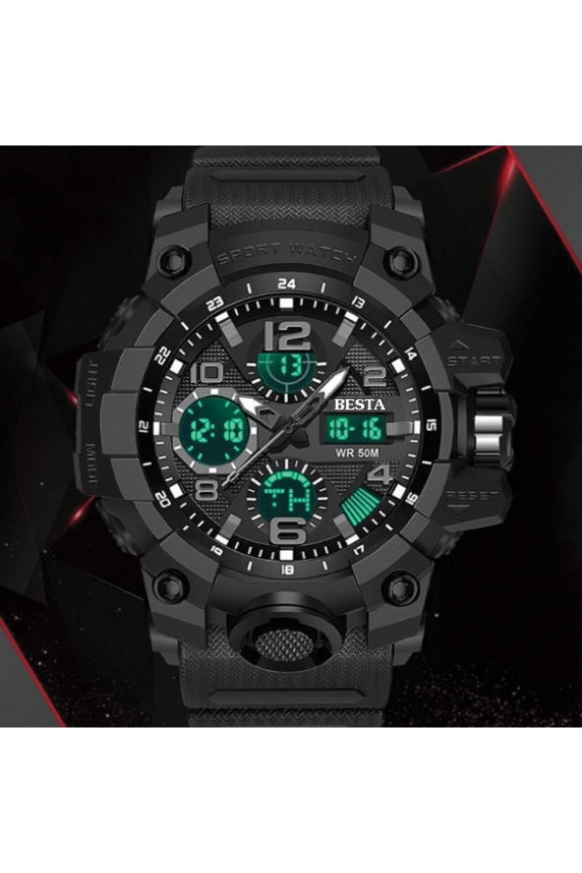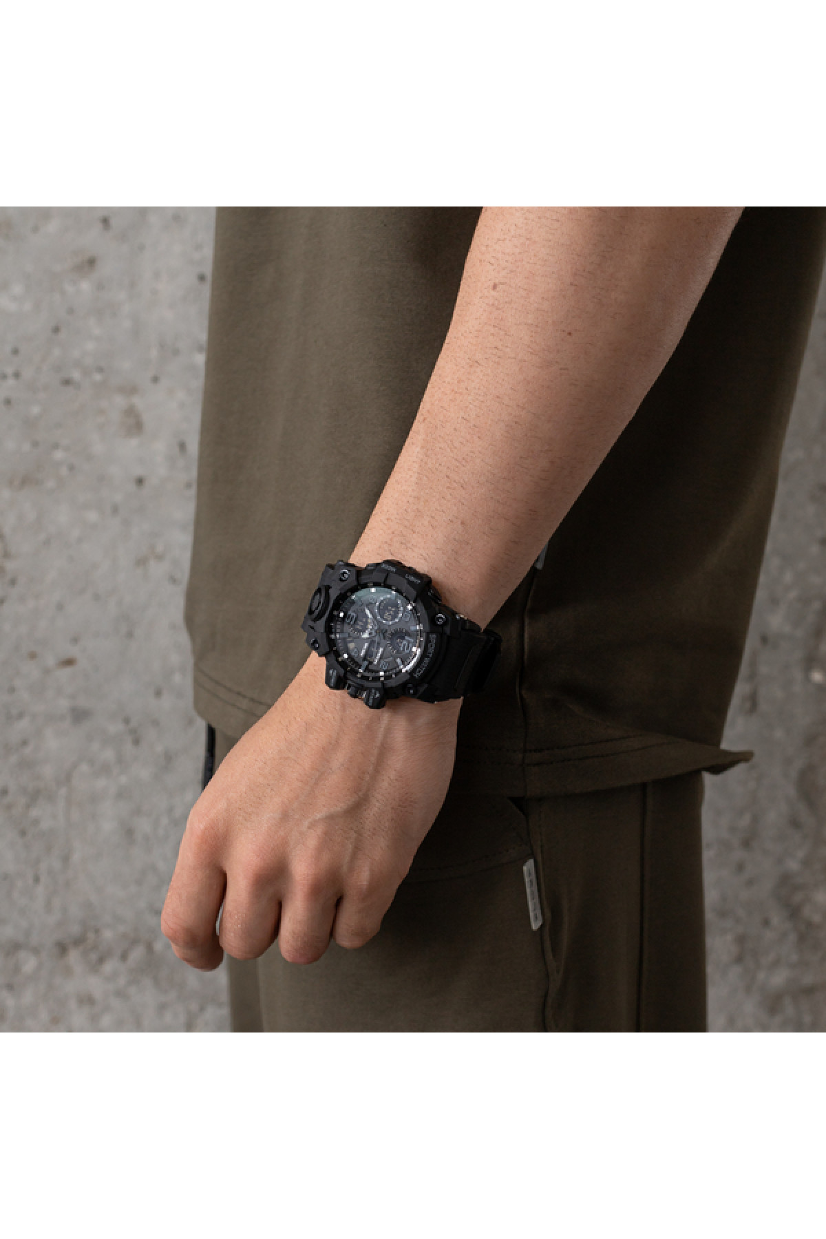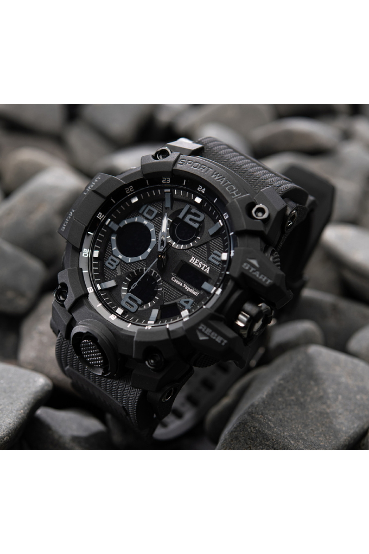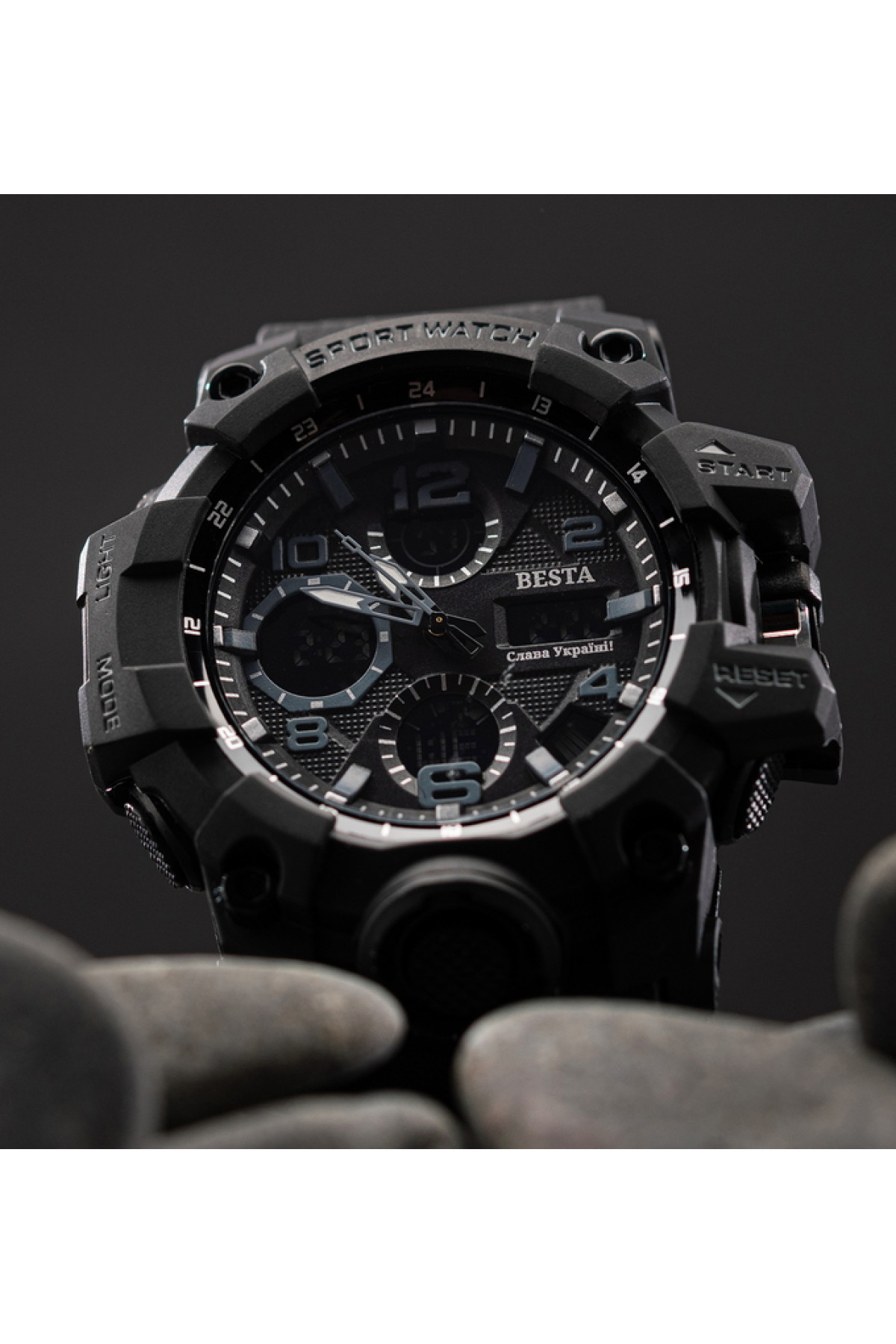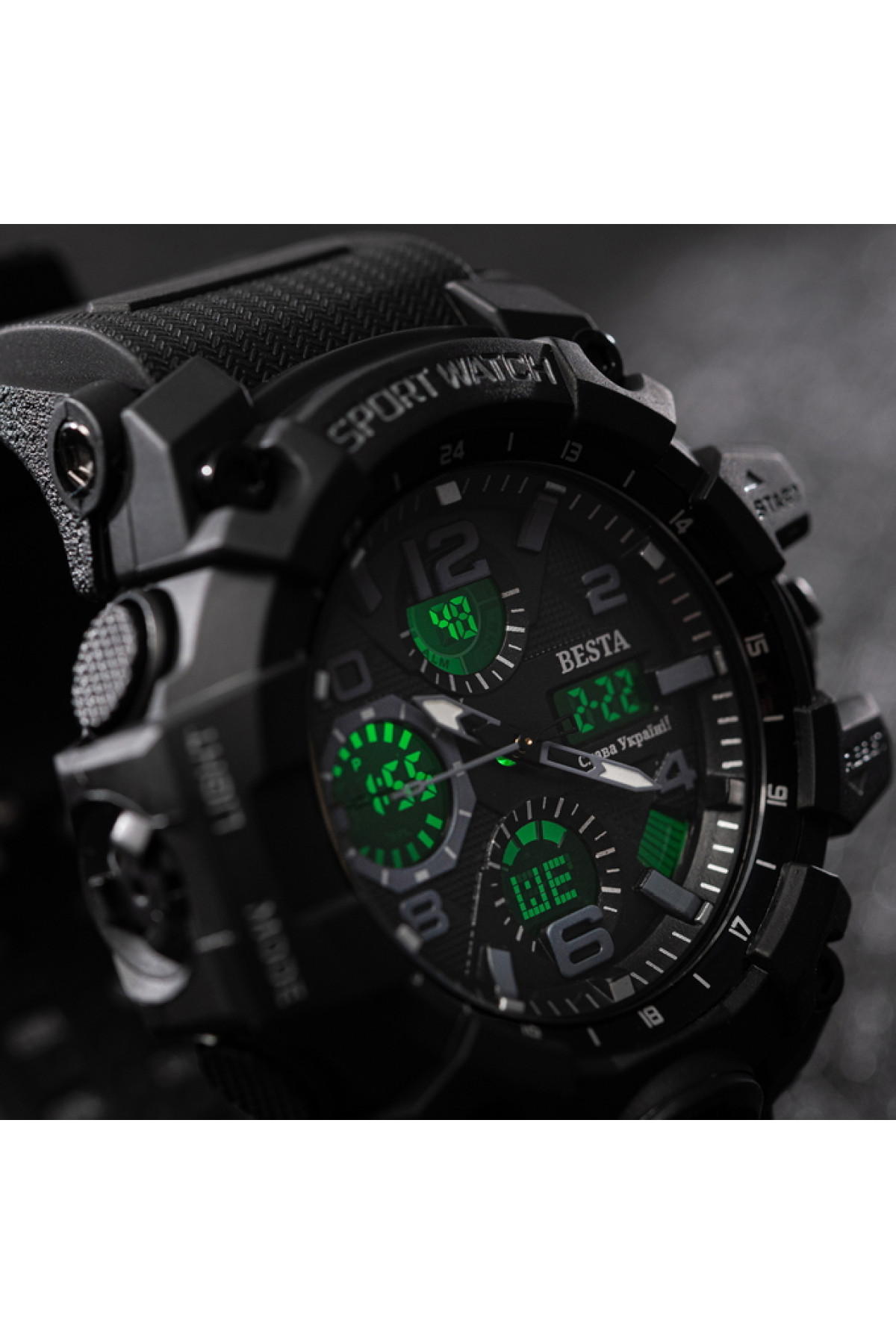 Секундомір, будильник, підсвічування, час показується на циферблаті й стрілками, дата, день тижня, місяць
