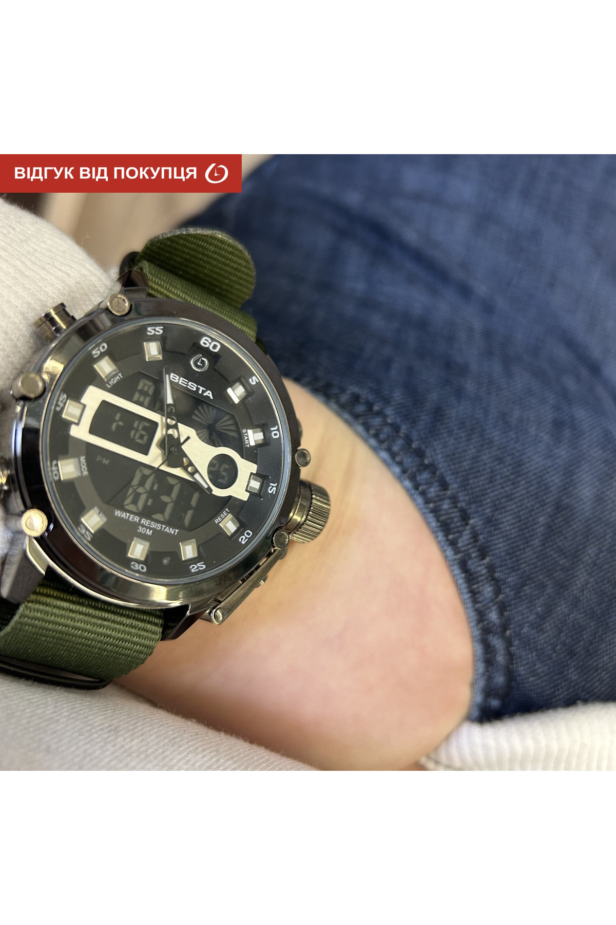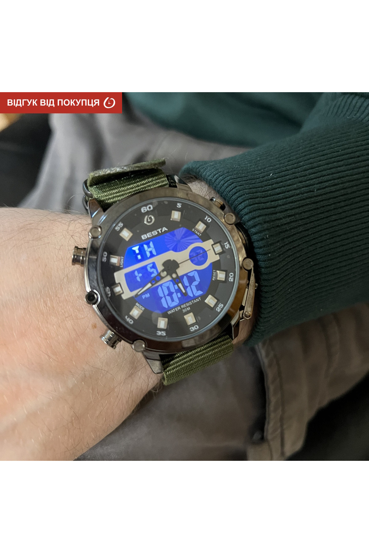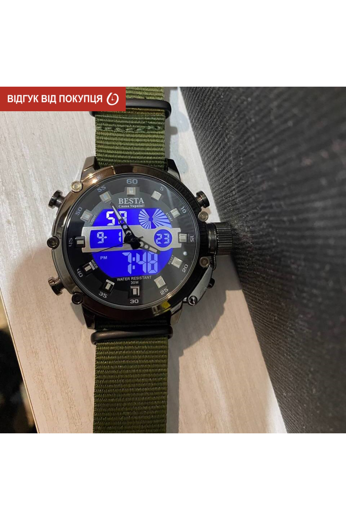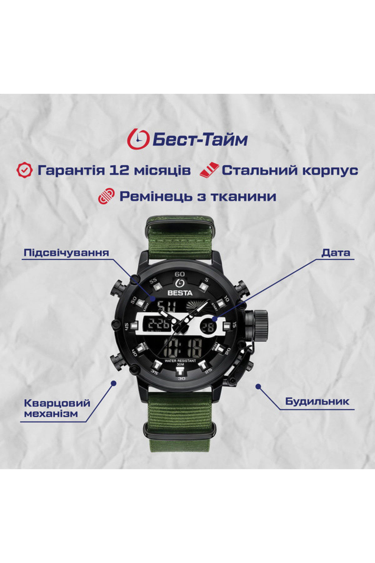 Будильник, підсвічування, секундомір, час показується на циферблаті й стрілками, дата, день тижня, місяць