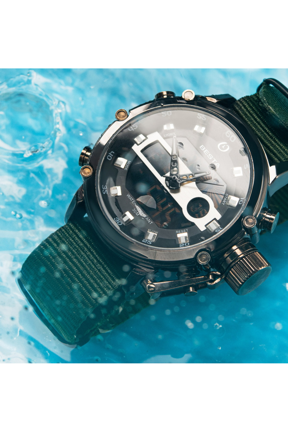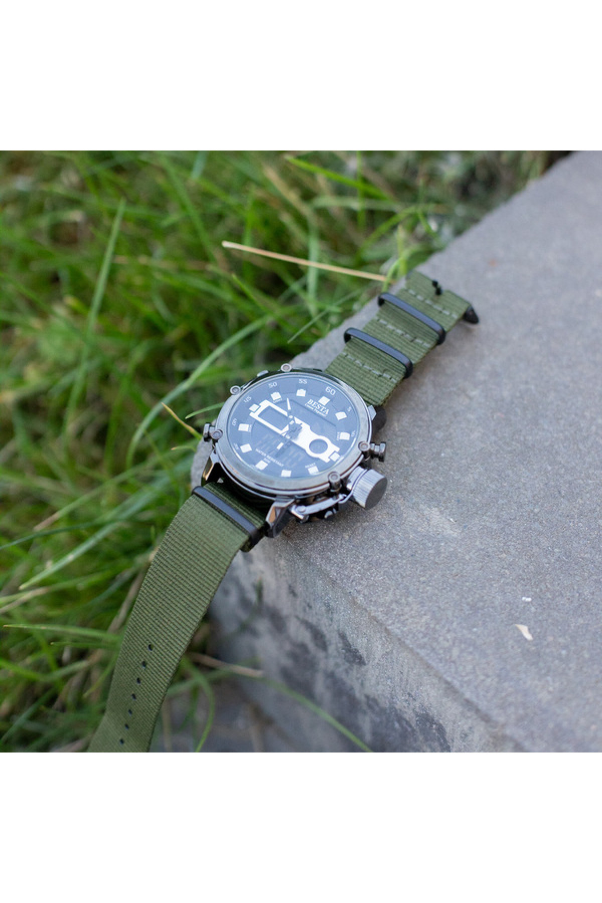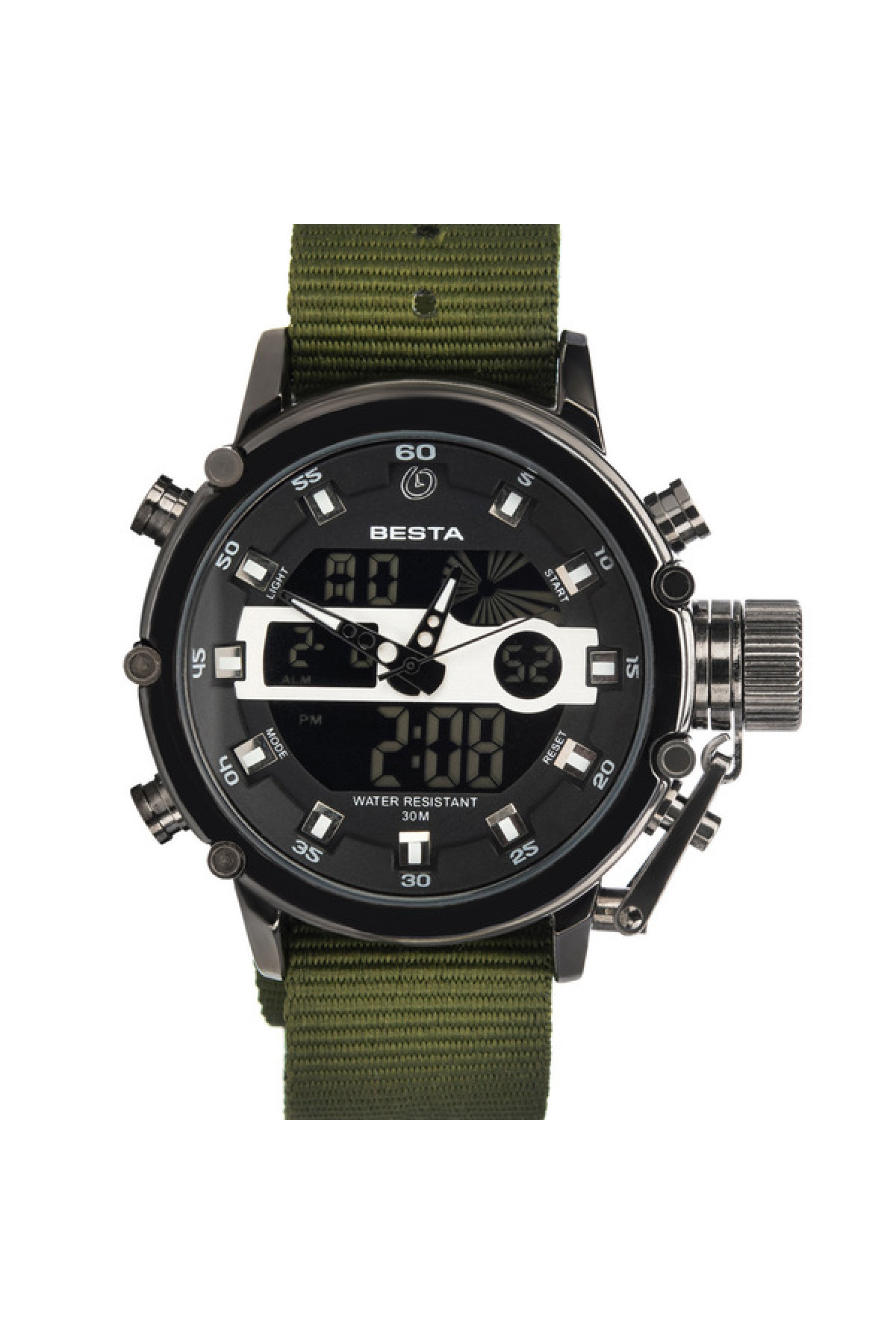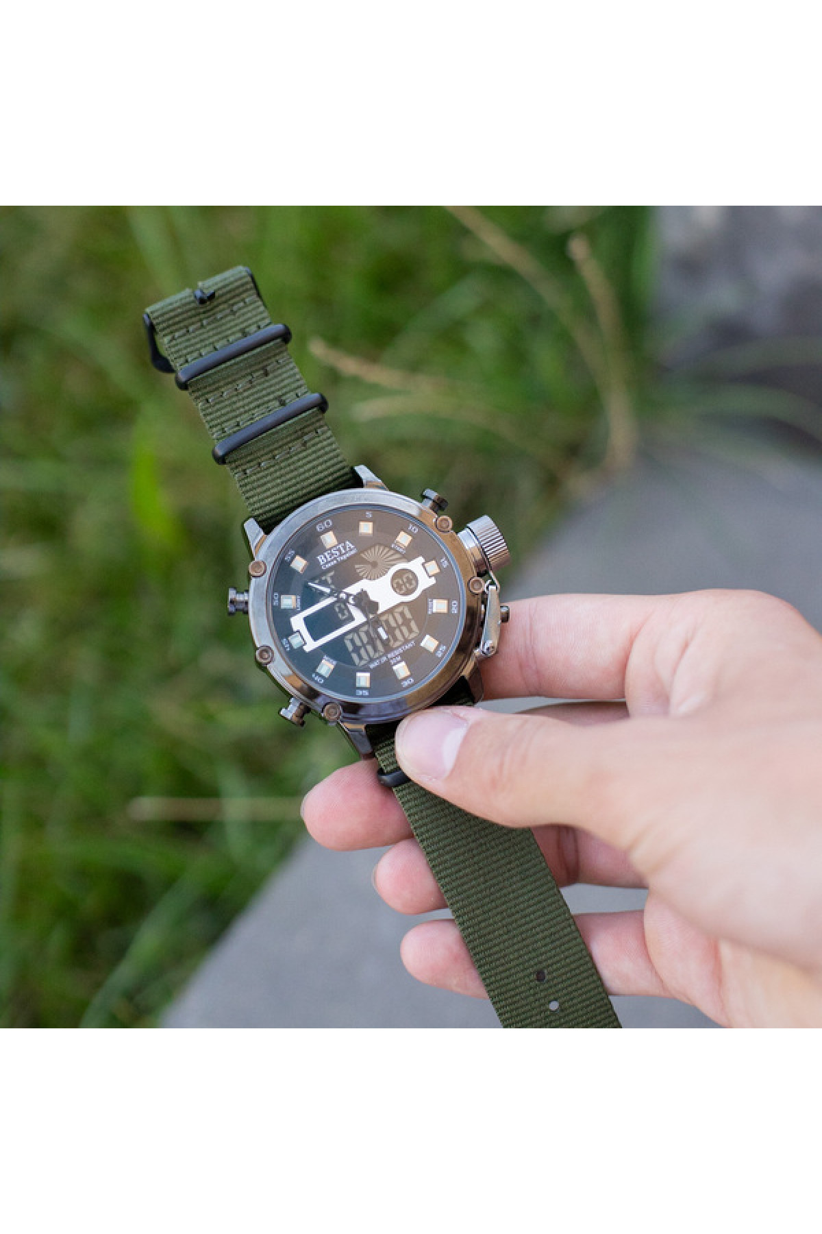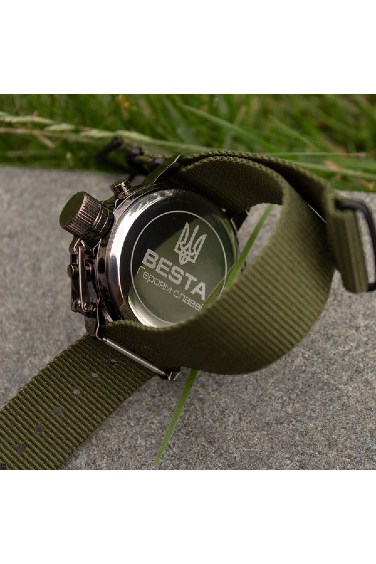 Будильник, підсвічування, секундомір, час показується на циферблаті й стрілками, дата, день тижня, місяць