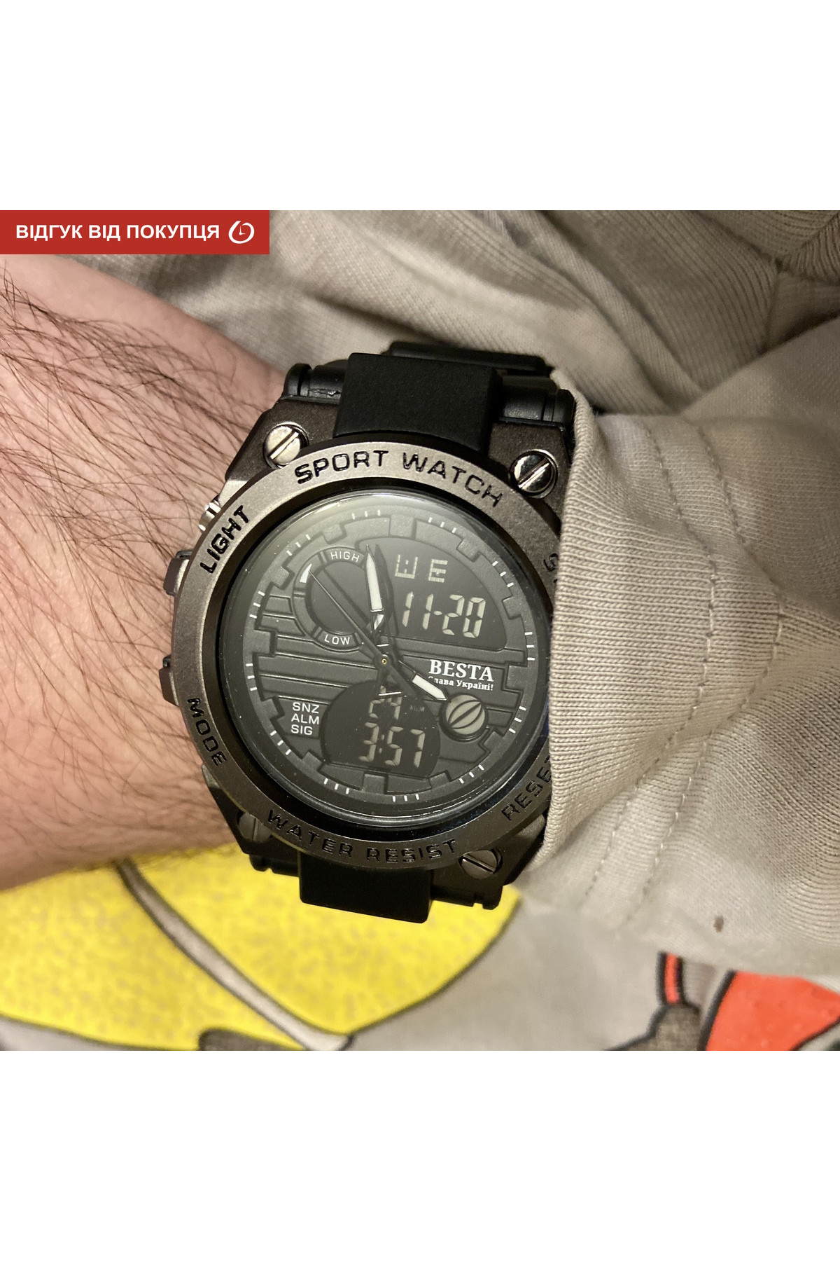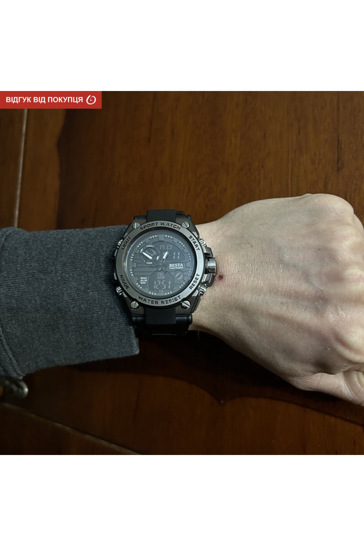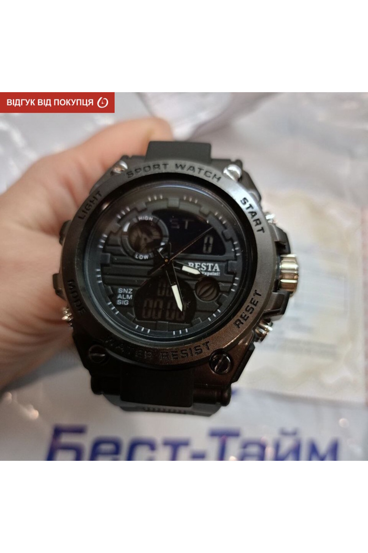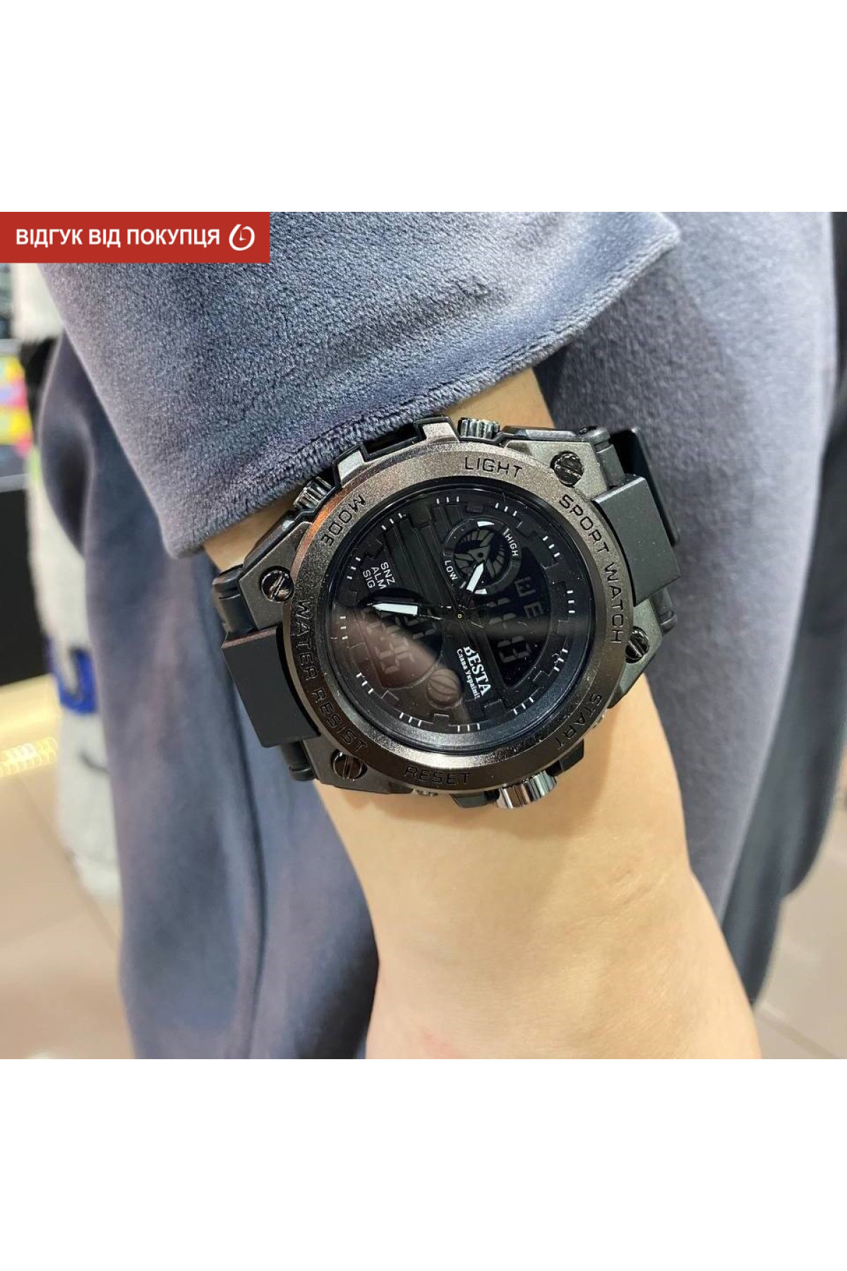 Секундомір, будильник, підсвічування, час показується на циферблаті й стрілками, дата, день тижня, місяць