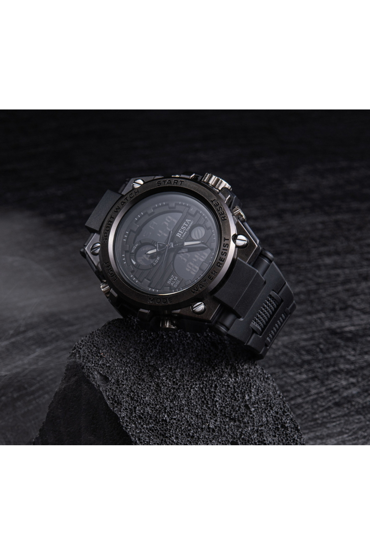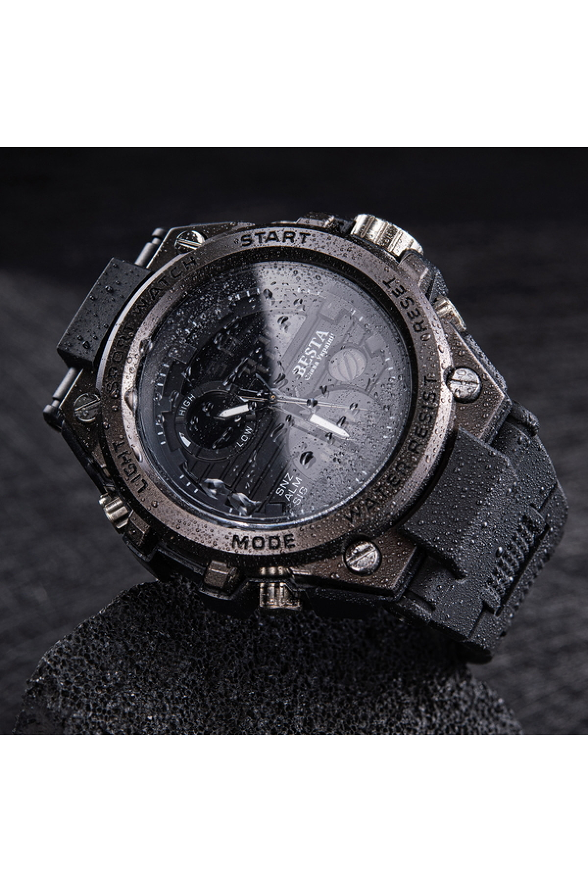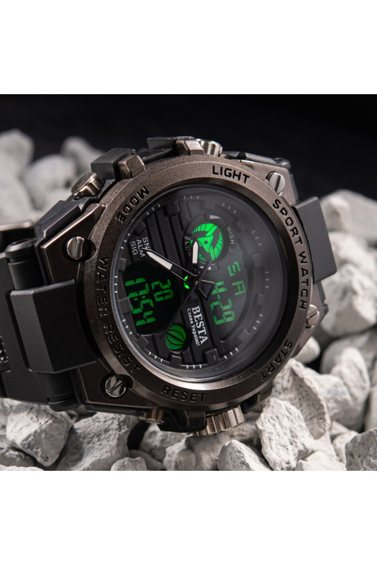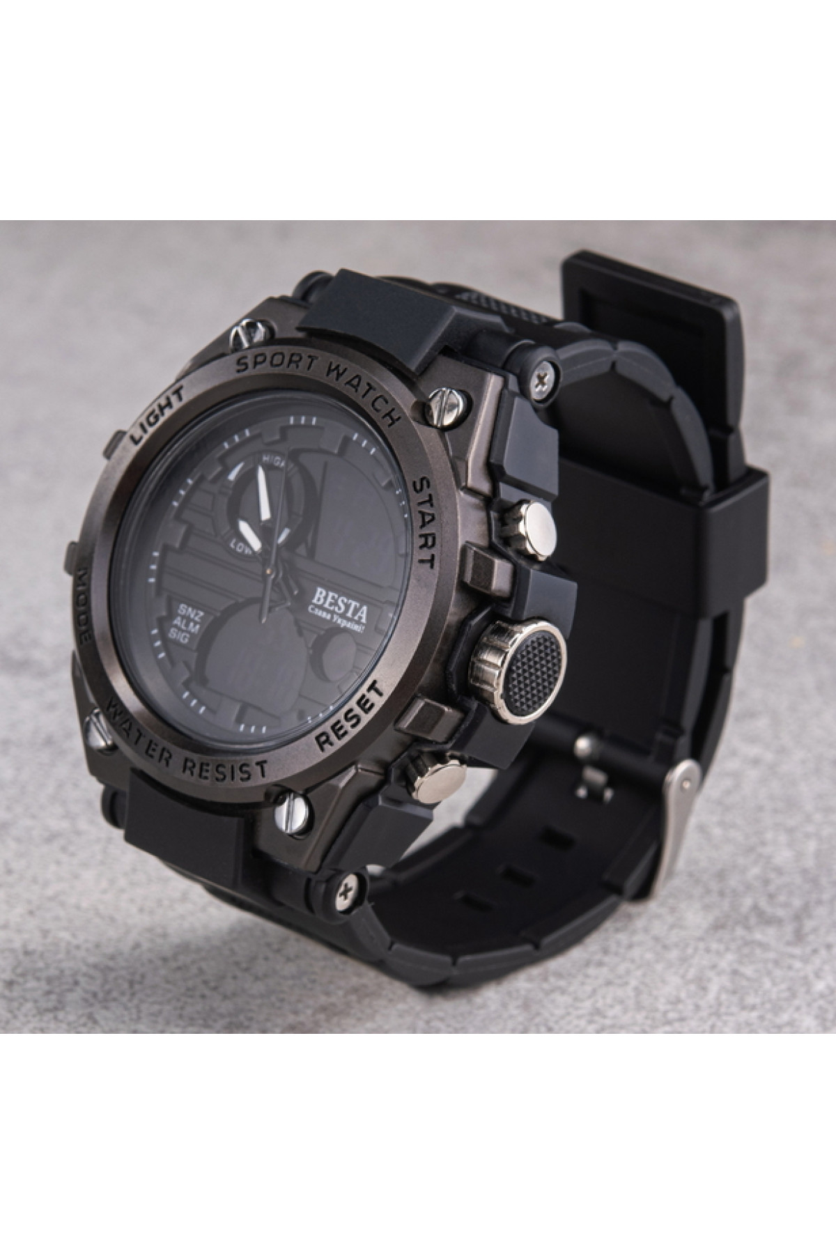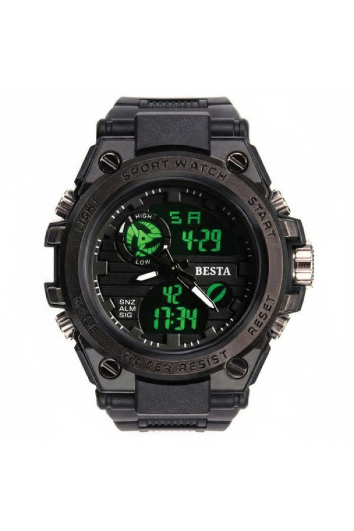 Секундомір, будильник, підсвічування, час показується на циферблаті й стрілками, дата, день тижня, місяць