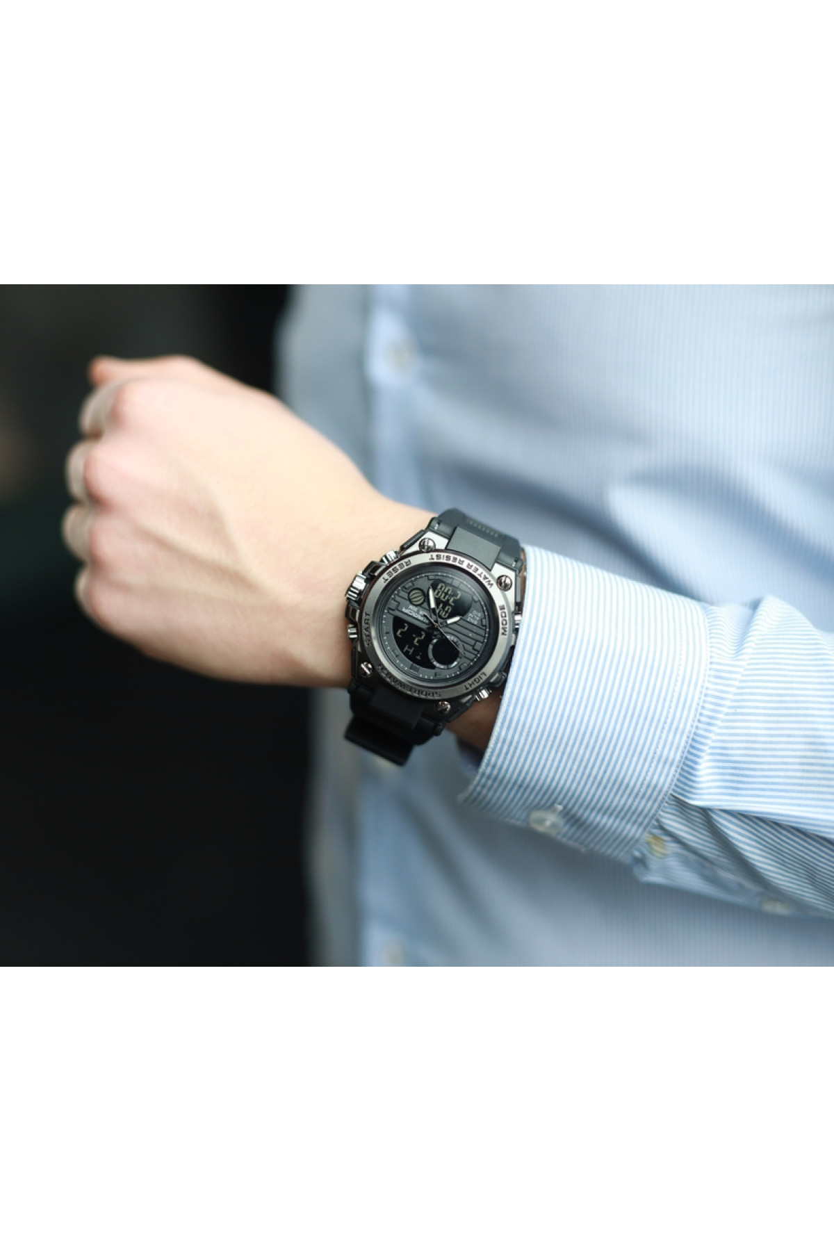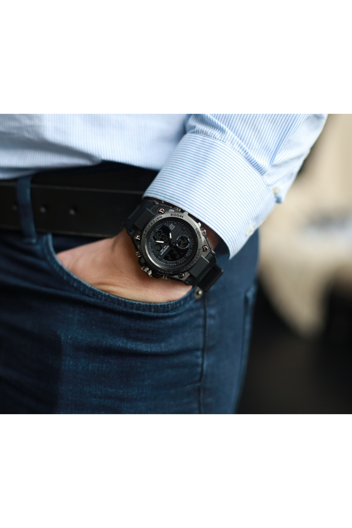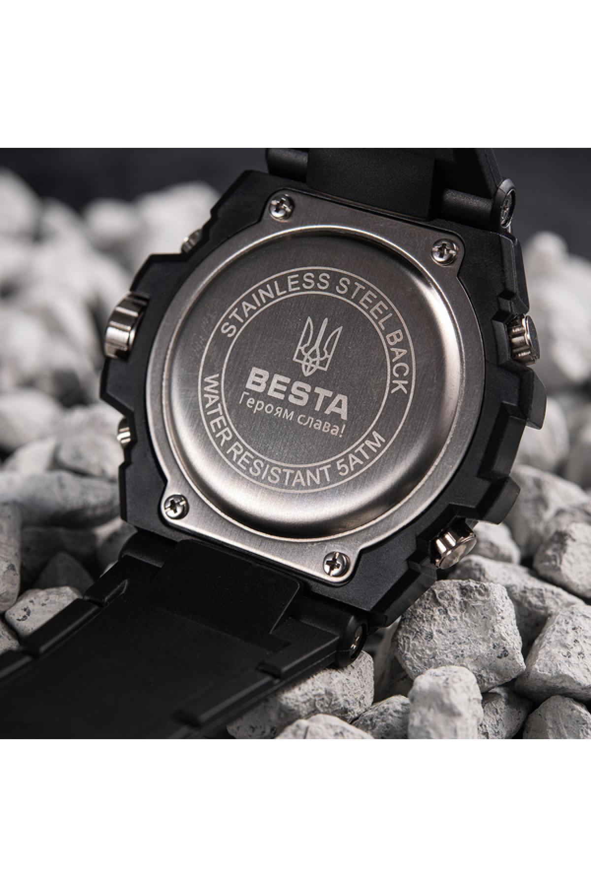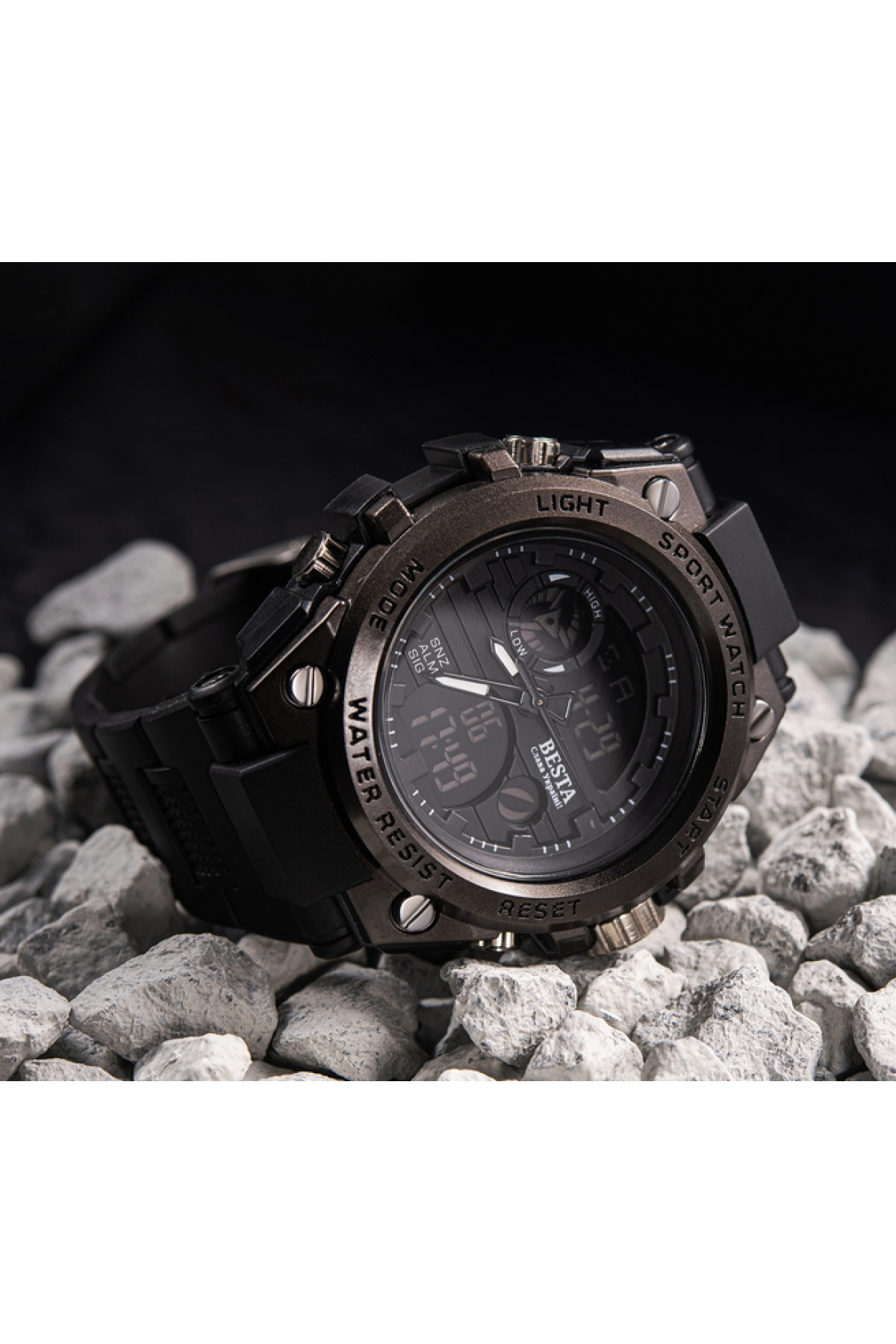 Секундомір, будильник, підсвічування, час показується на циферблаті й стрілками, дата, день тижня, місяць