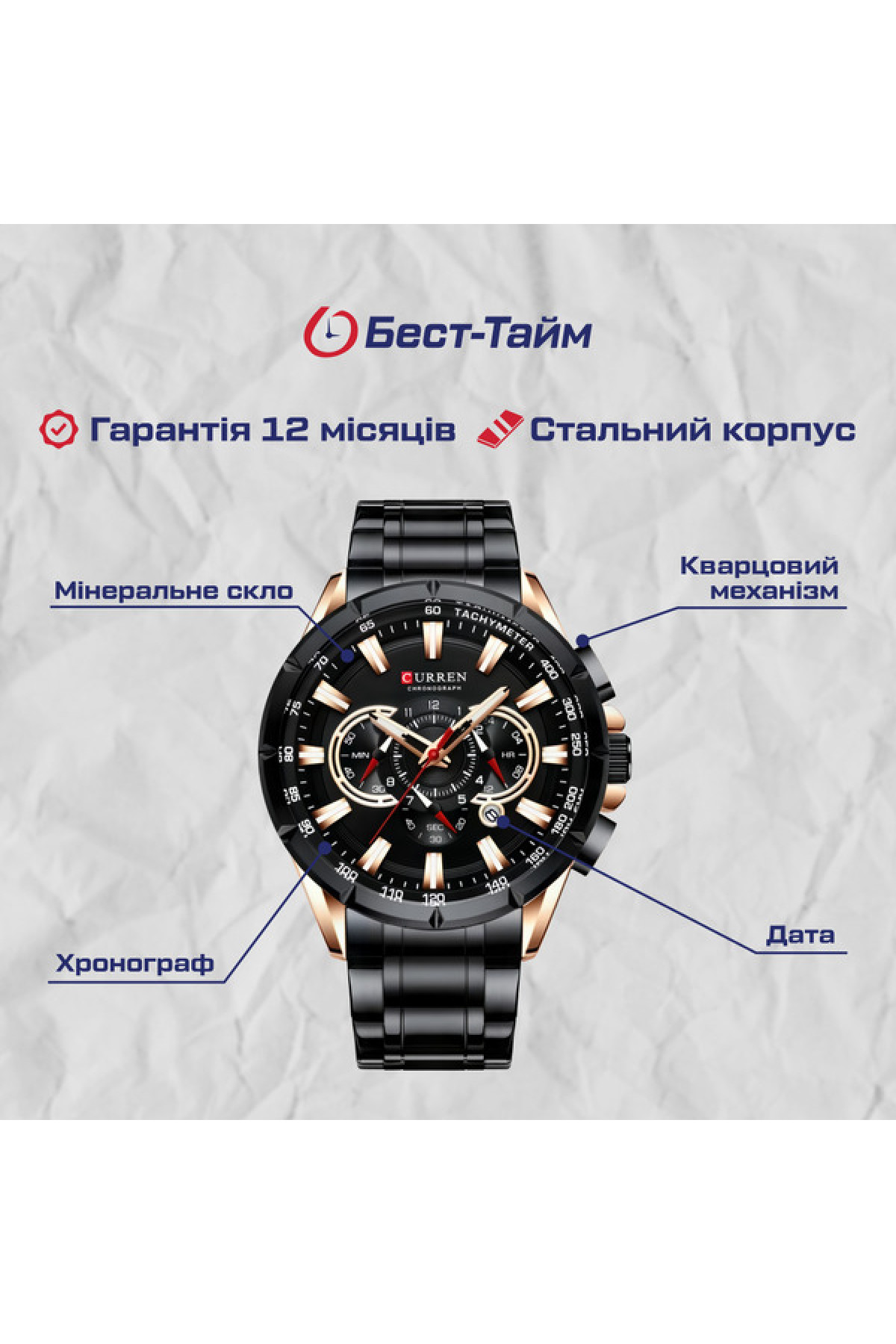 Curren - відомий бренд кварцових годинників, який на ринку з 2001 року. Годинники цього бренду відрізняються не тільки стильним дизайном, але й високою якістю збірки, що забезпечує їх надійність і довговічність.Ці годинники стануть відмінним доповненням до будь-якого стилю одягу. Будь-то формальний одяг чи спортивний стиль, годинники Curren підкреслять вашу індивідуальність та зроблять вас помітним серед натовпу.Однак, крім свого естетичного вигляду, годинники Curren також гарантують точний хід. Завдяки надійному кварцовому механізму, вони будуть надійно показувати час протягом тривалого періоду.Загалом, годинники Curren поєднують в собі якість, дизайн й функціональність, що робить їх відмінним вибором для всіх, хто цінує стиль і якість годинників.В комплекті йде офіційна гарантія на 12 місяців.