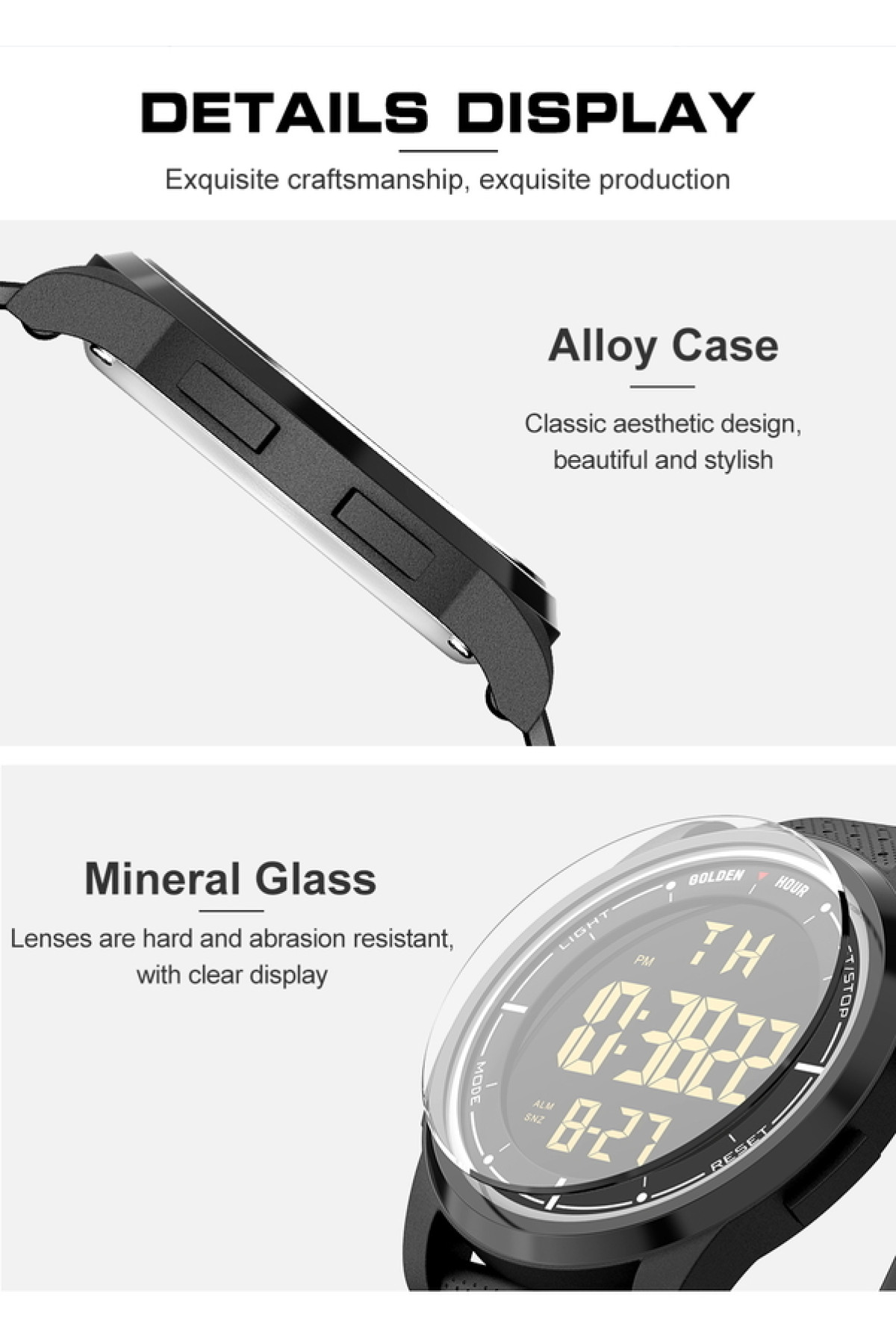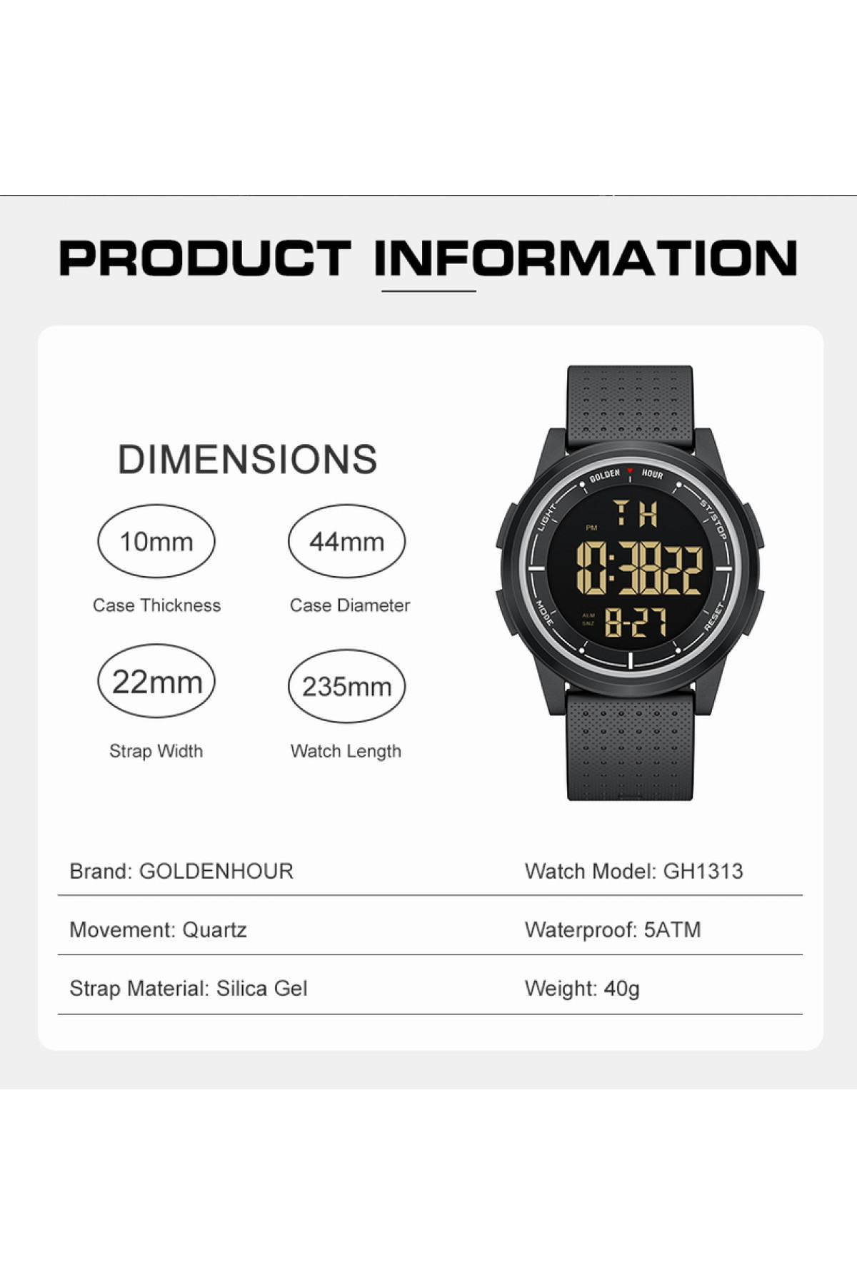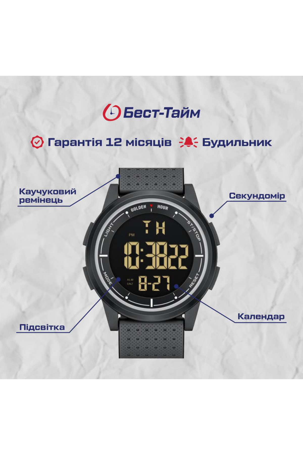 Будильник, підсвічування, секундомір, дата, день тижня, місяць