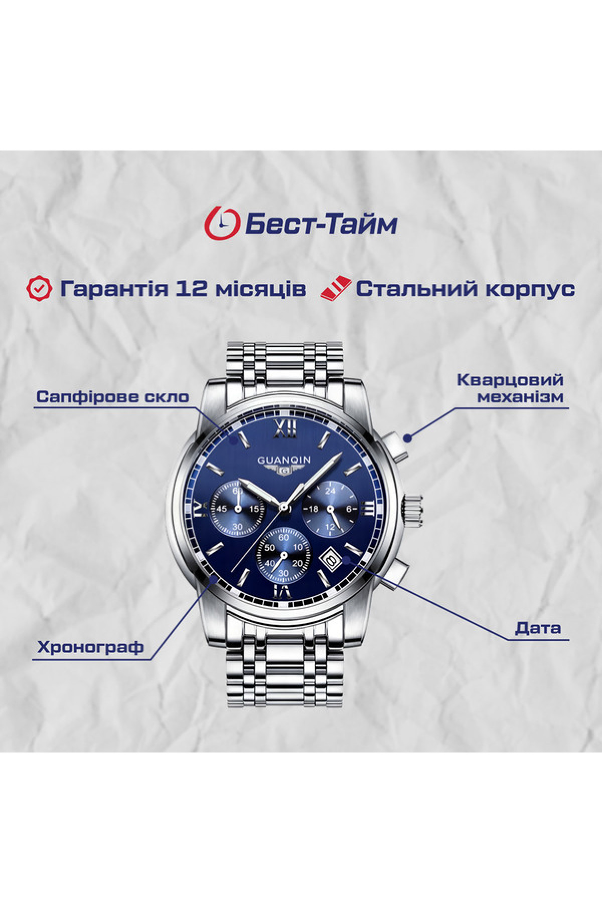 Хронограф, секундомір, дата, час по 24 - й шкалі