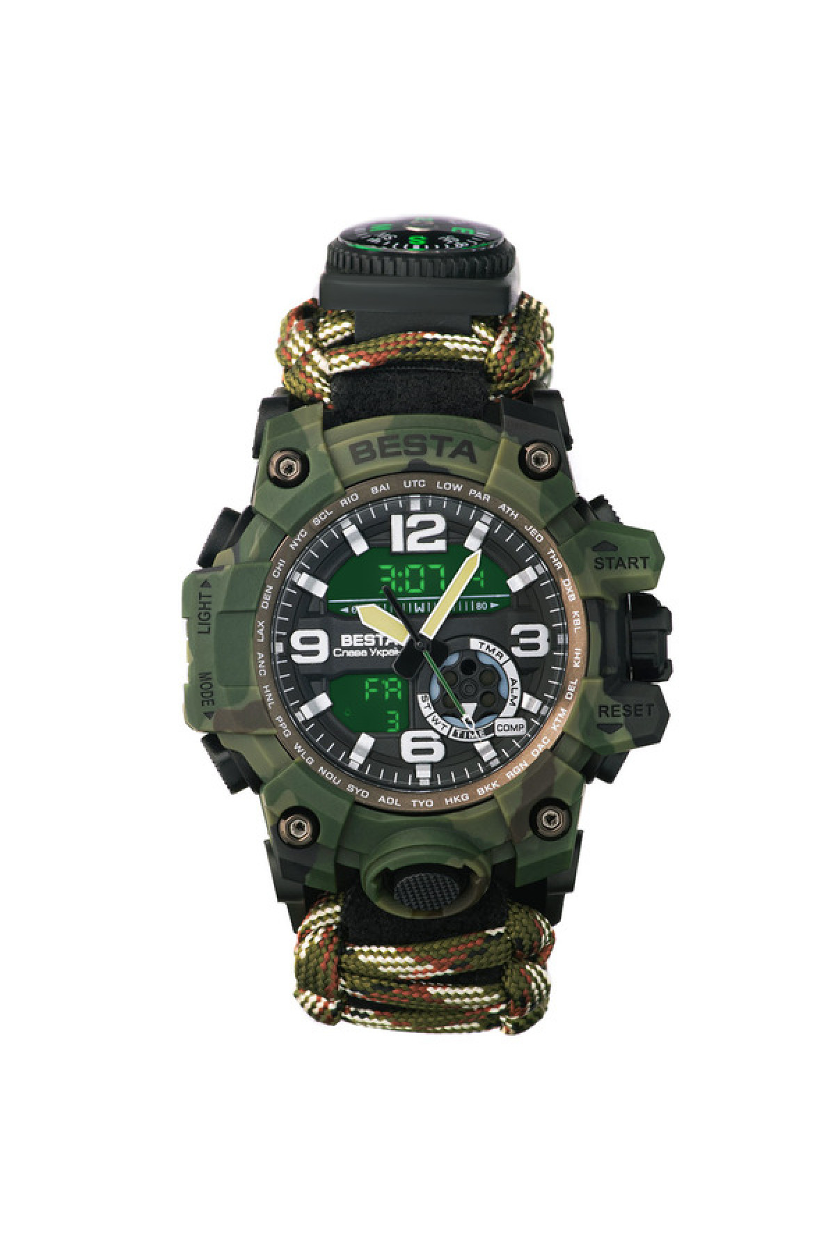 Компас, будильник, секундомір, подвійний час, тактична застібка, підсвічування, 2 батарейки