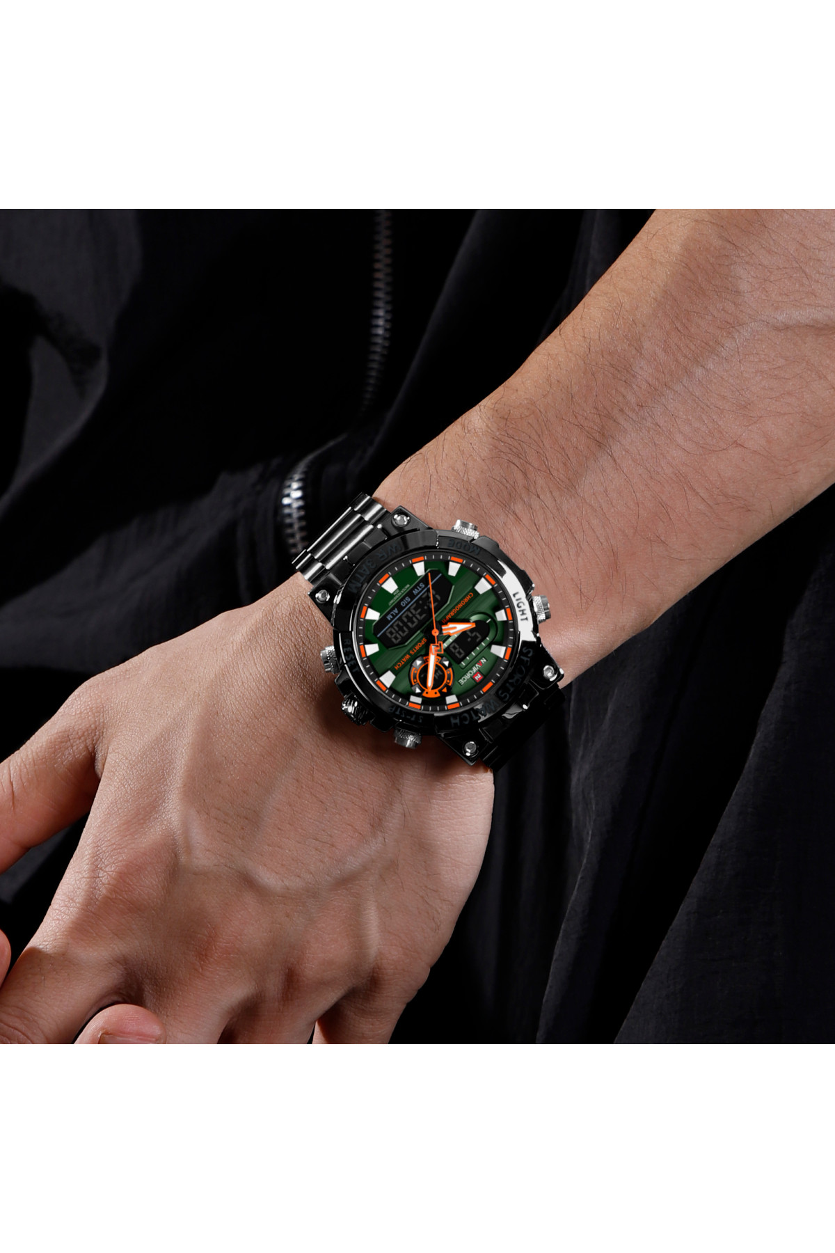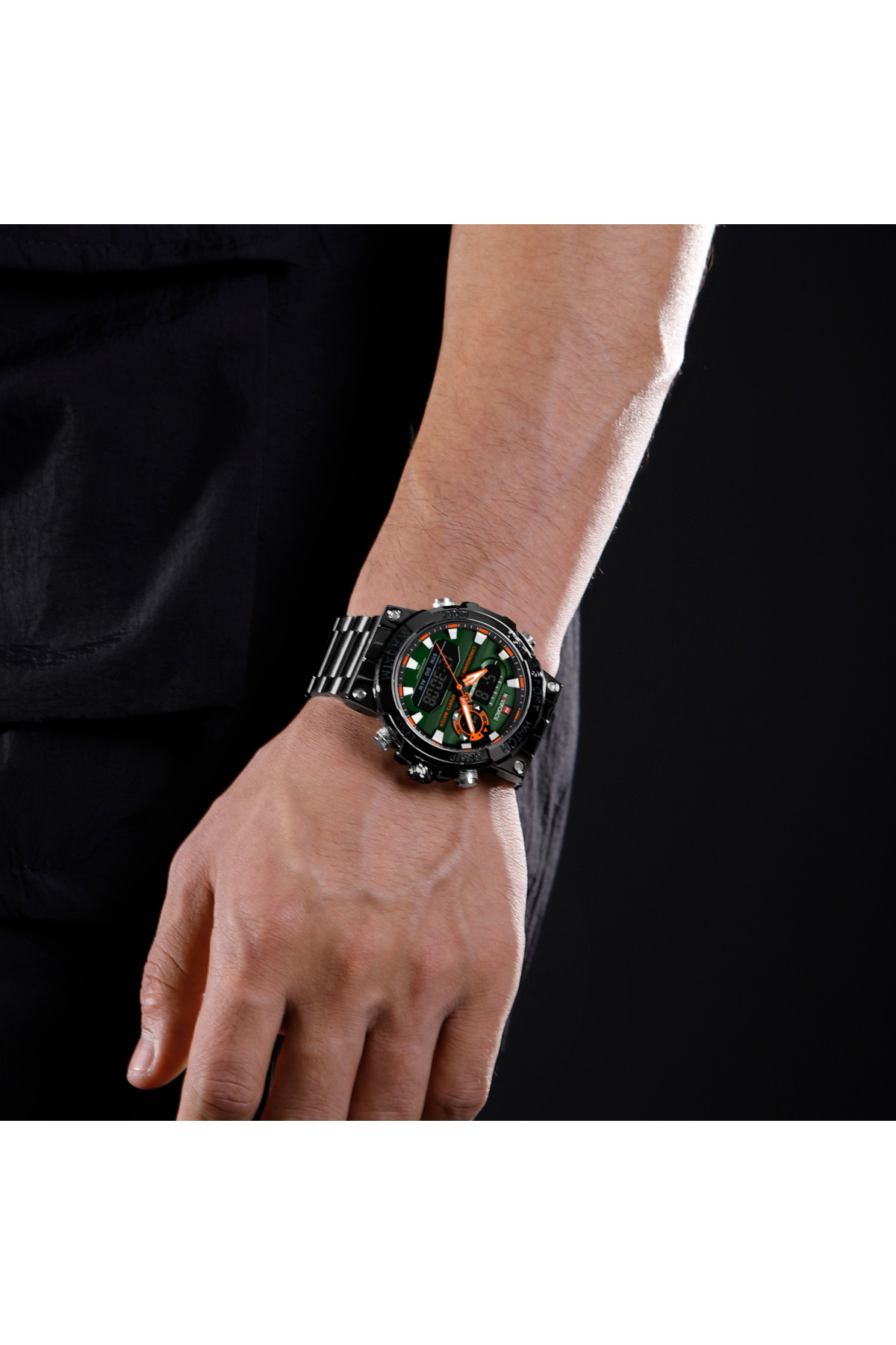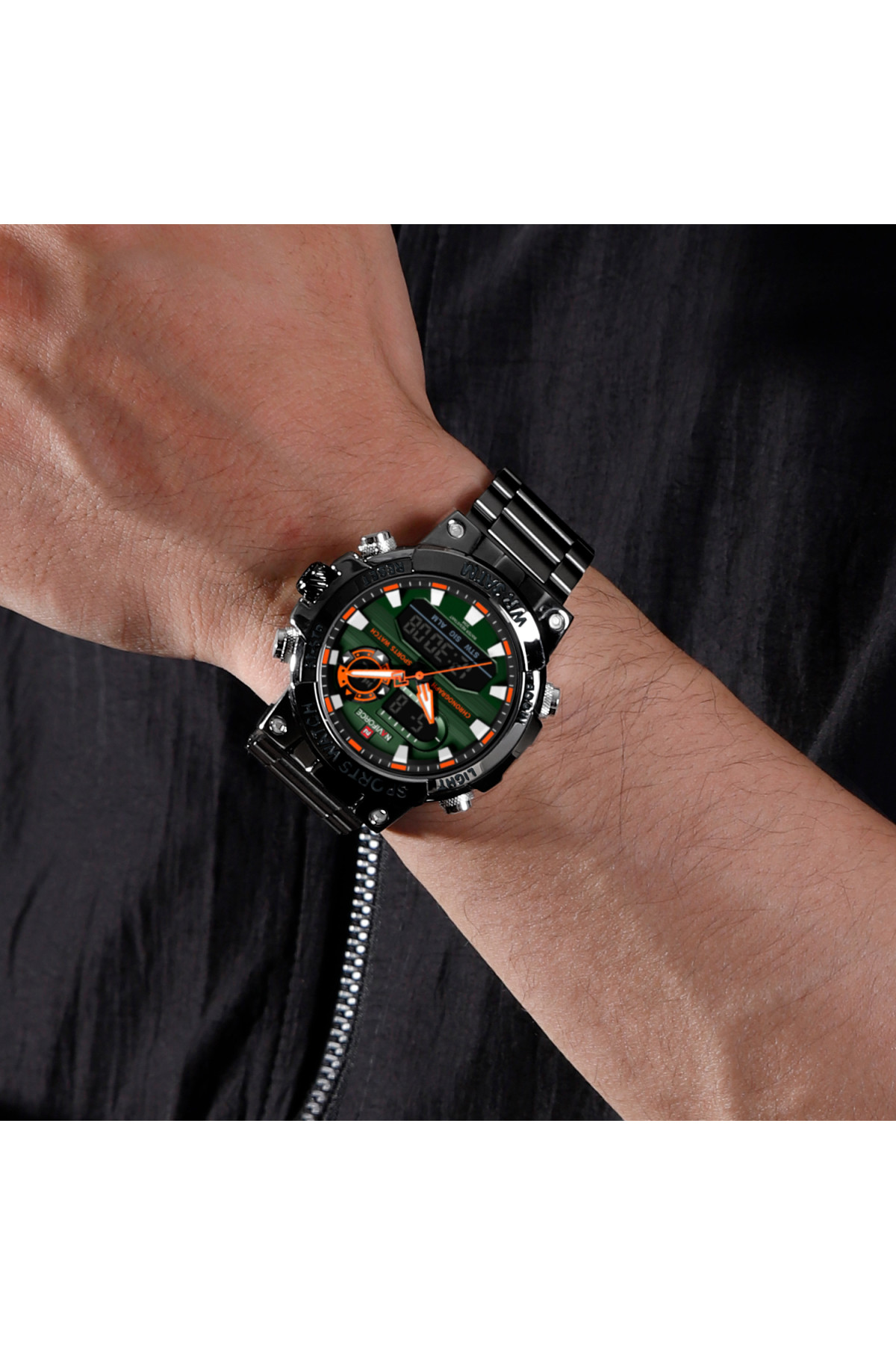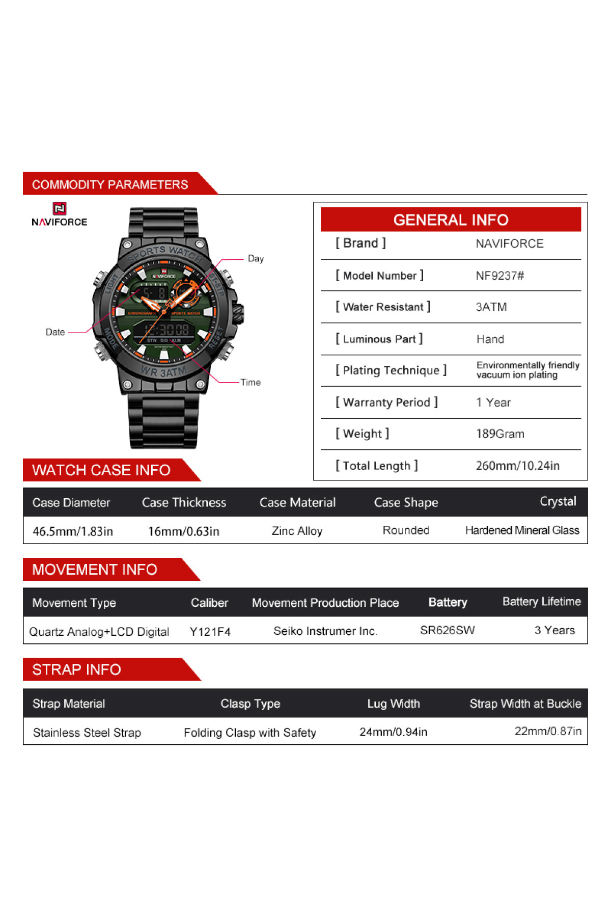 Таймер, будильник, підсвічування, секундомір, час показується на циферблаті й стрілками, дата, день тижня, місяць, другий час (Dual Time)