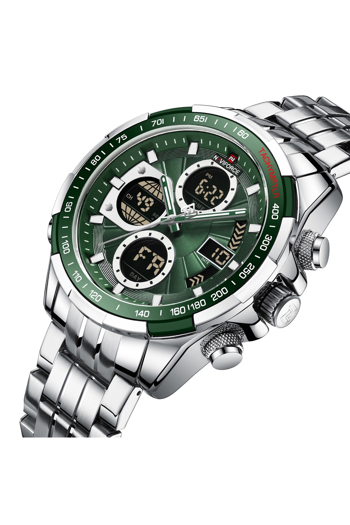 Будильник, підсвічування, секундомір, час показується на циферблаті та стрілками, дата, день тижня, місяць, таймер, другий час (Dual Time)