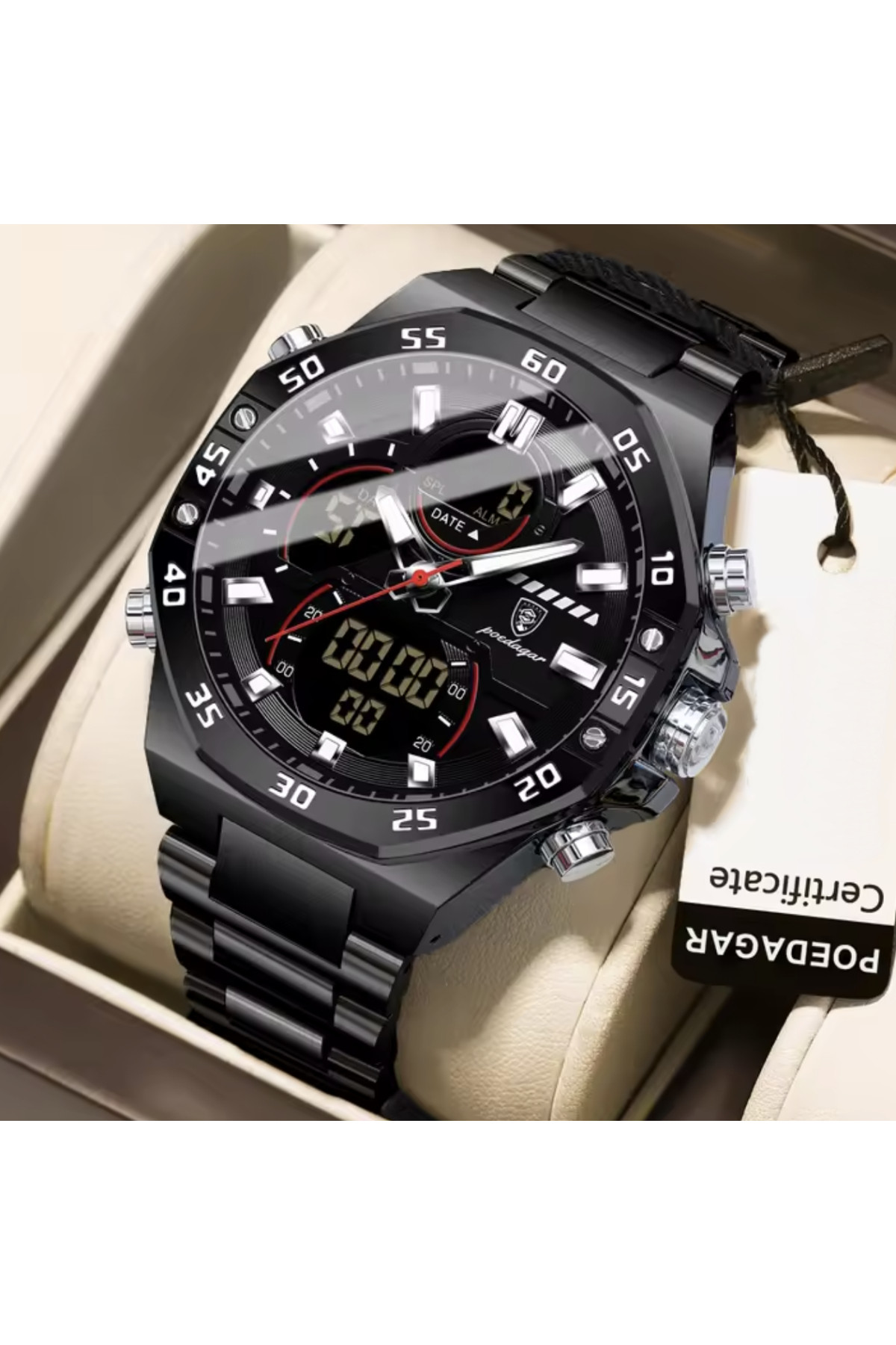 Секундомір, таймер, будильник, підсвічування, час показується на циферблаті й стрілками, дата, день тижня, місяць