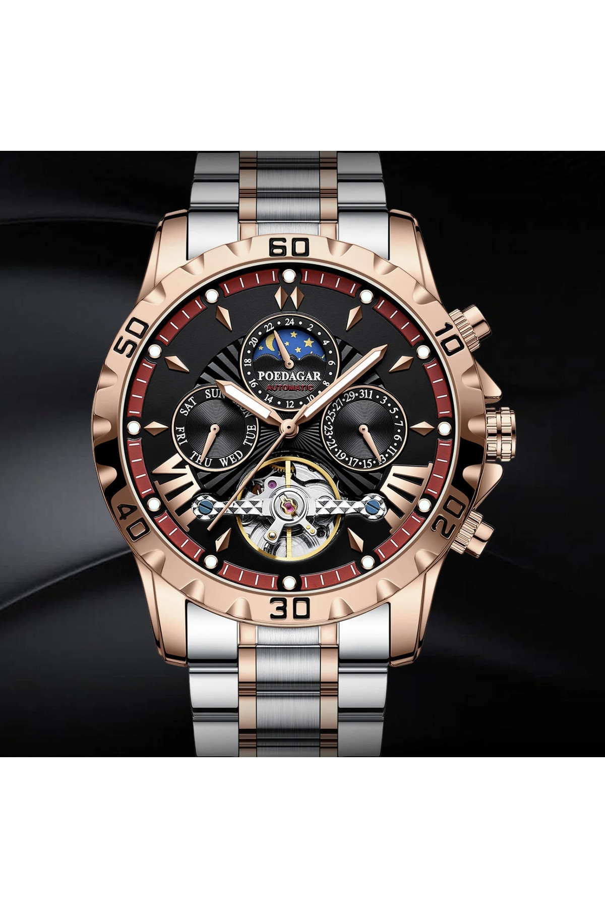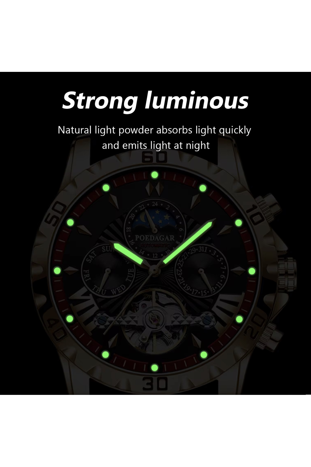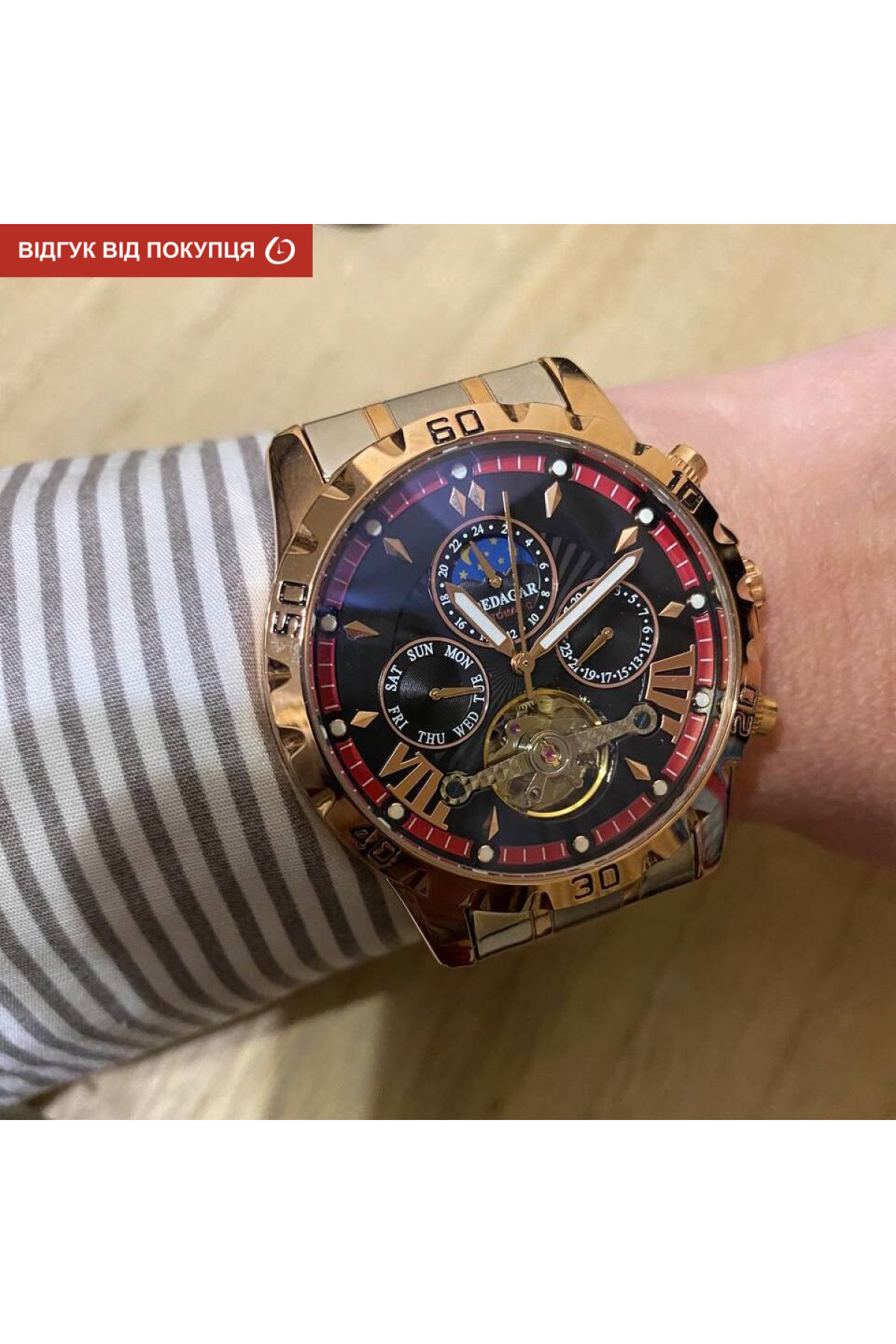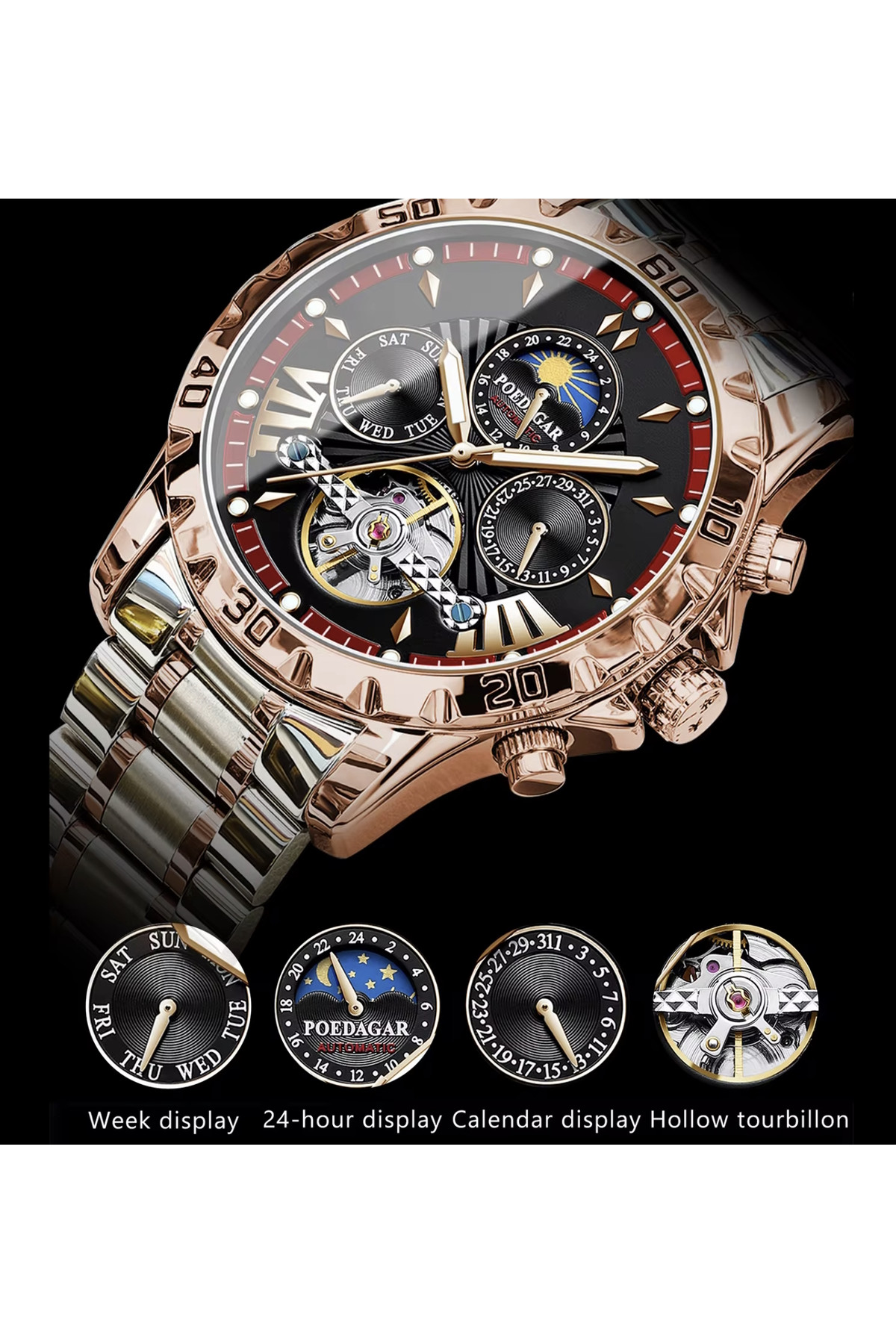 Показують дату, день тижня, місяць, маятник «Турбілліон», система "День-Ніч".