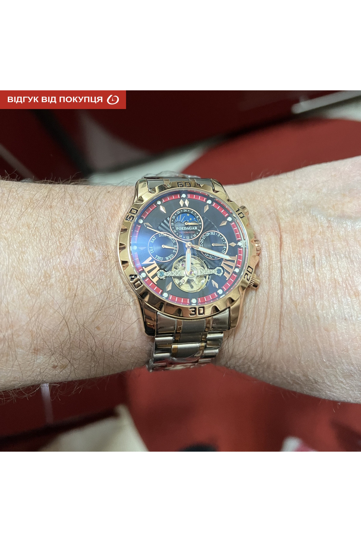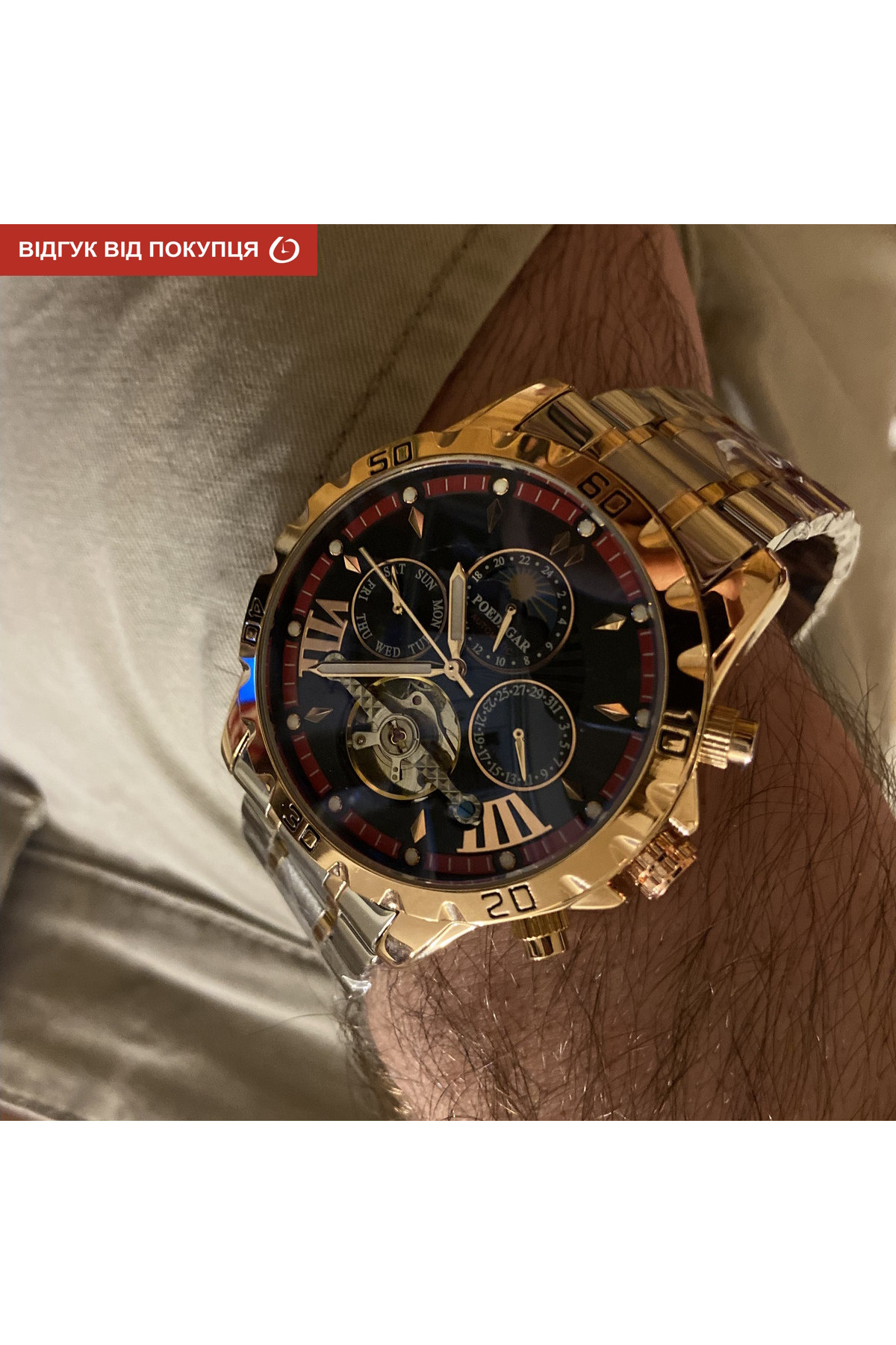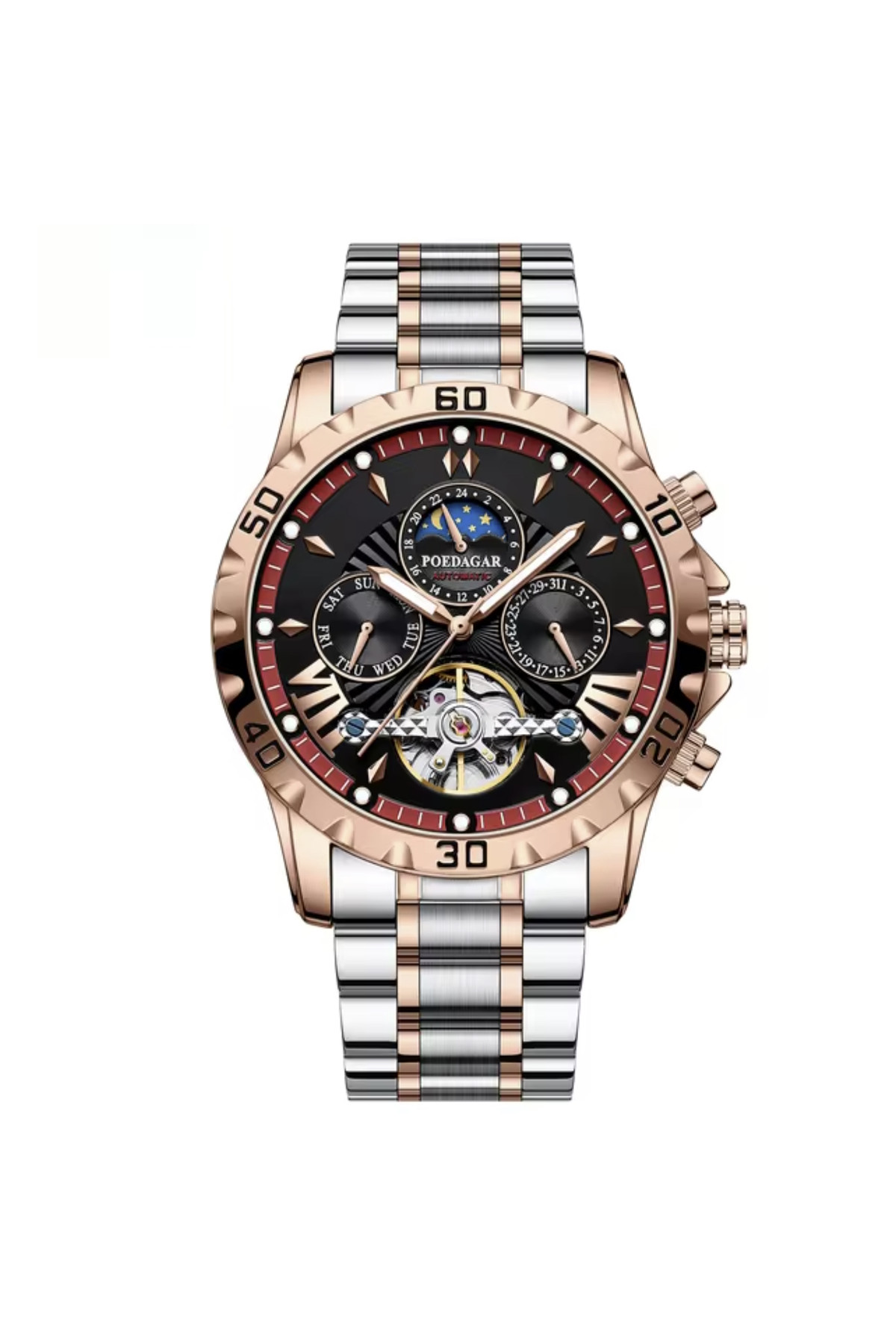Показують дату, день тижня, місяць, маятник «Турбілліон», система "День-Ніч".
