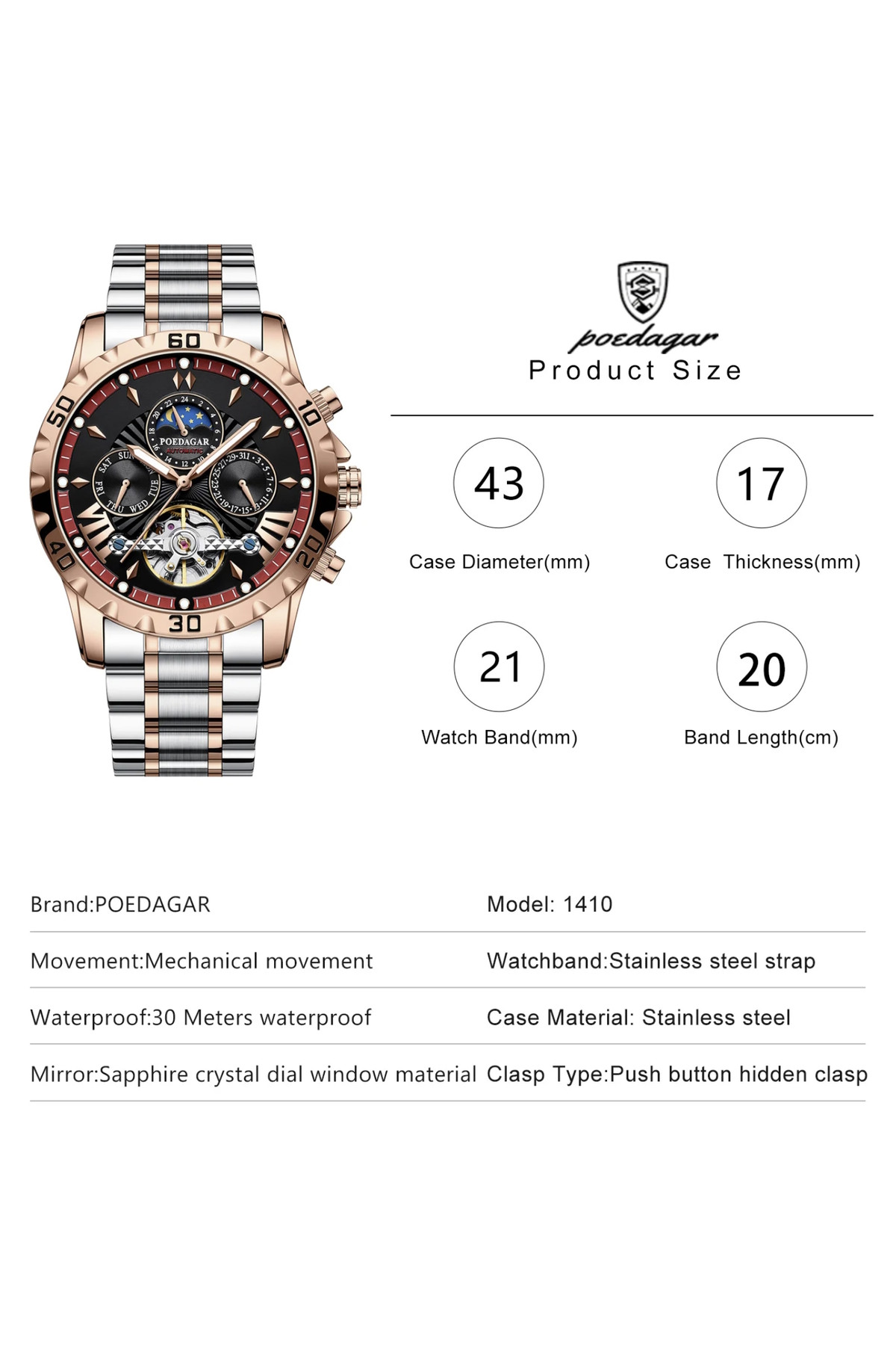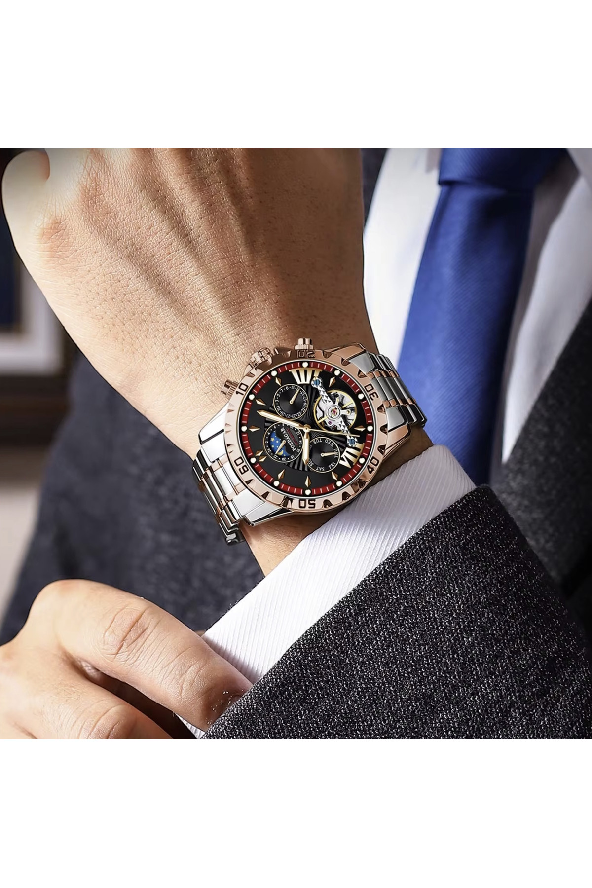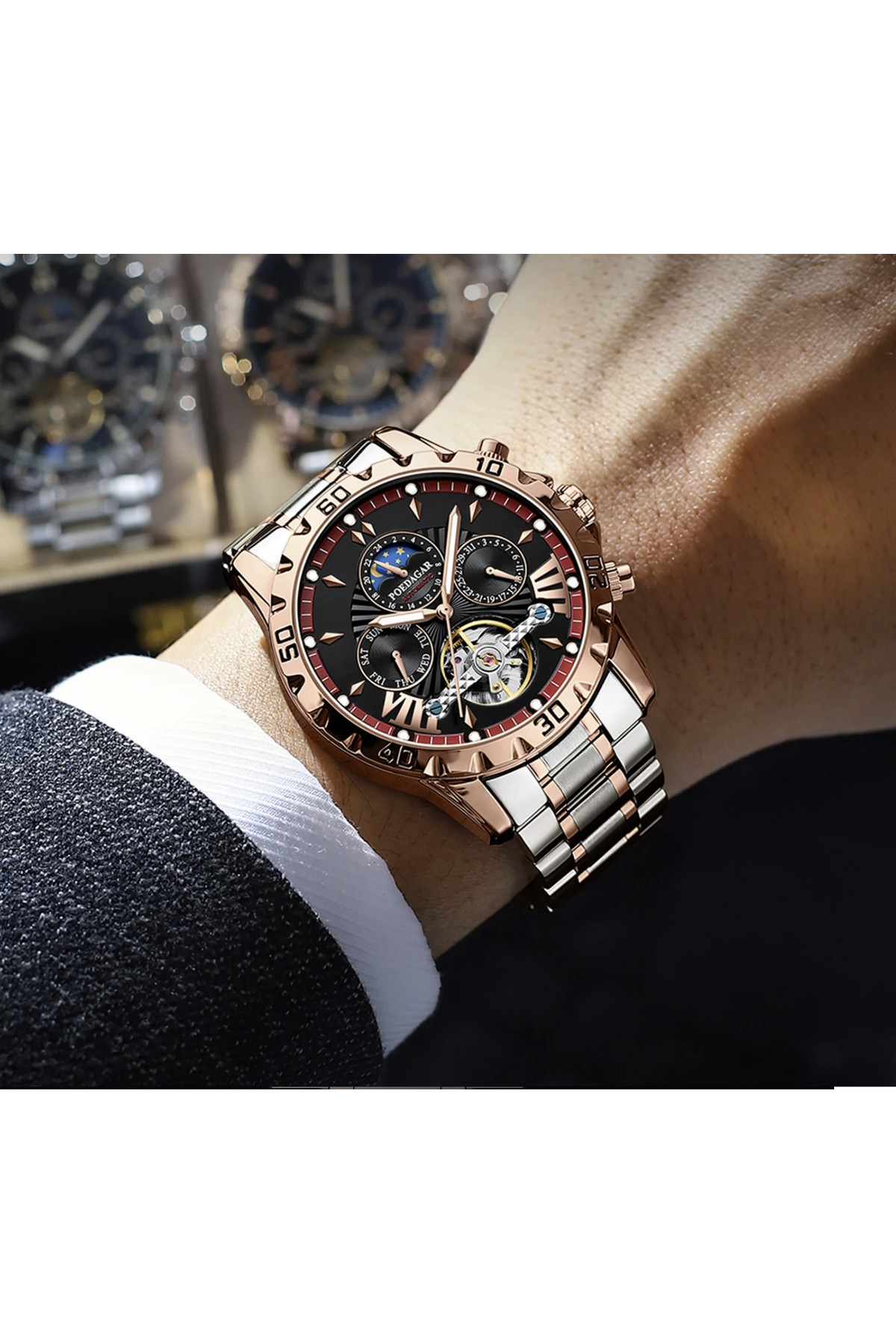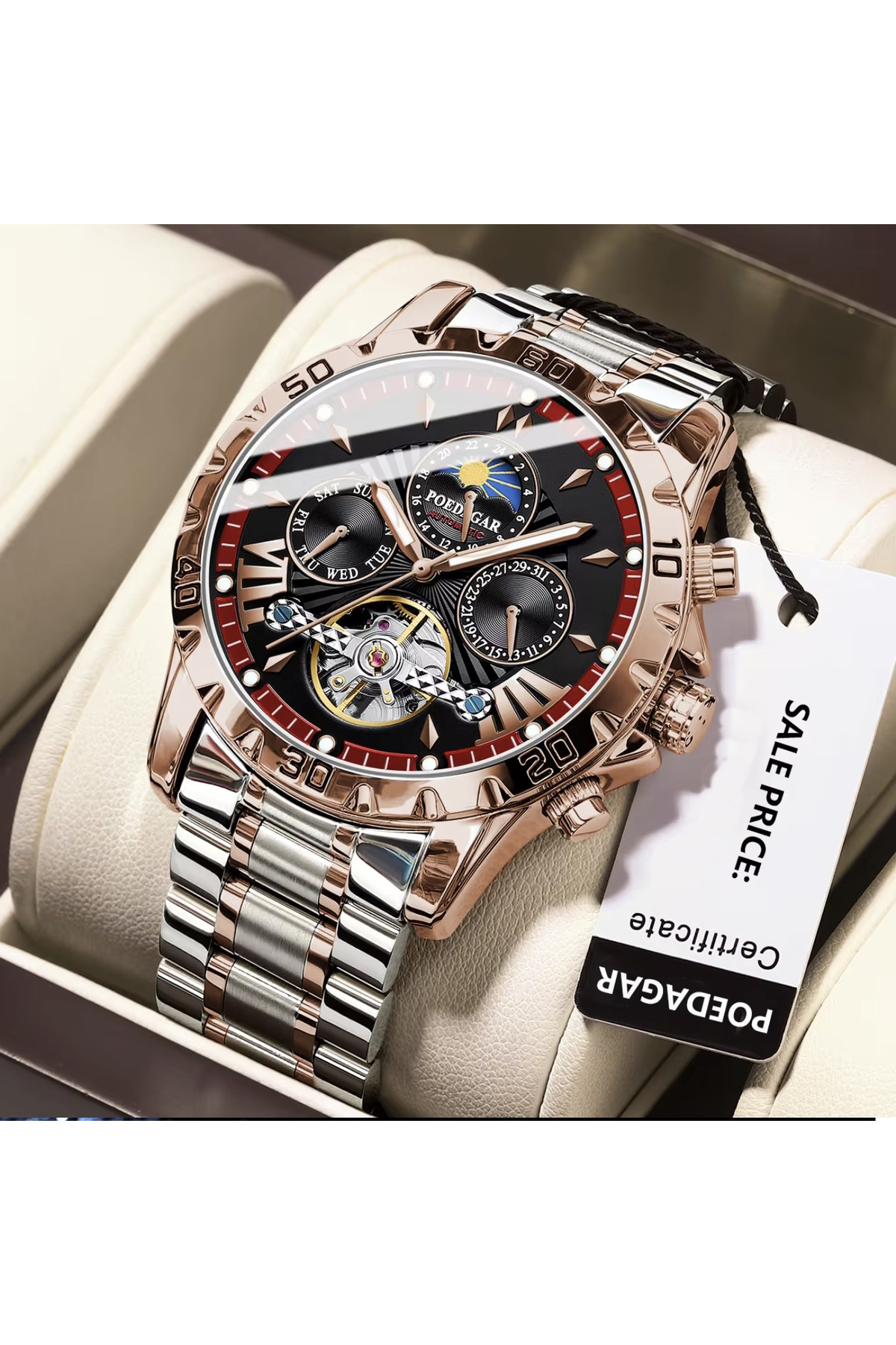 Показують дату, день тижня, місяць, маятник «Турбілліон», система "День-Ніч".