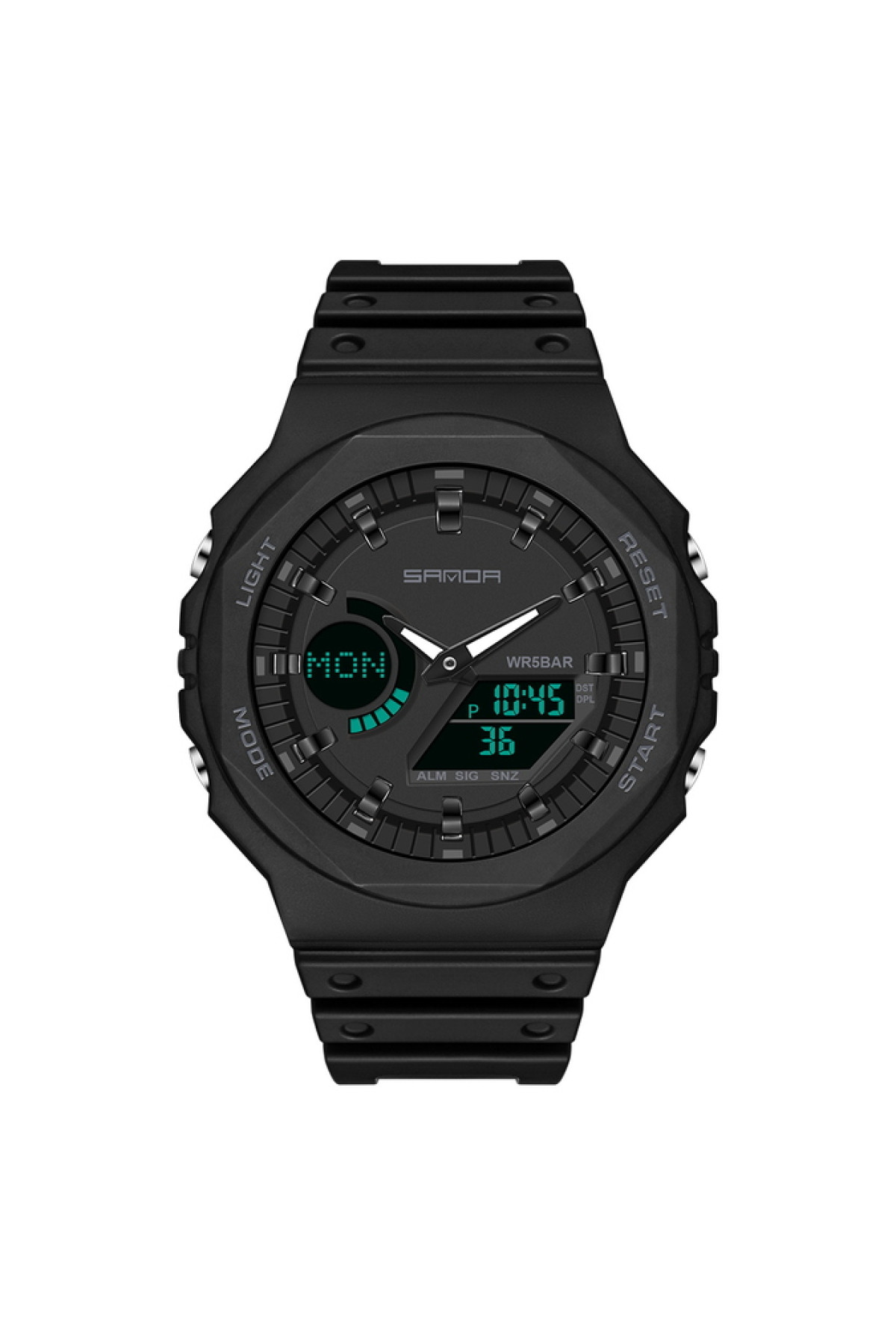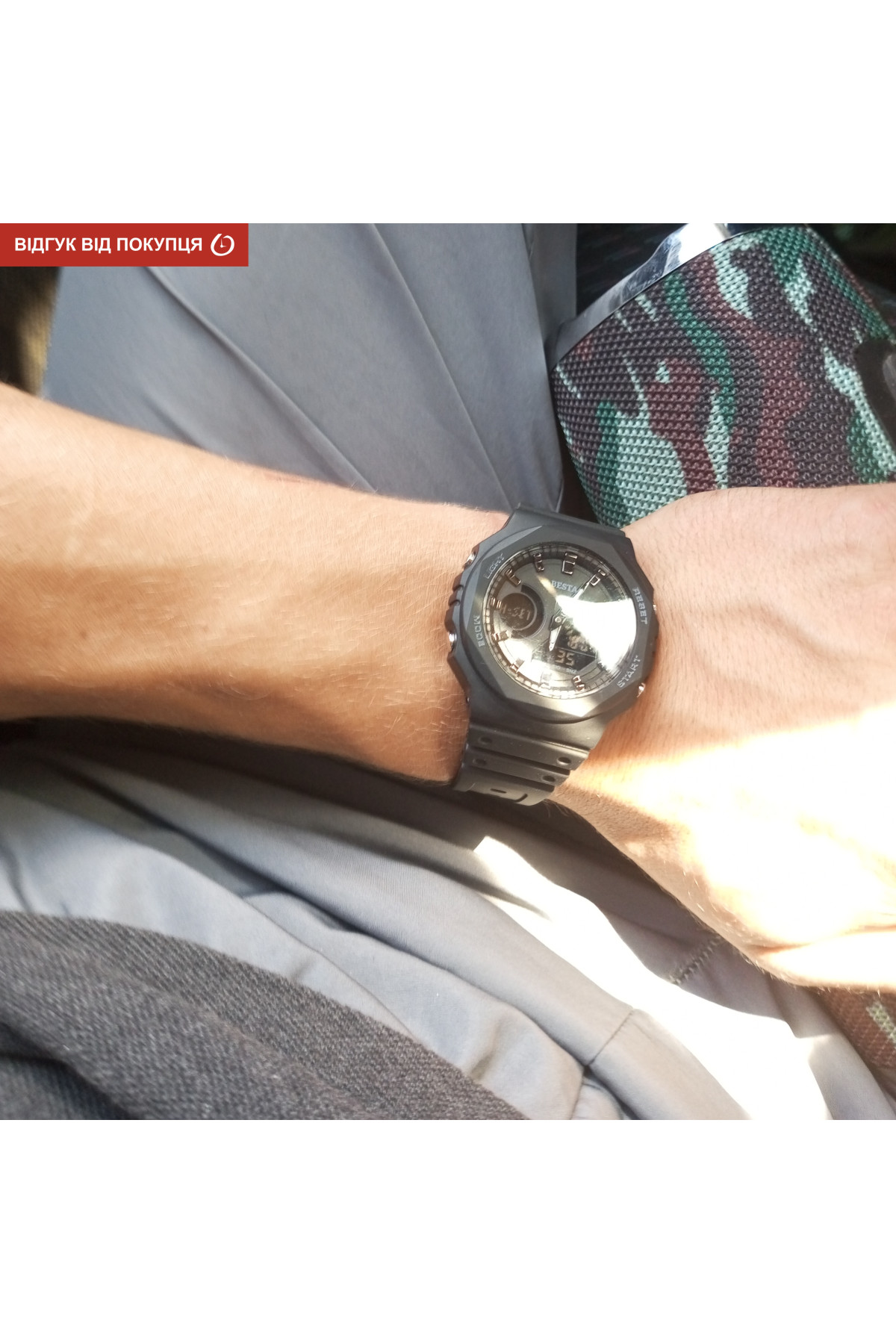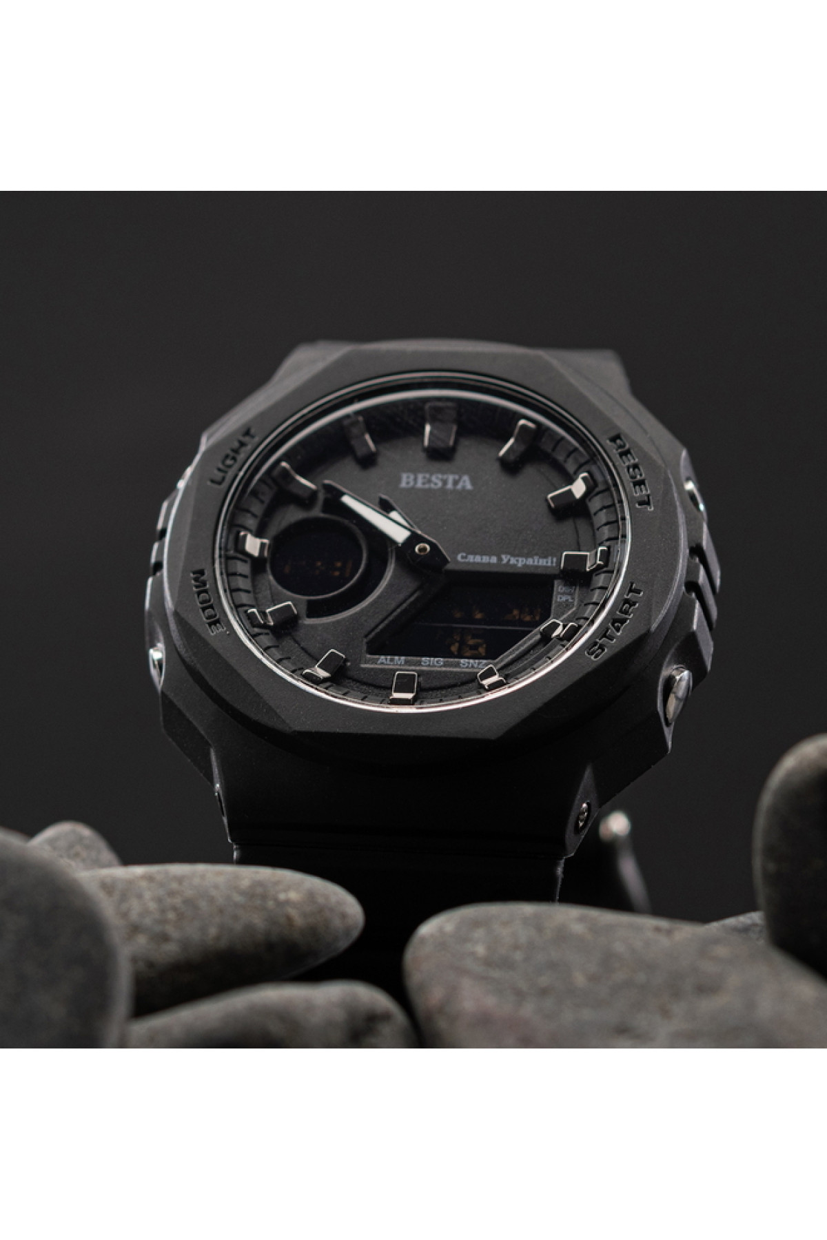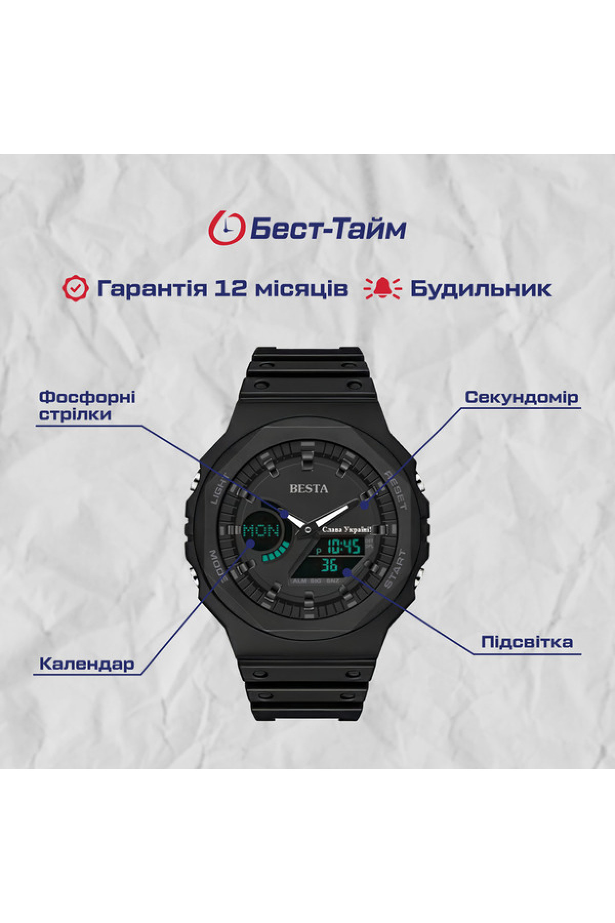 Секундомір, будильник, підсвічування, час показується на циферблаті і стрілками, дата, день тижня, місяць