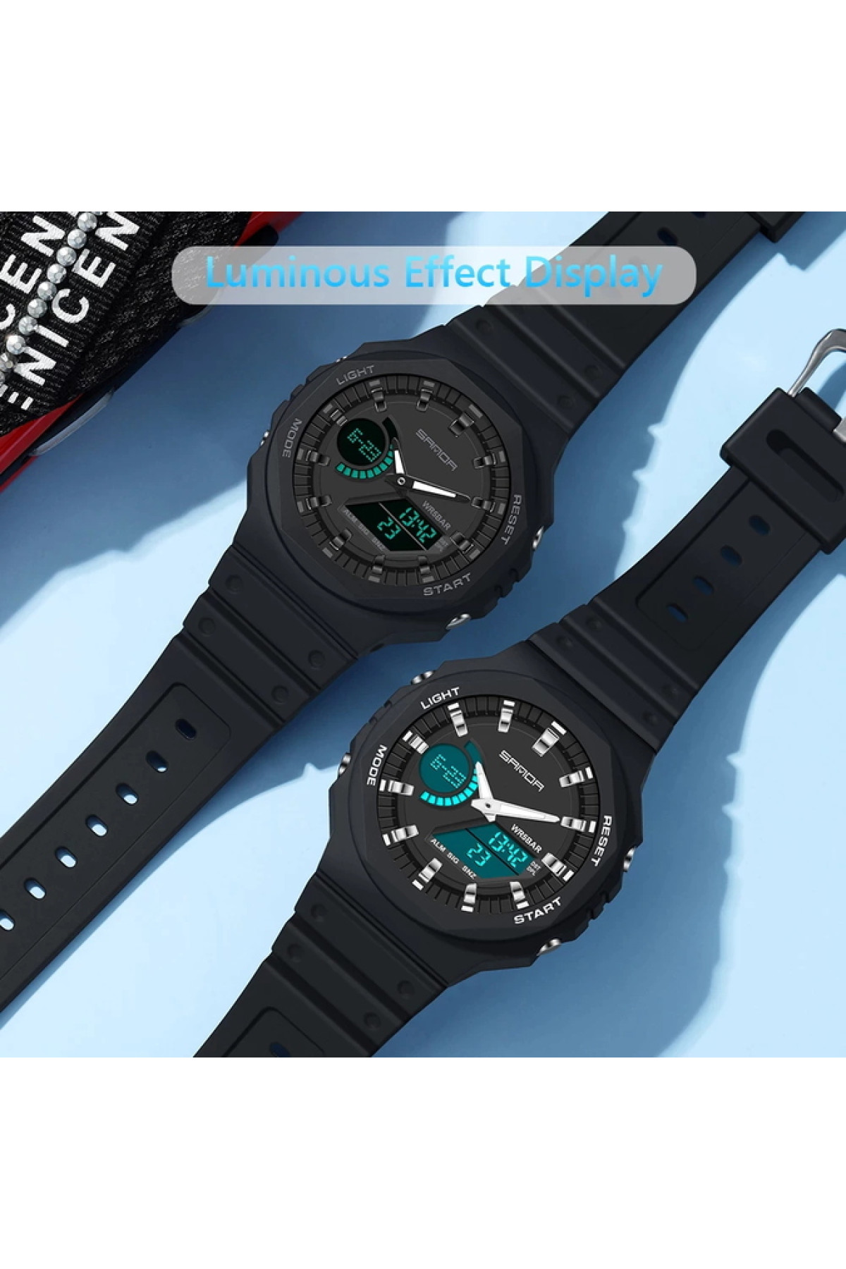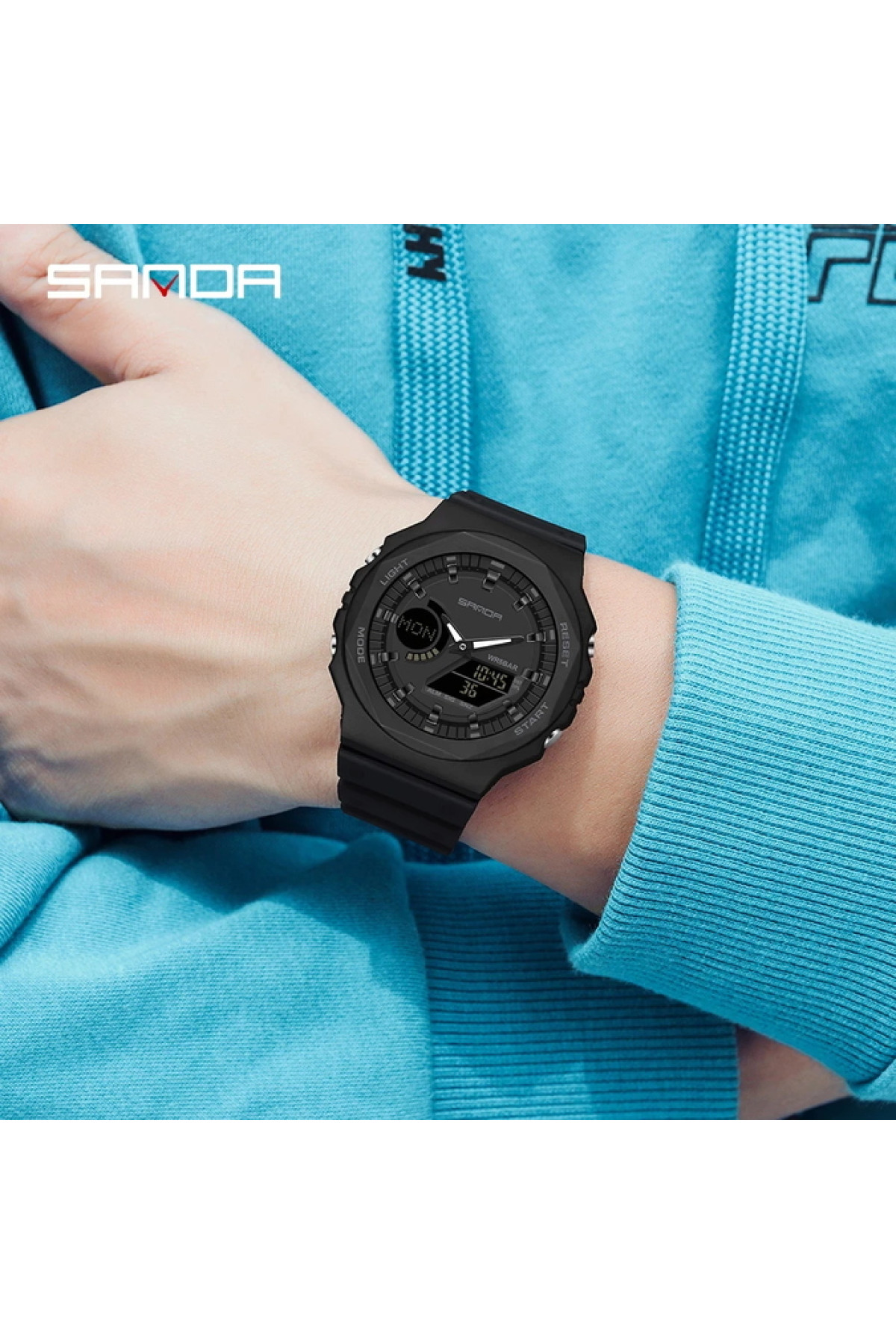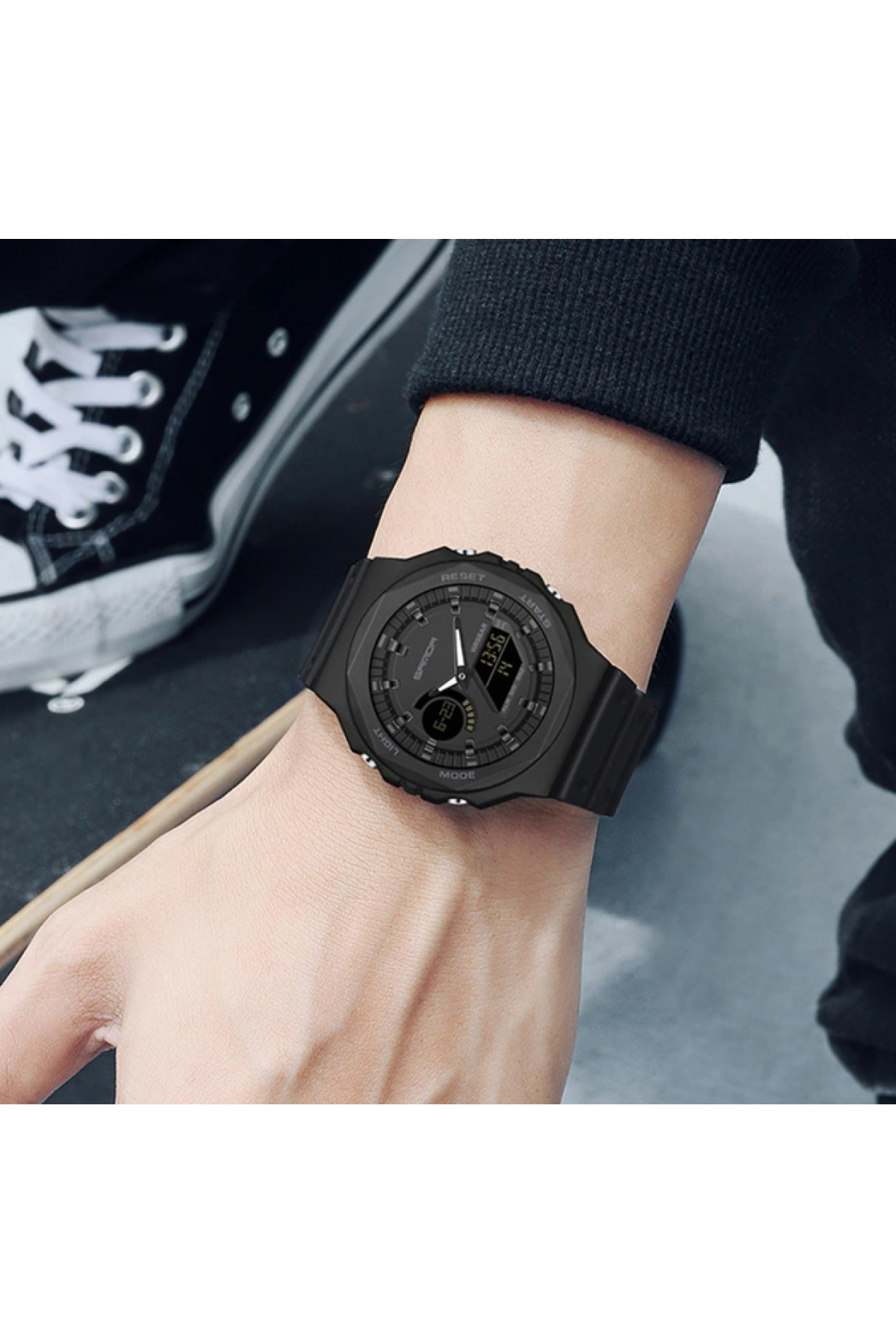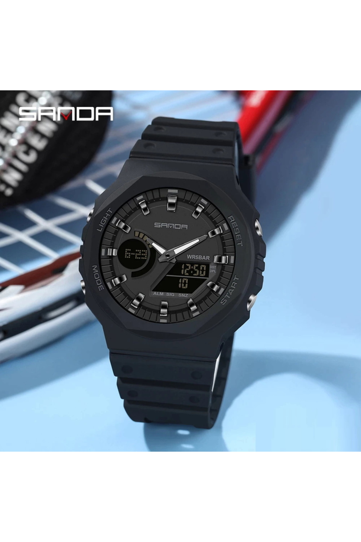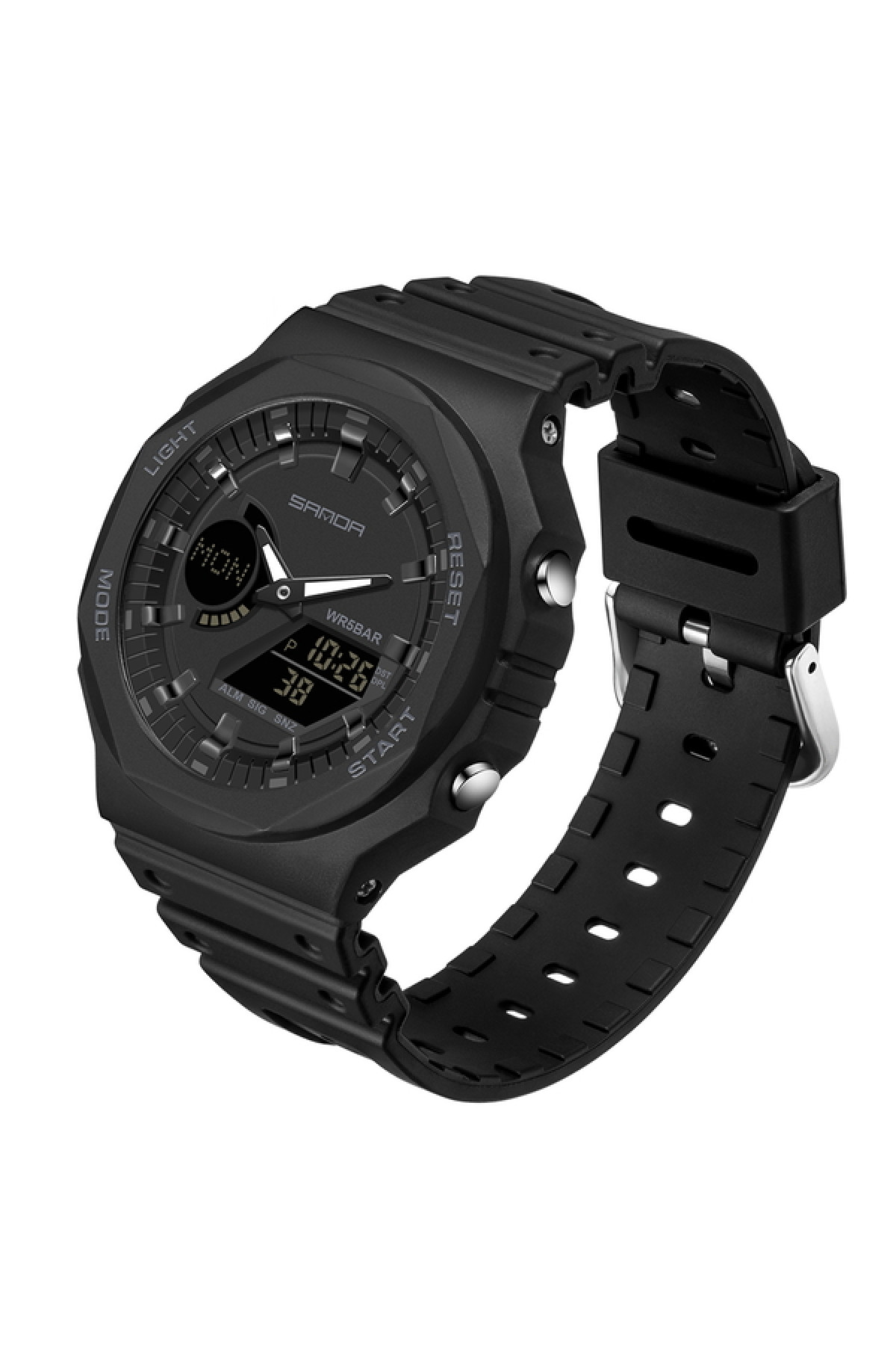 Секундомір, будильник, підсвічування, час показується на циферблаті і стрілками, дата, день тижня, місяць