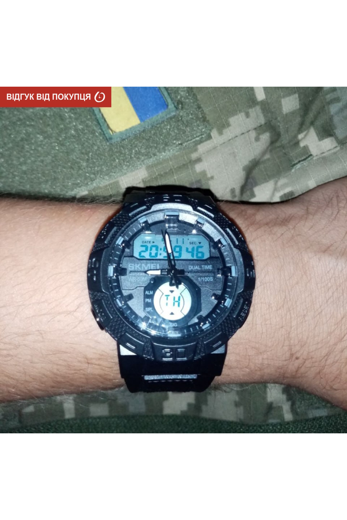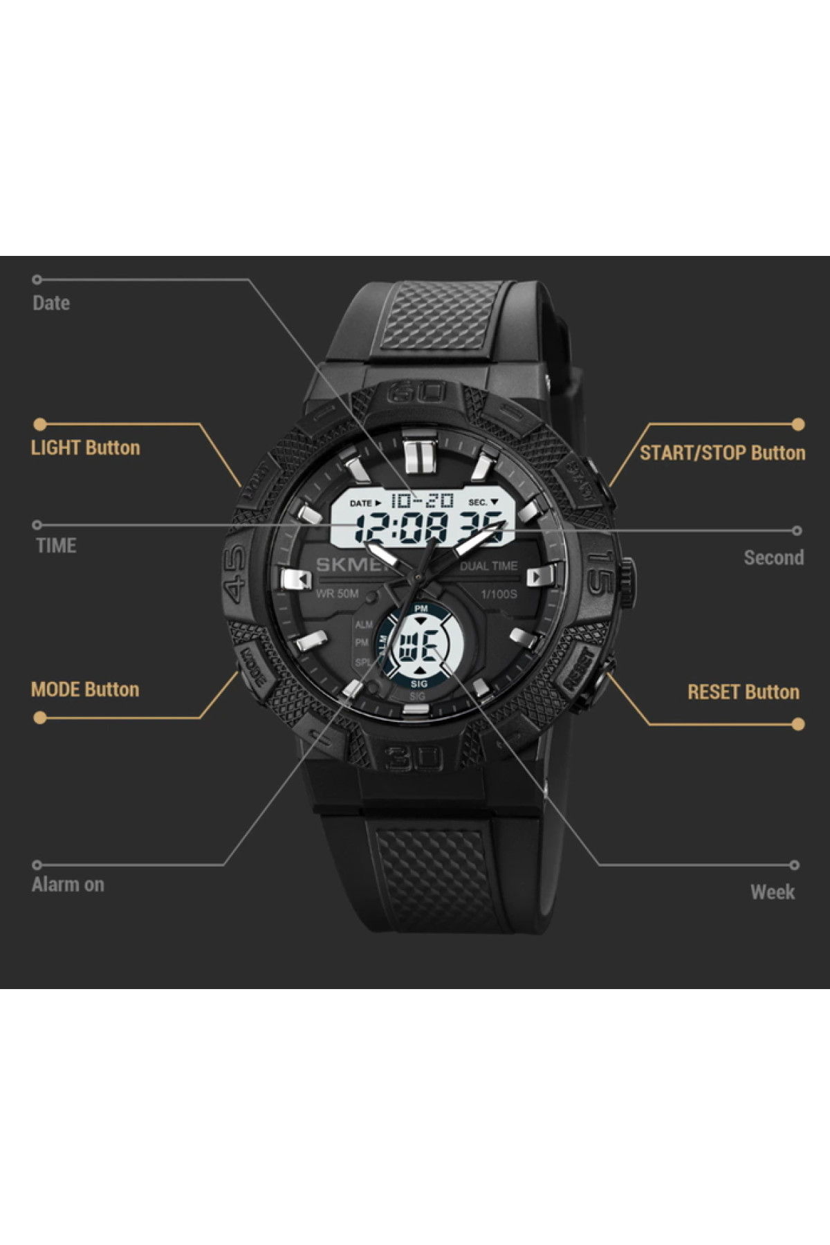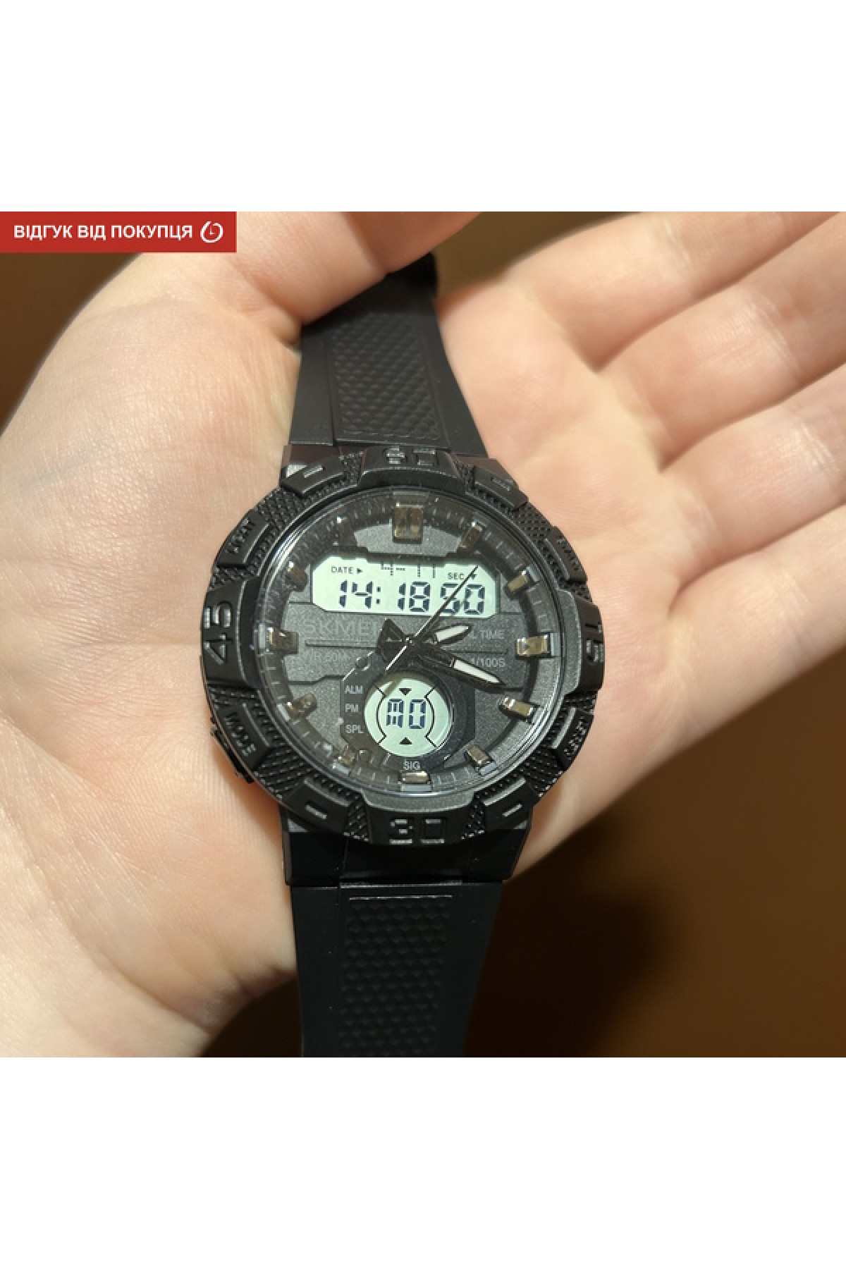 Секундомір, будильник, підсвічування, час показується на циферблаті та стрілками, дата, день тижня, місяць, другий час (Dual Time)