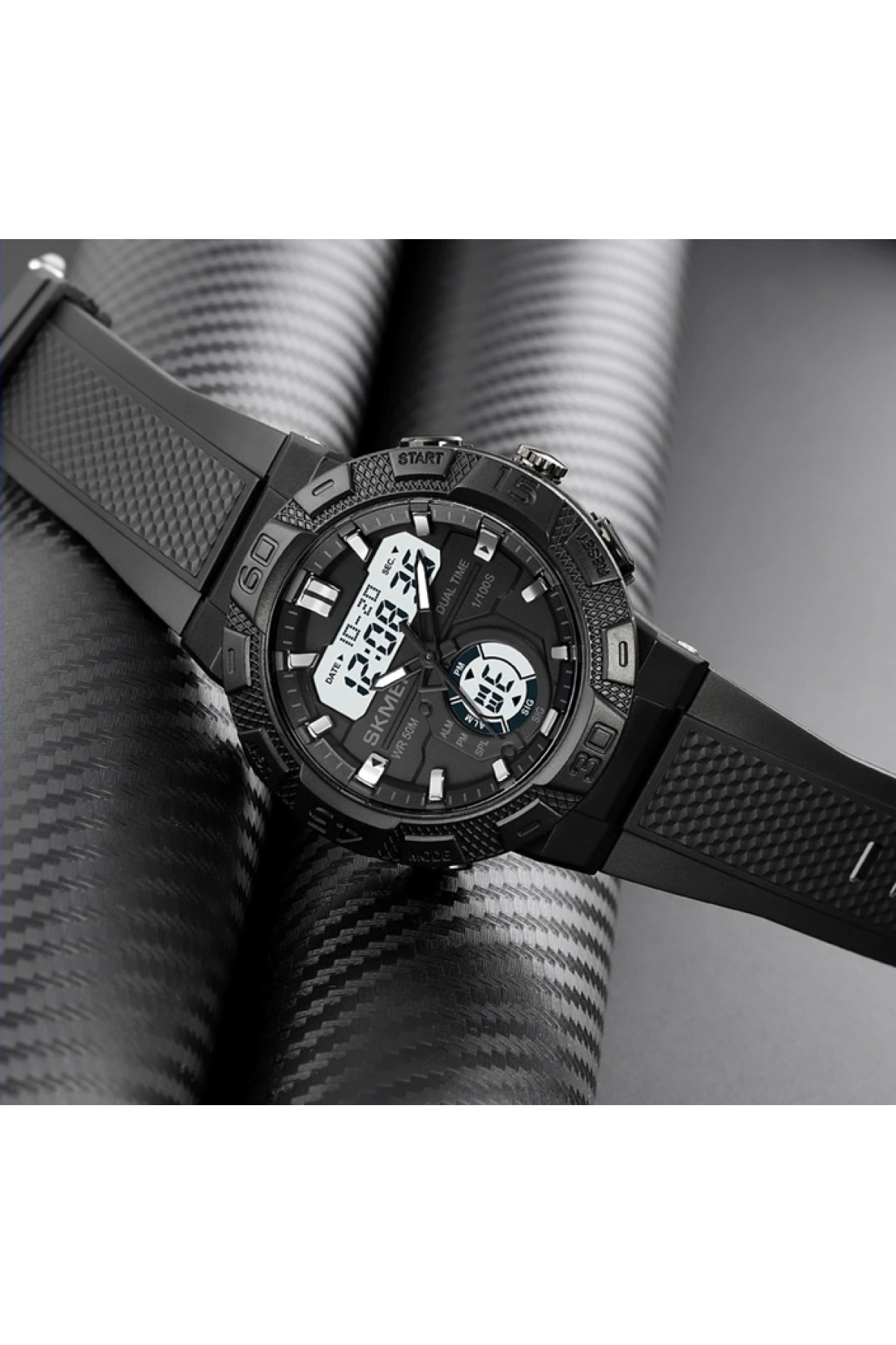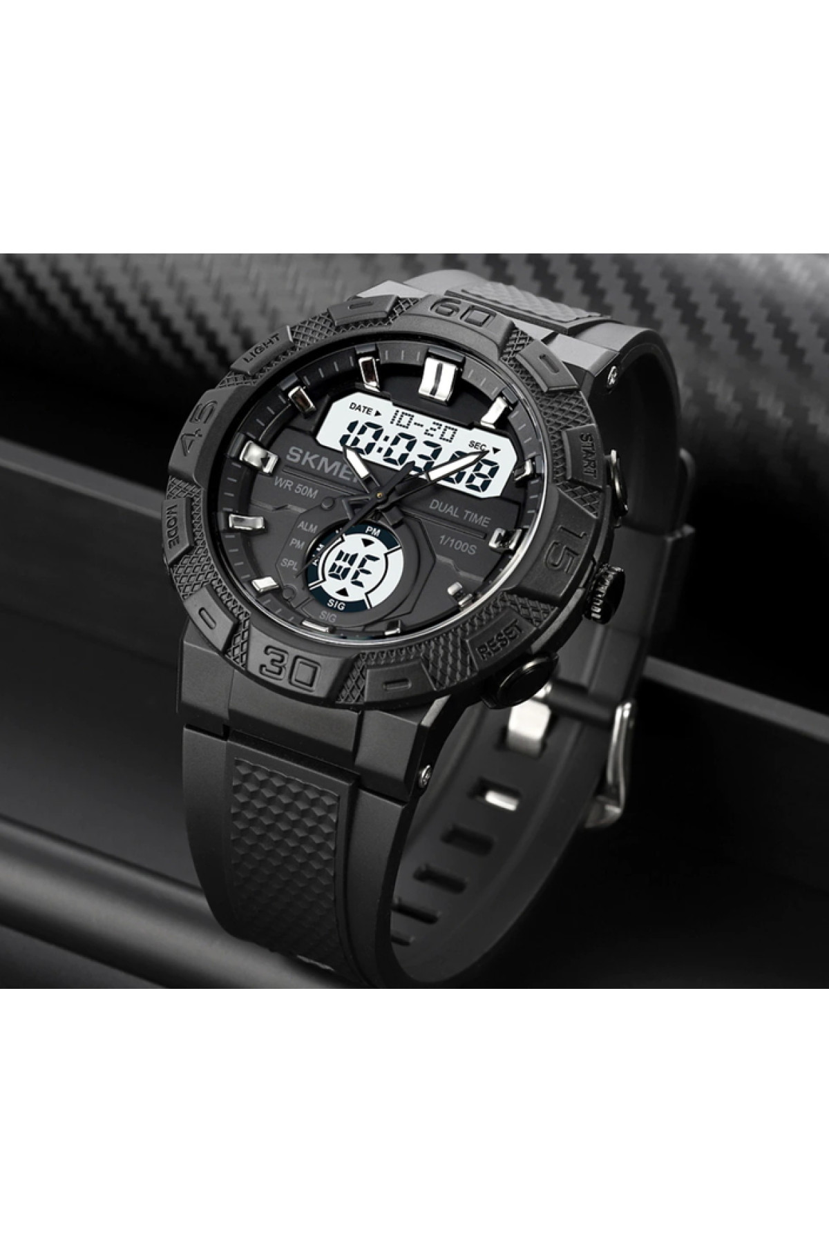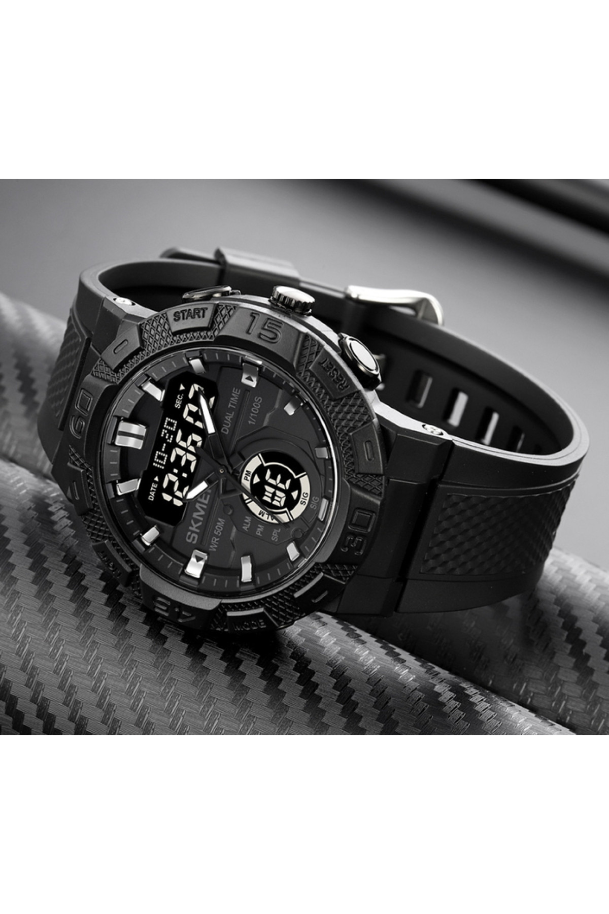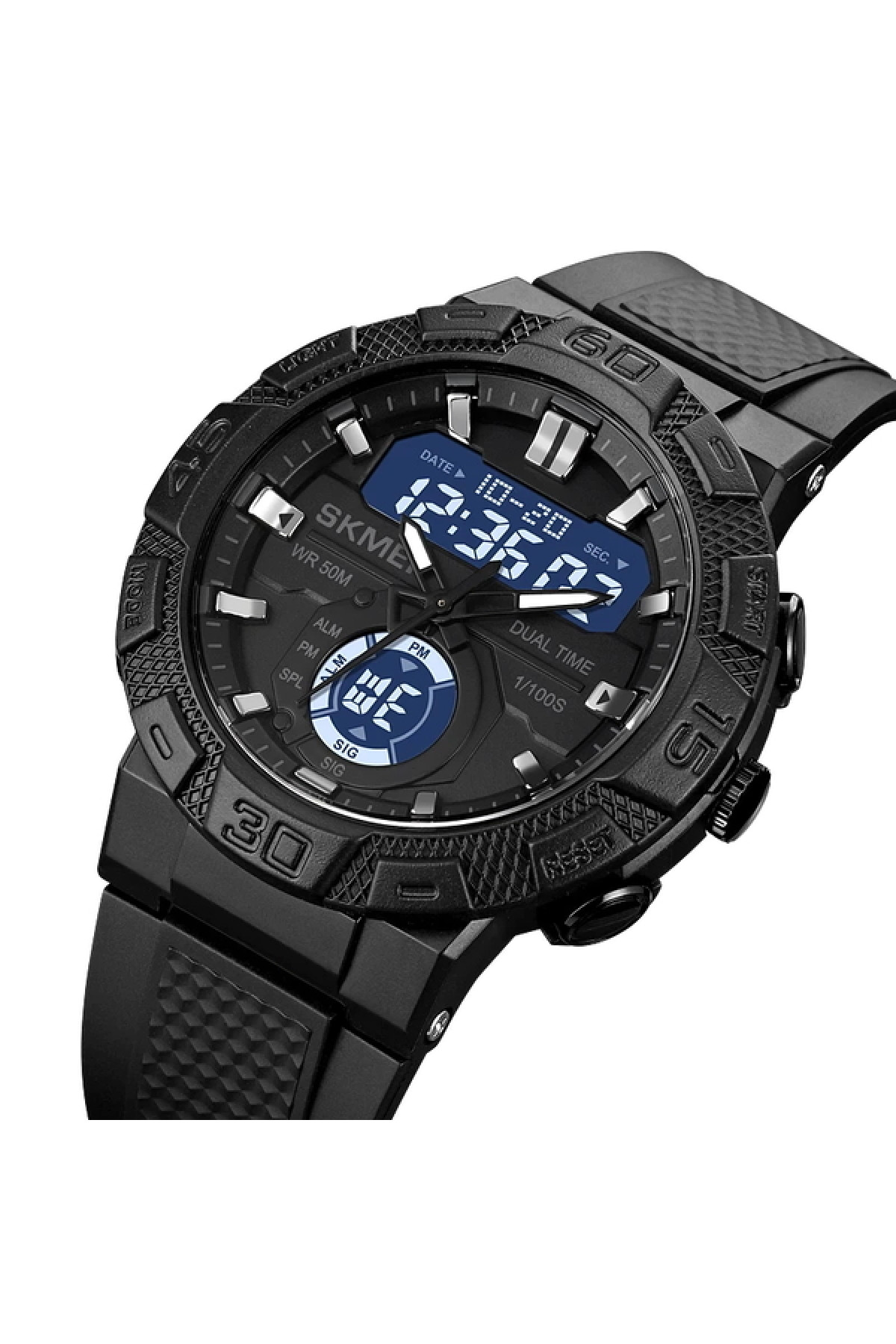 Секундомір, будильник, підсвічування, час показується на циферблаті та стрілками, дата, день тижня, місяць, другий час (Dual Time)
