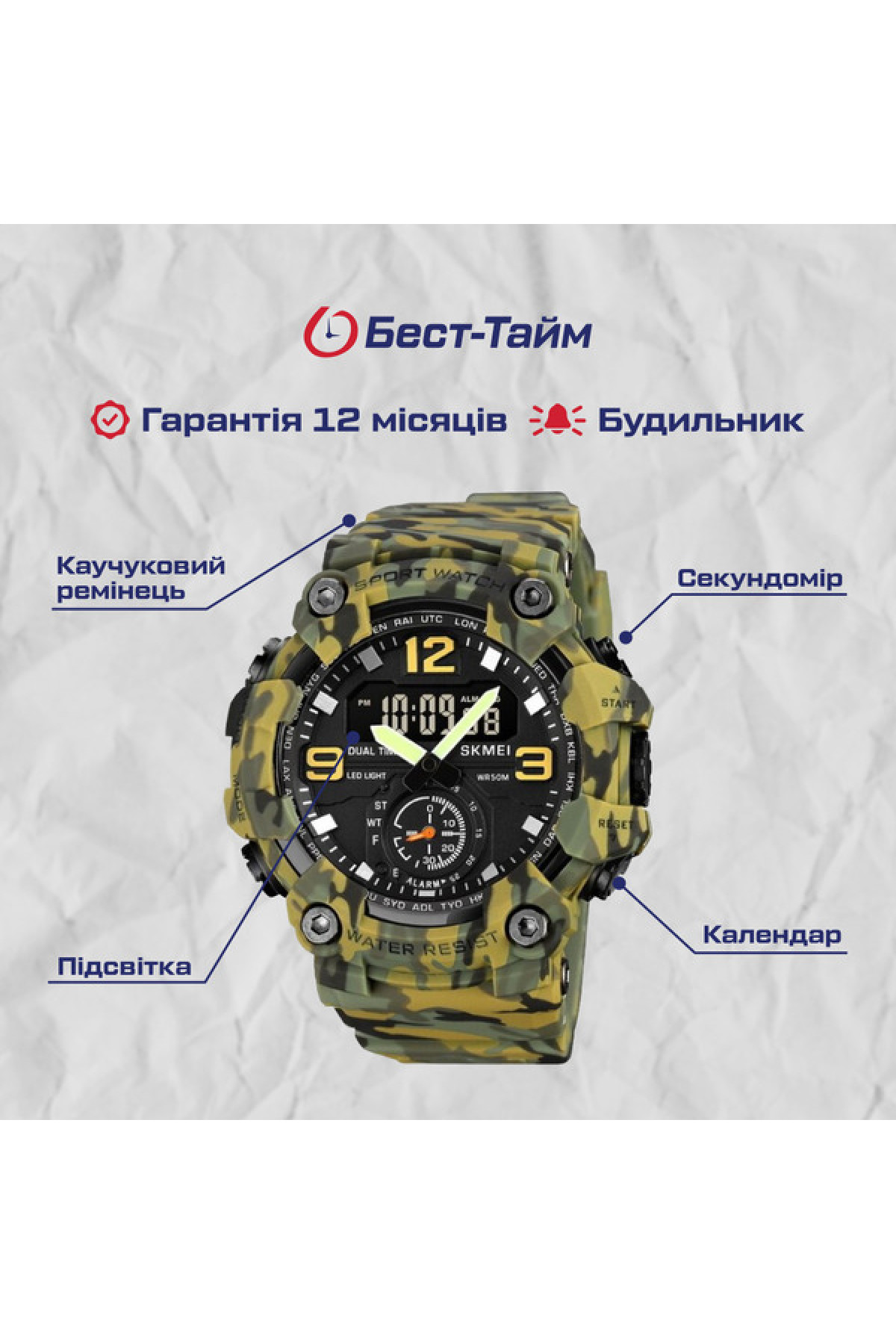 Секундомір, будильник, підсвічування, дата, день тижня, місяць, другий час (Dual Time)