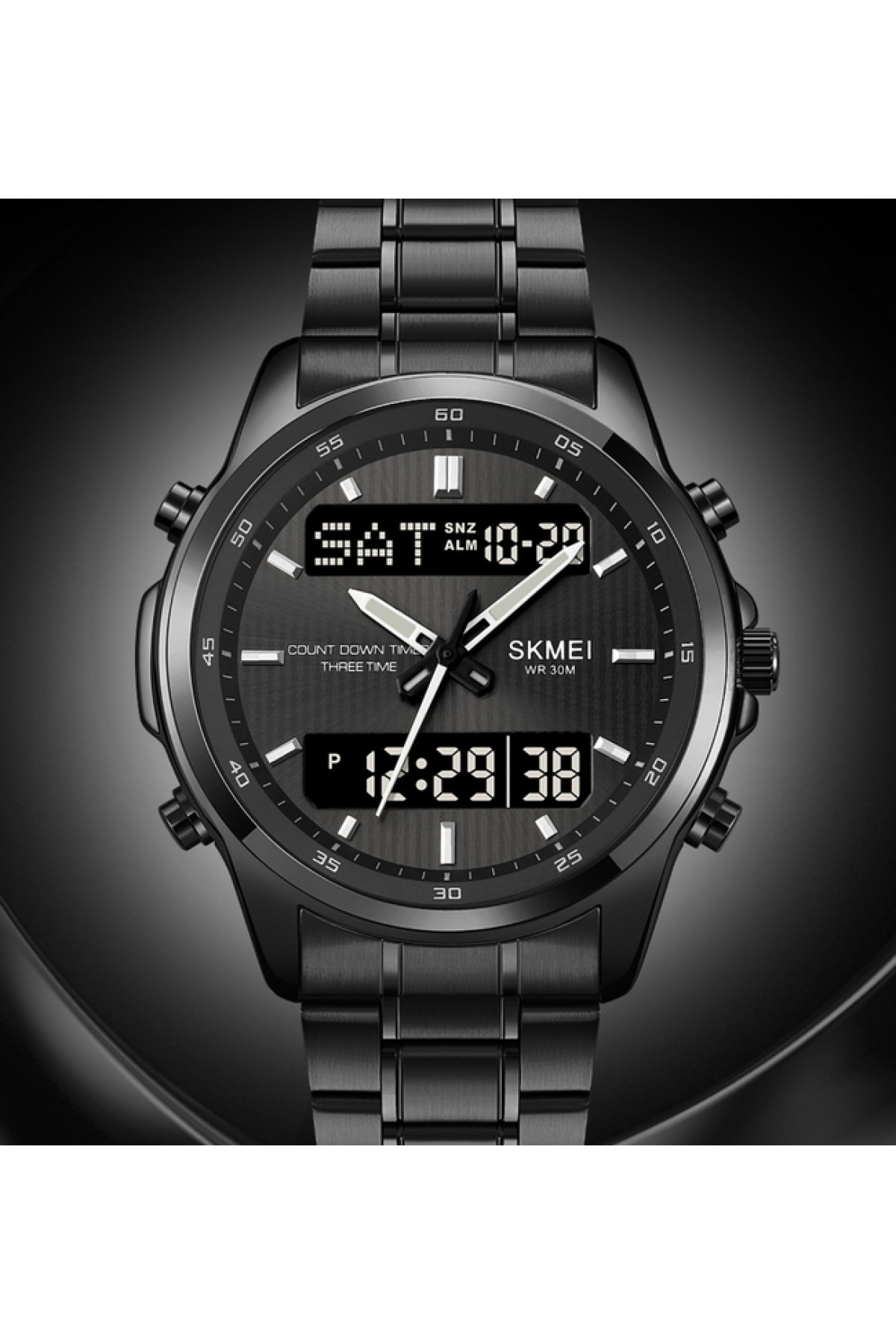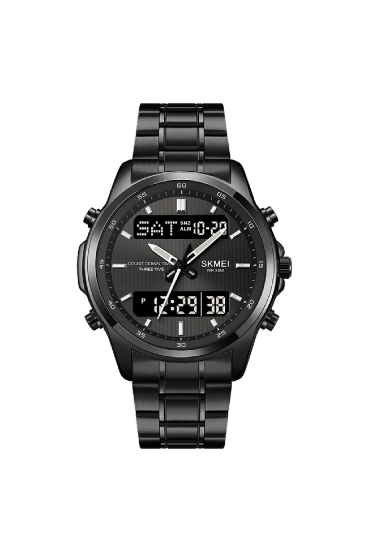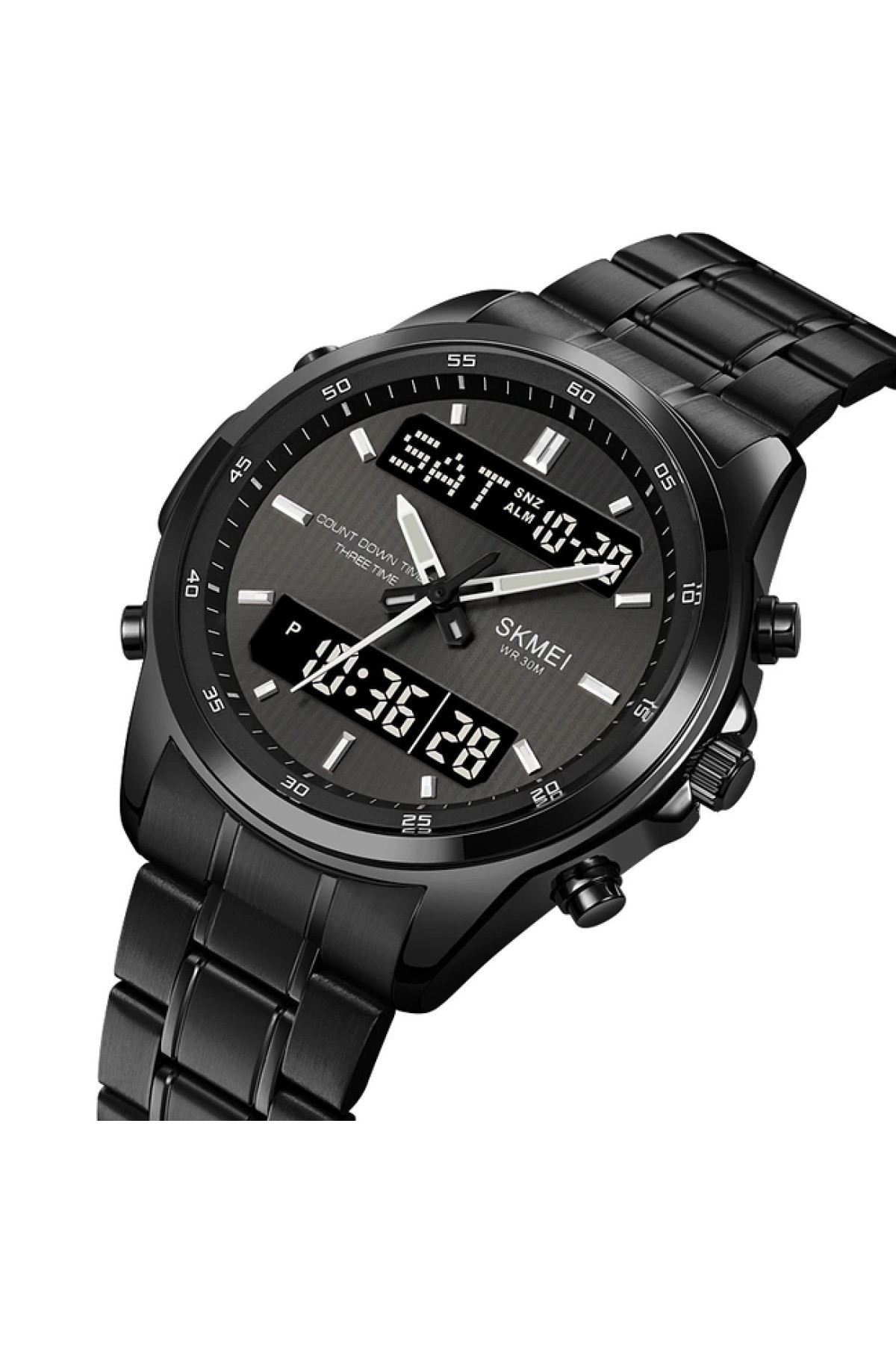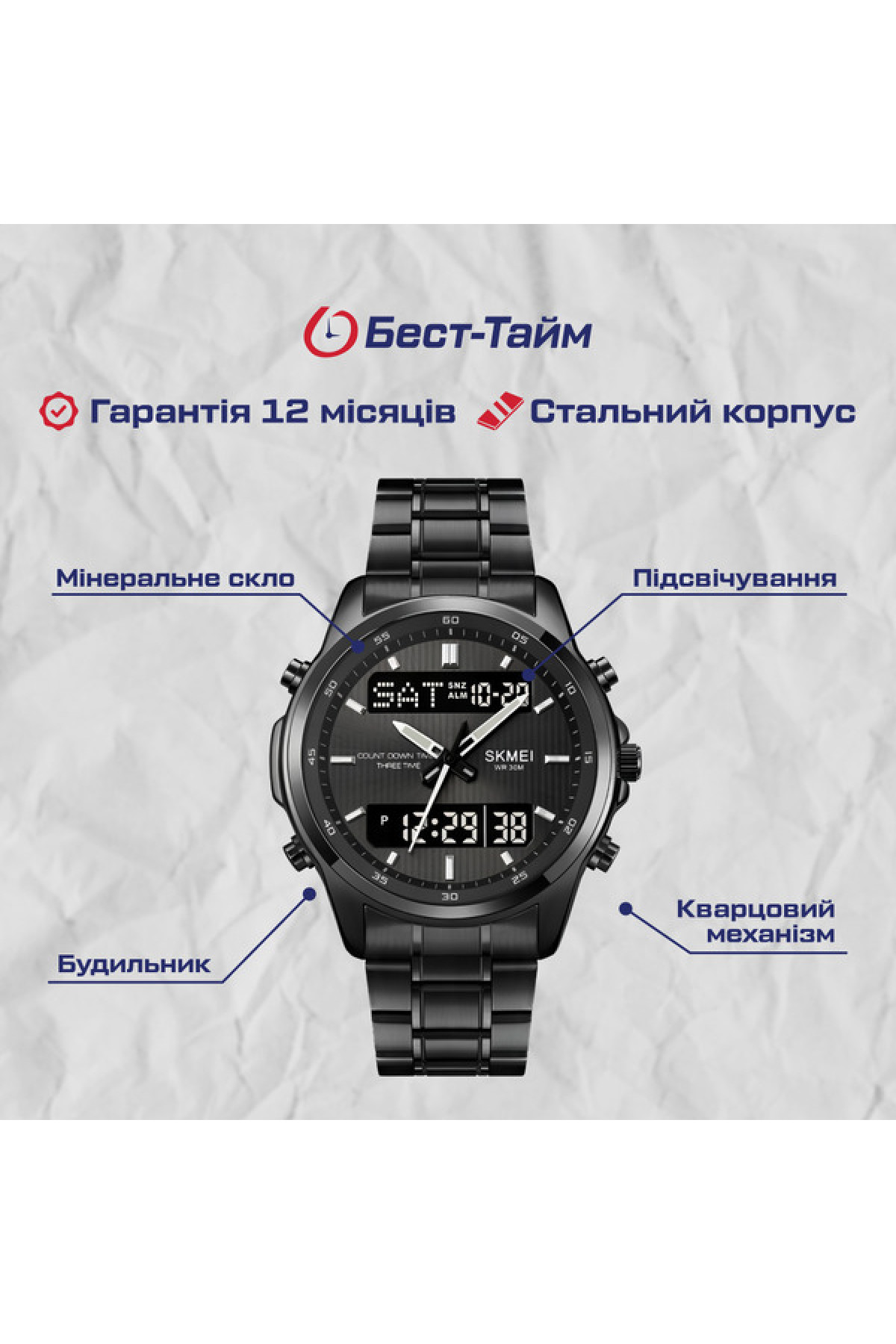 Секундомір, будильник, таймер, підсвічування, час показується на циферблаті і стрілками, дата, день тижня, місяць