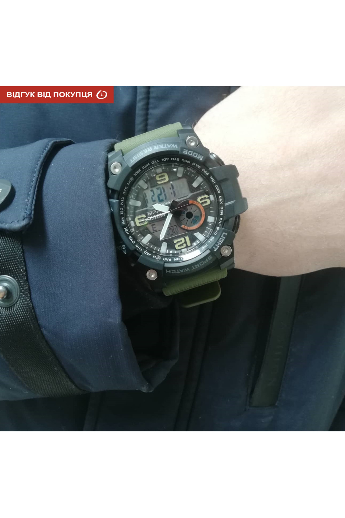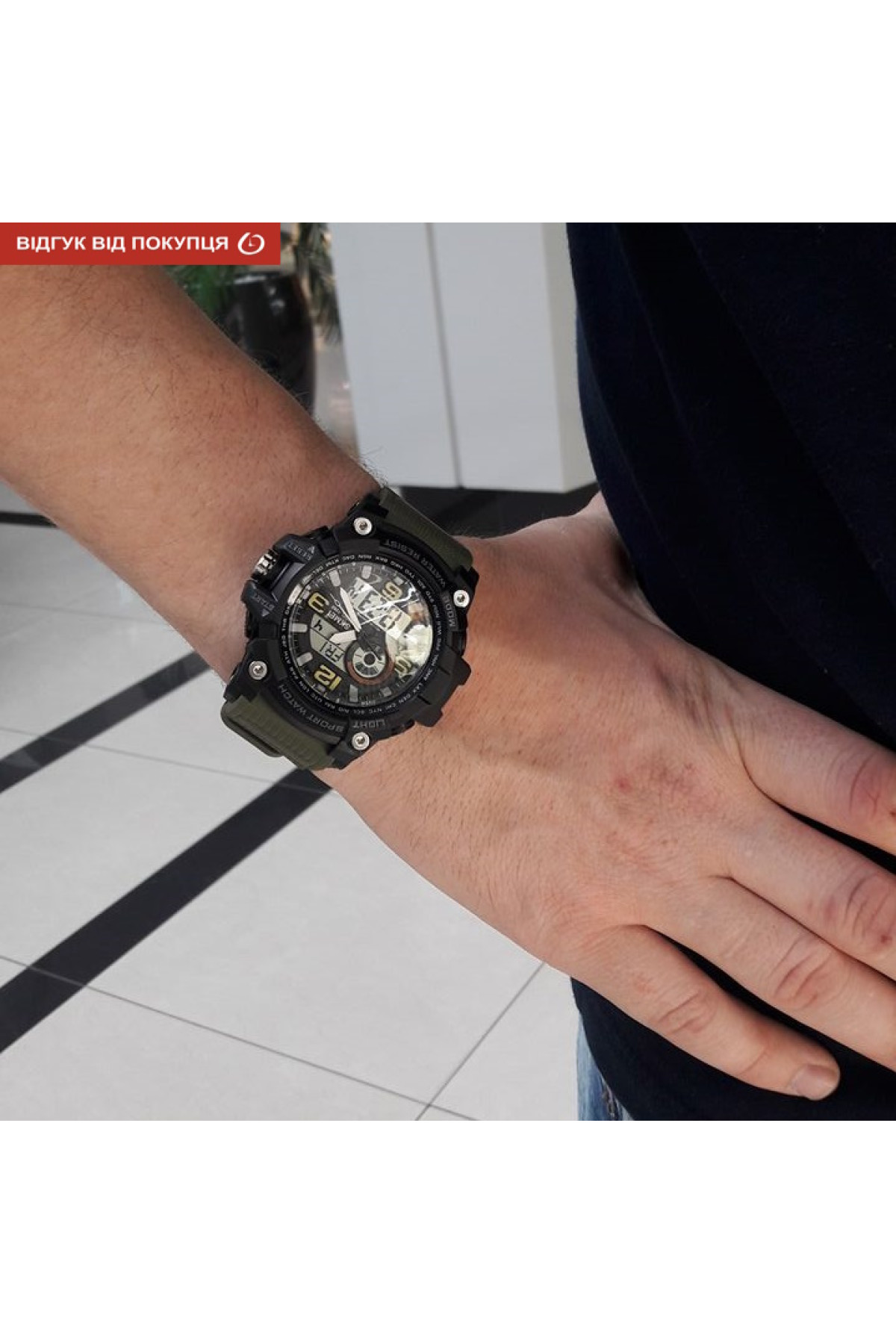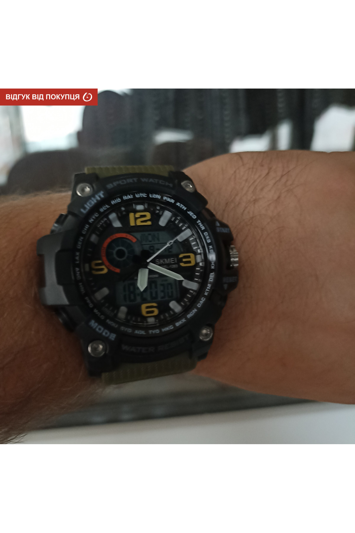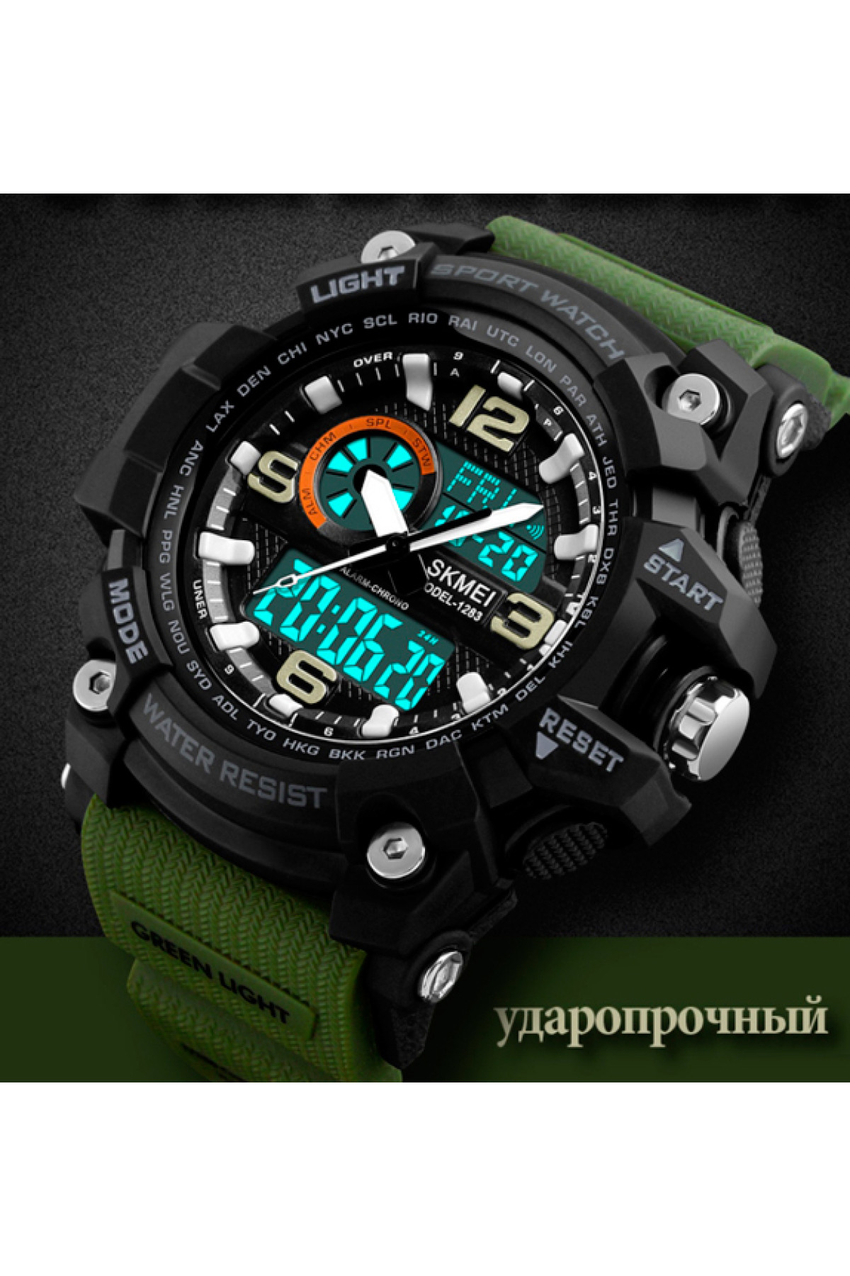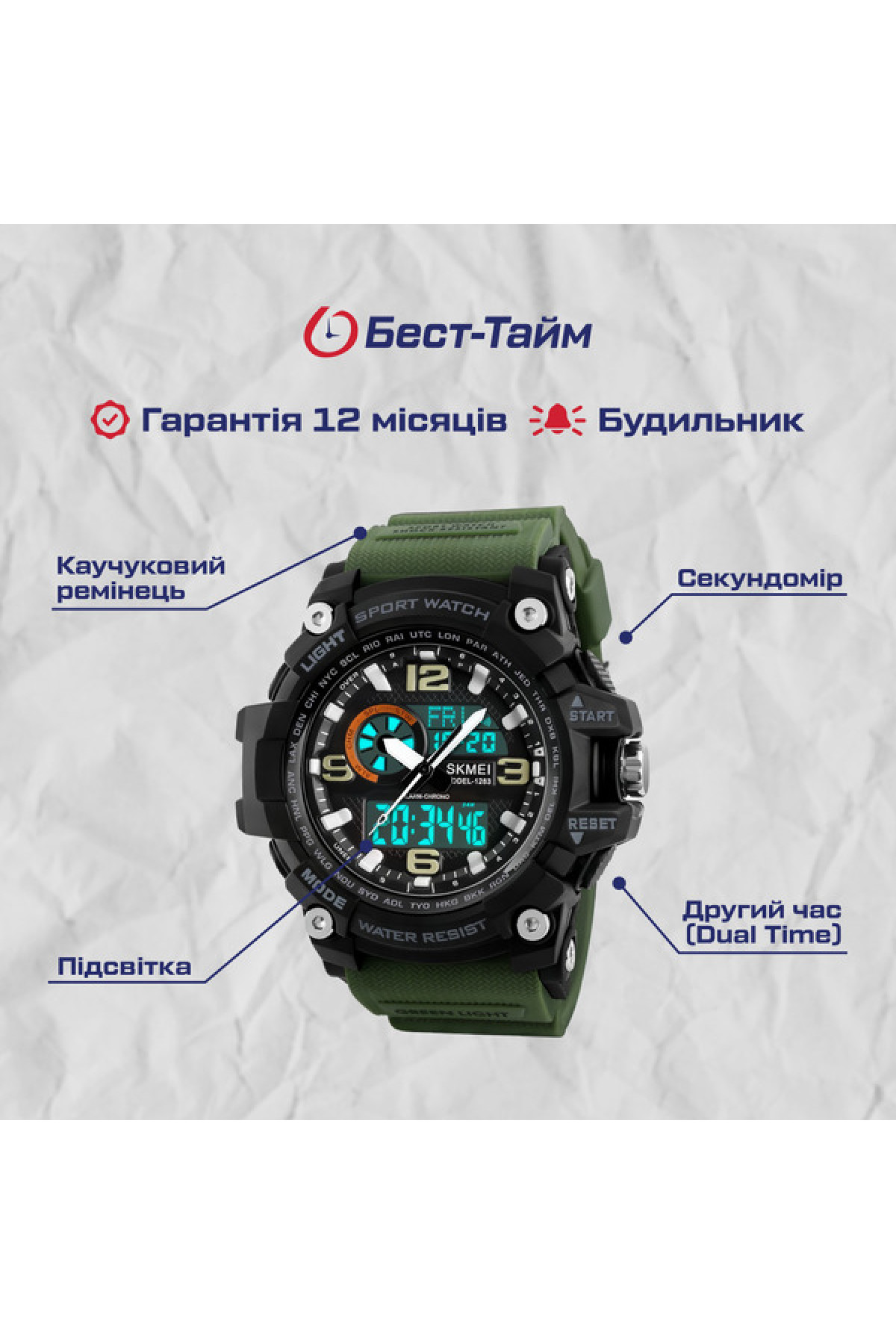 Секундомір, таймер, будильник, підсвічування, час показується на циферблаті й стрілками, дата, день тижня, місяць, другий час (Dual Time)