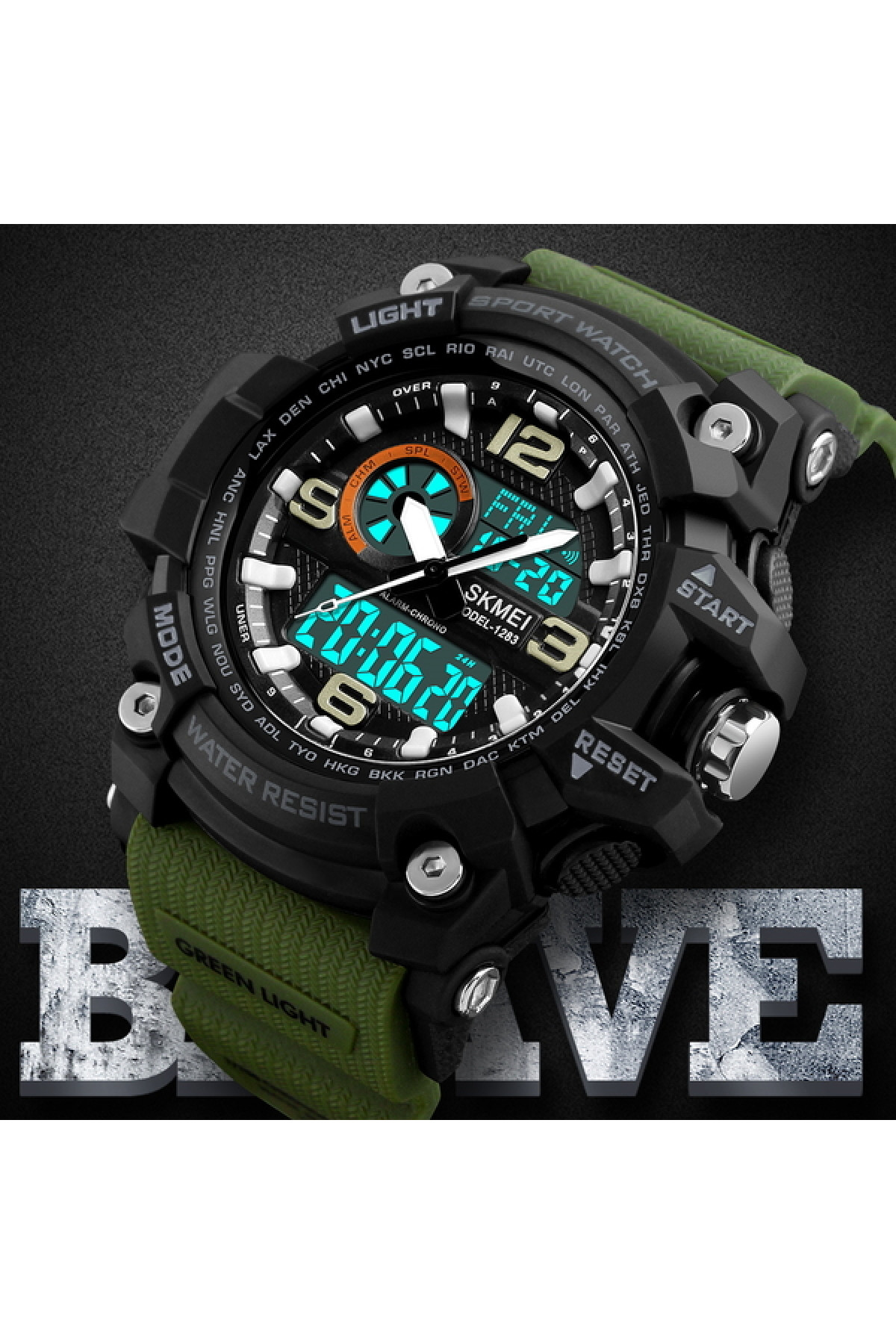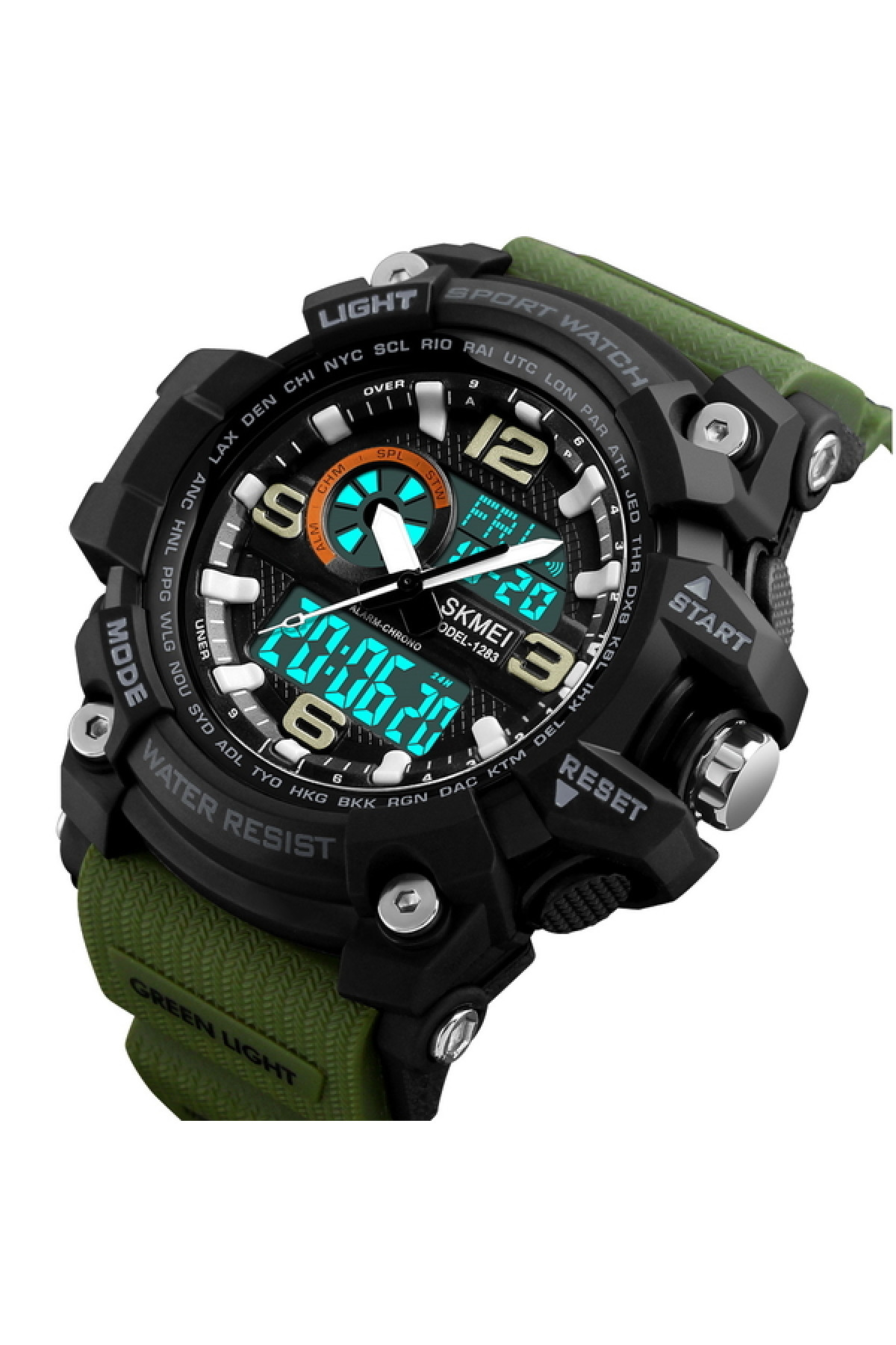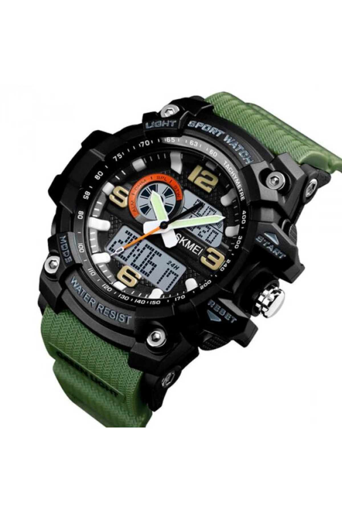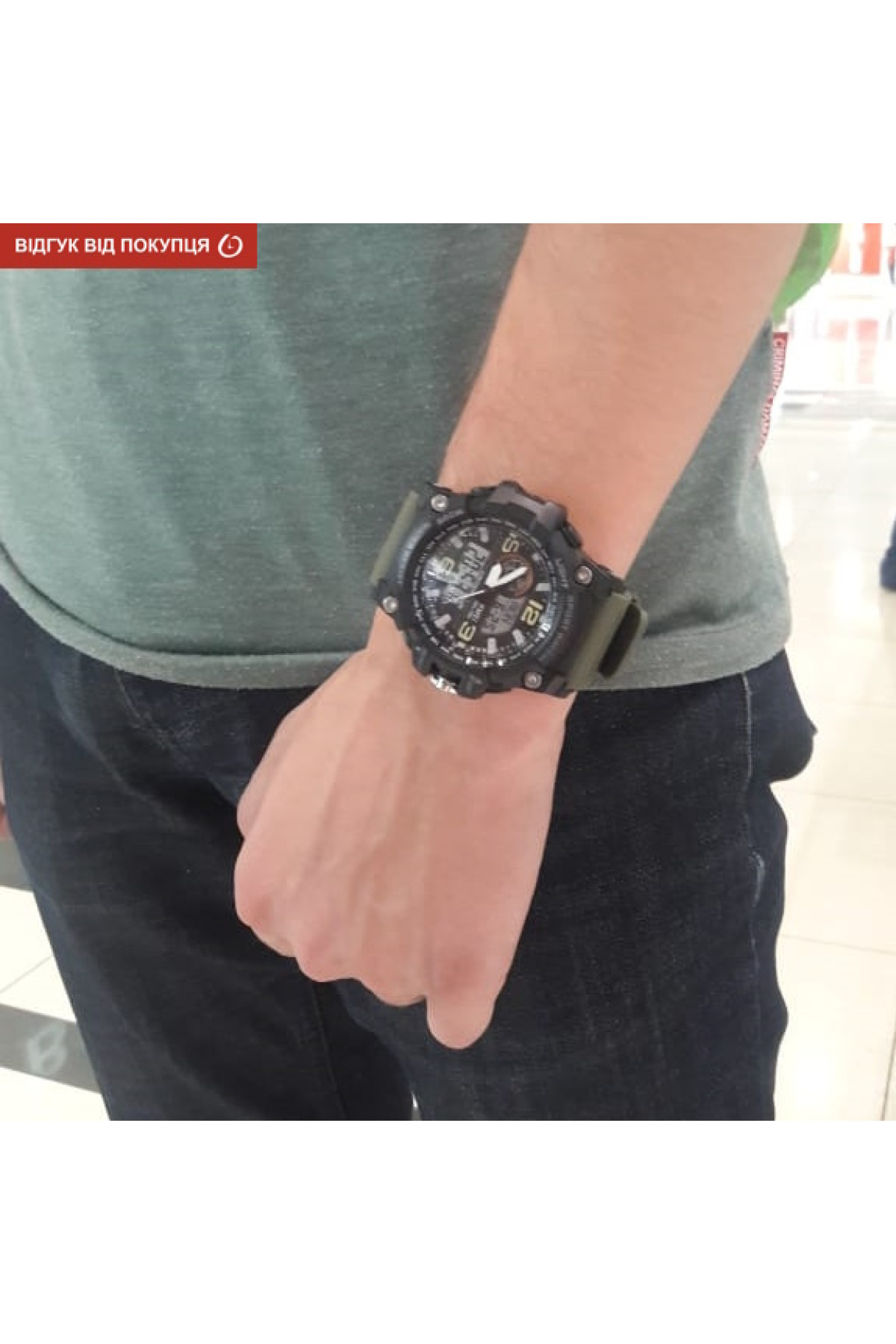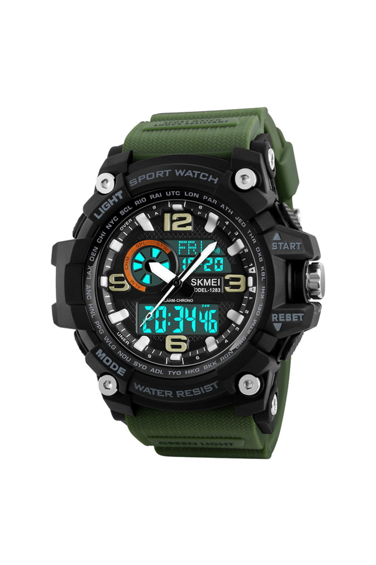 Секундомір, таймер, будильник, підсвічування, час показується на циферблаті й стрілками, дата, день тижня, місяць, другий час (Dual Time)