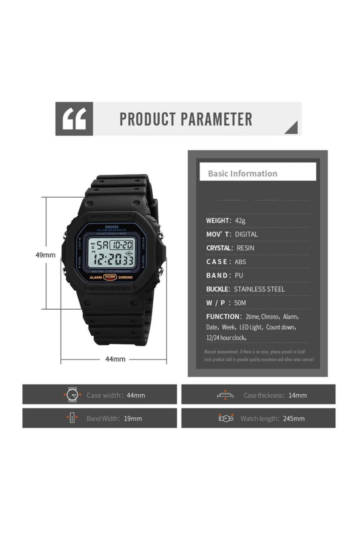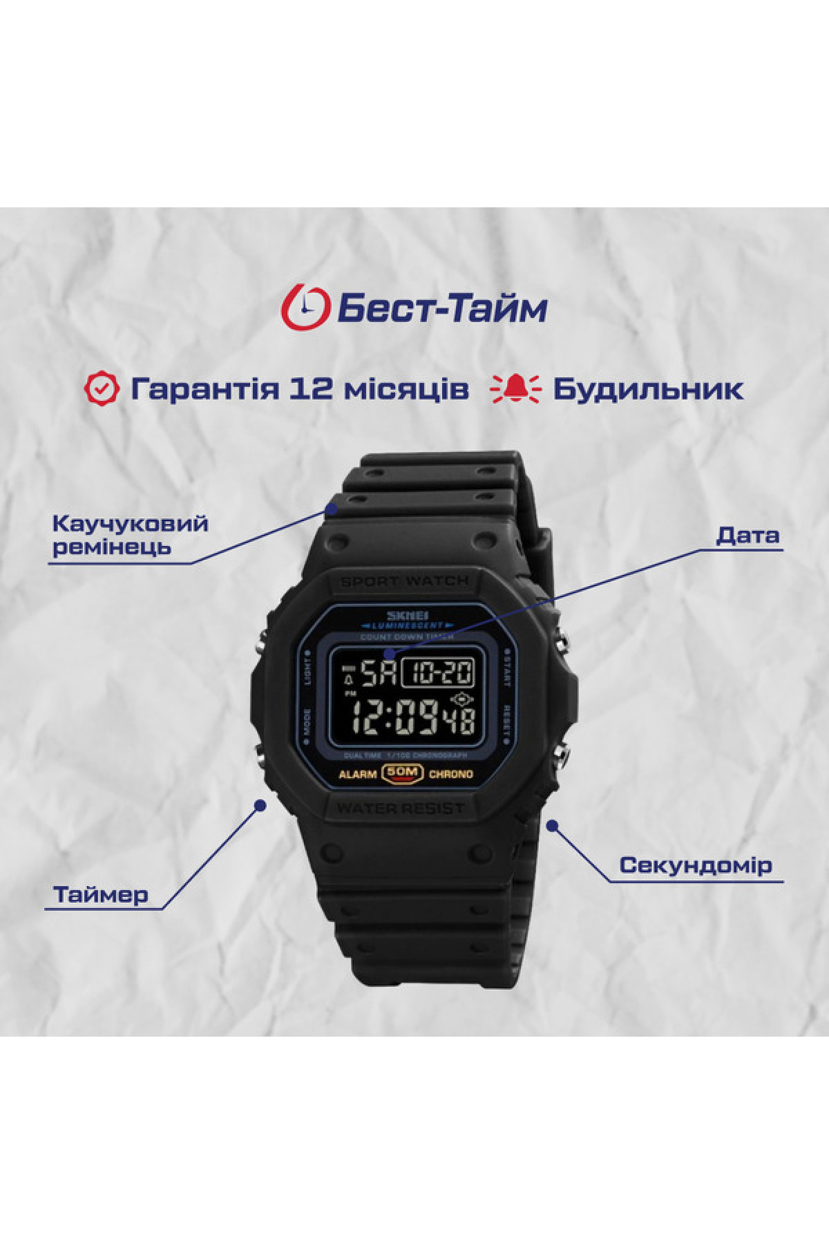 Секундомір, таймер, будильник, підсвічування, дата, день тижня, місяць, другий час (Dual Time)