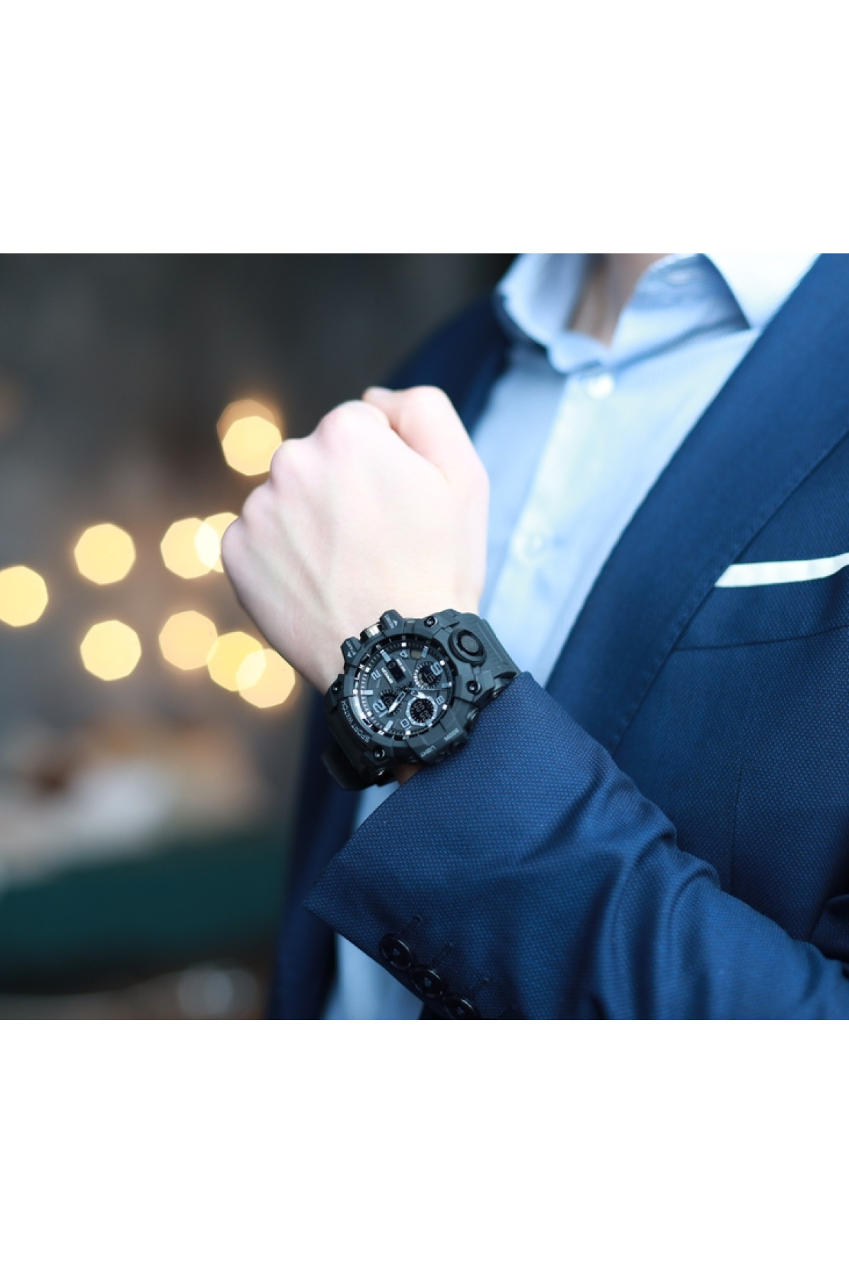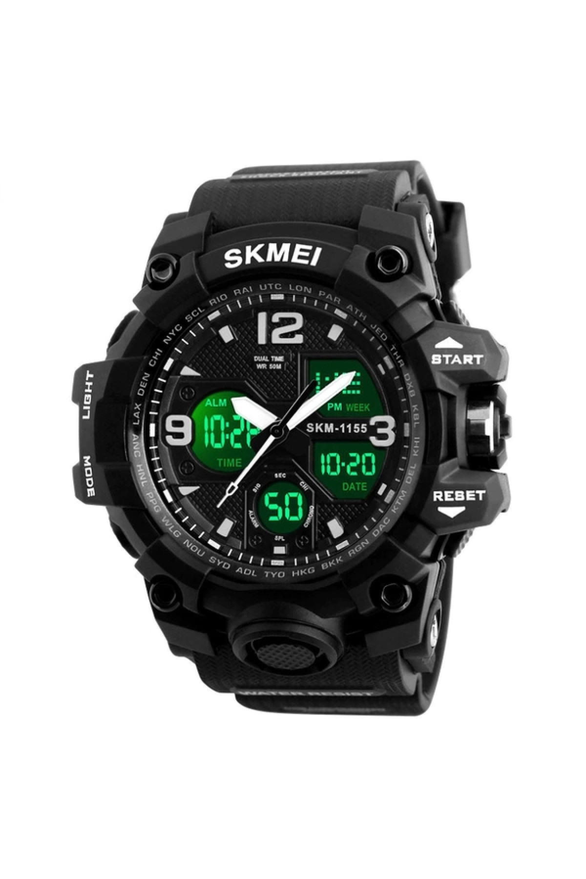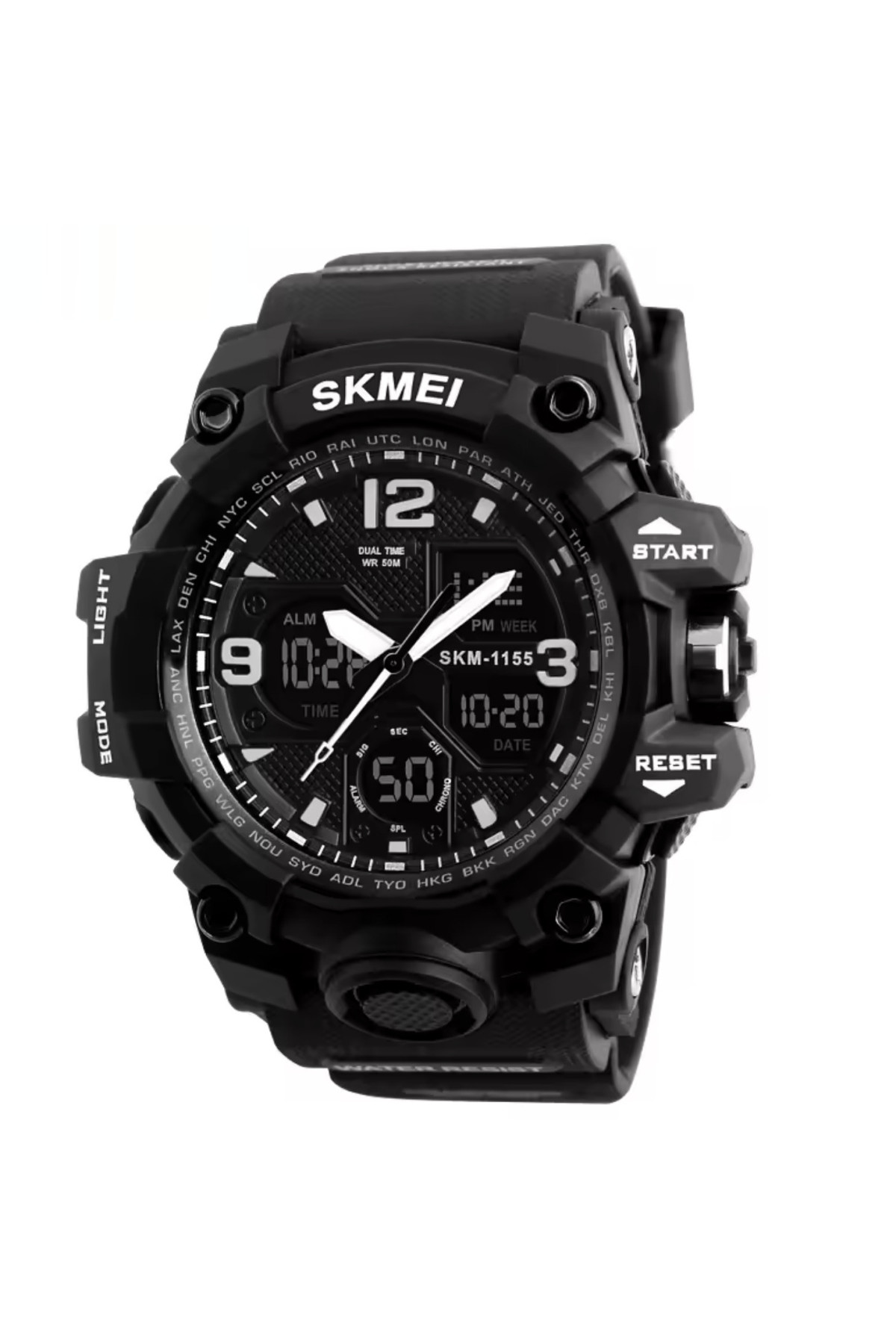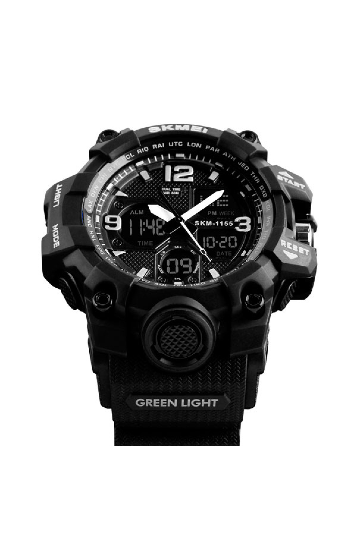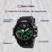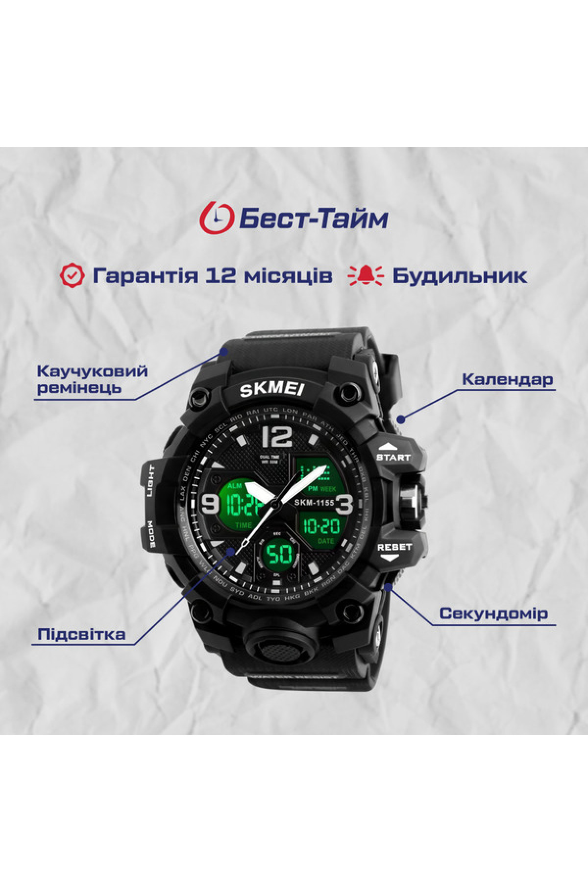 Секундомір, будильник, підсвічування, час показується на циферблаті й стрілками, дата, день тижня, місяць