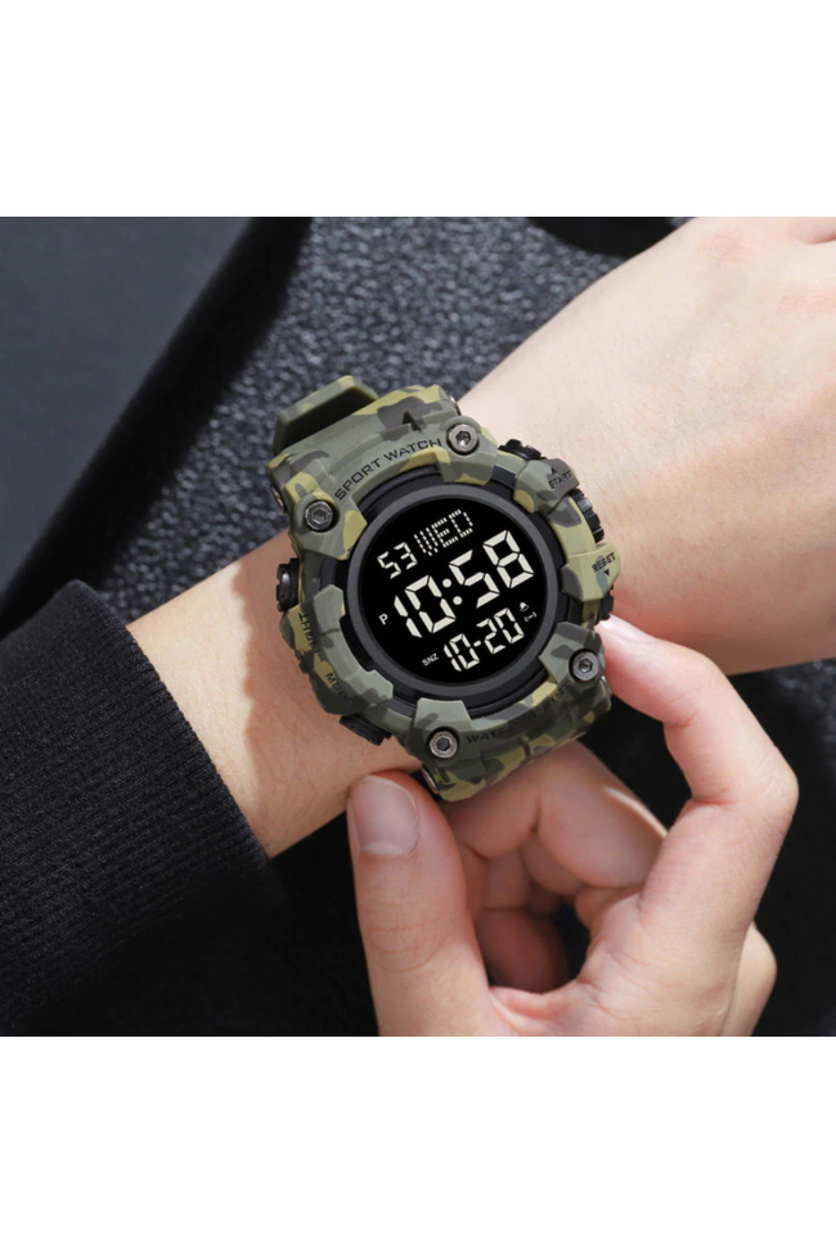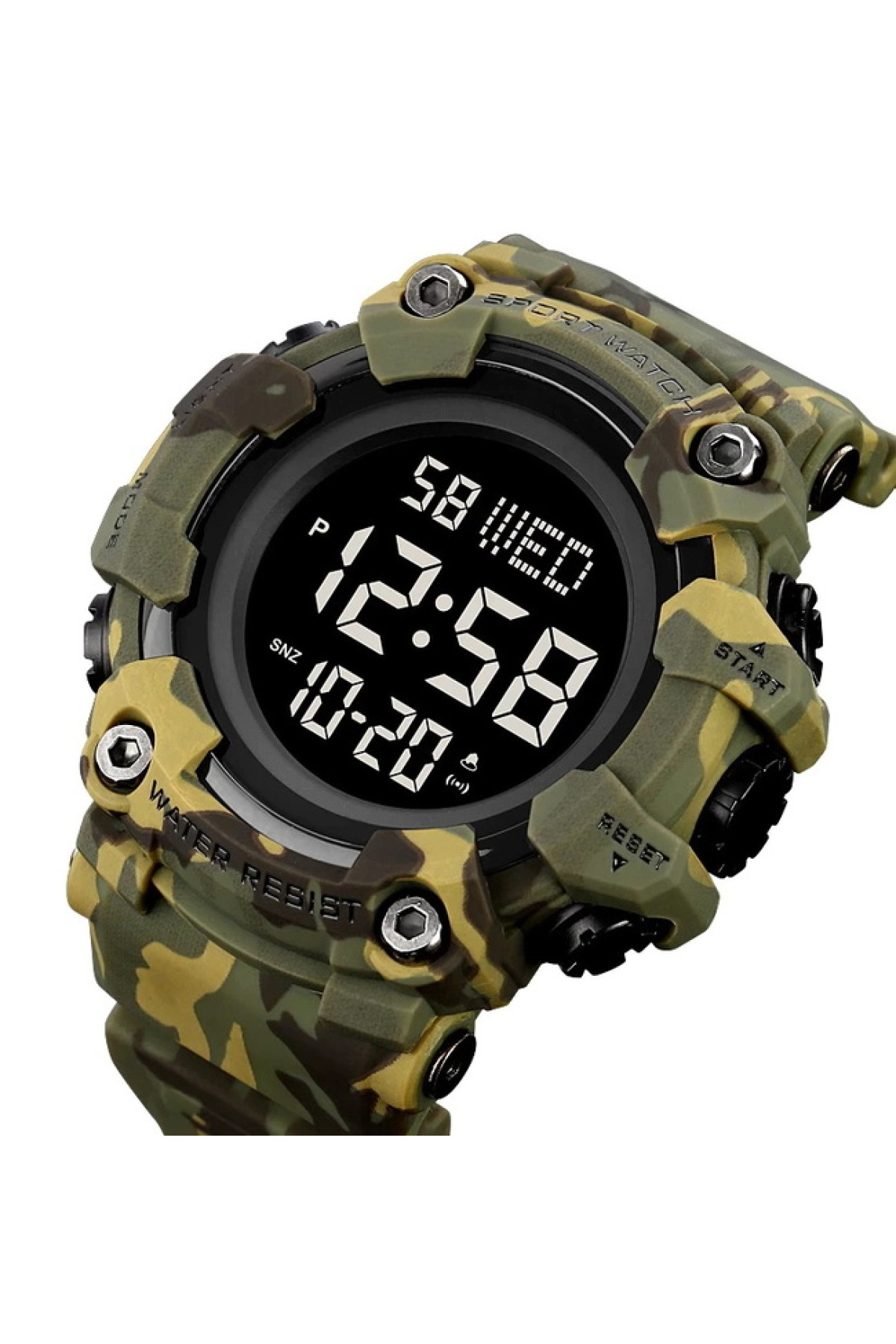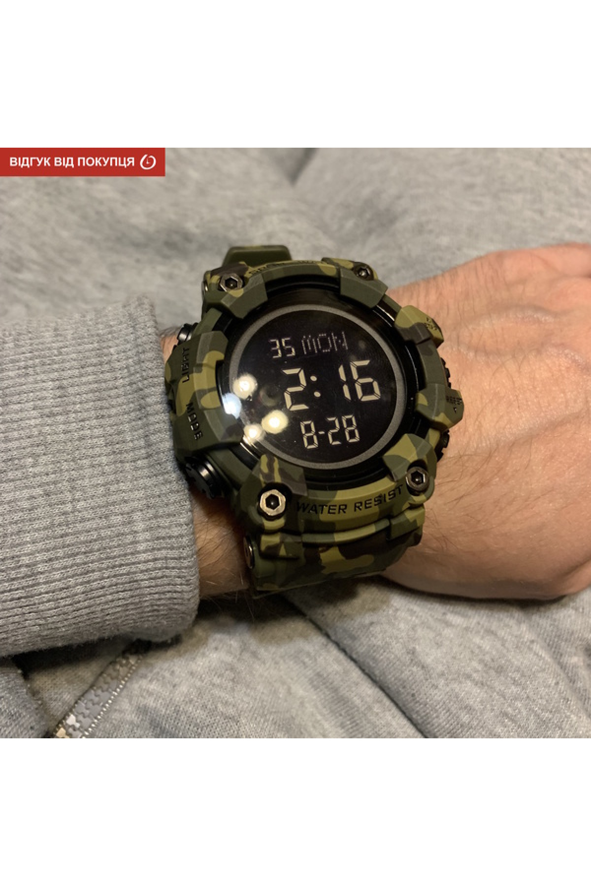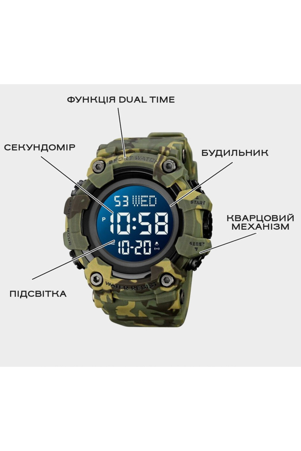 Секундомір, будильник, таймер, підсвічування, дата, день тижня, місяць, другий час (Dual Time)
