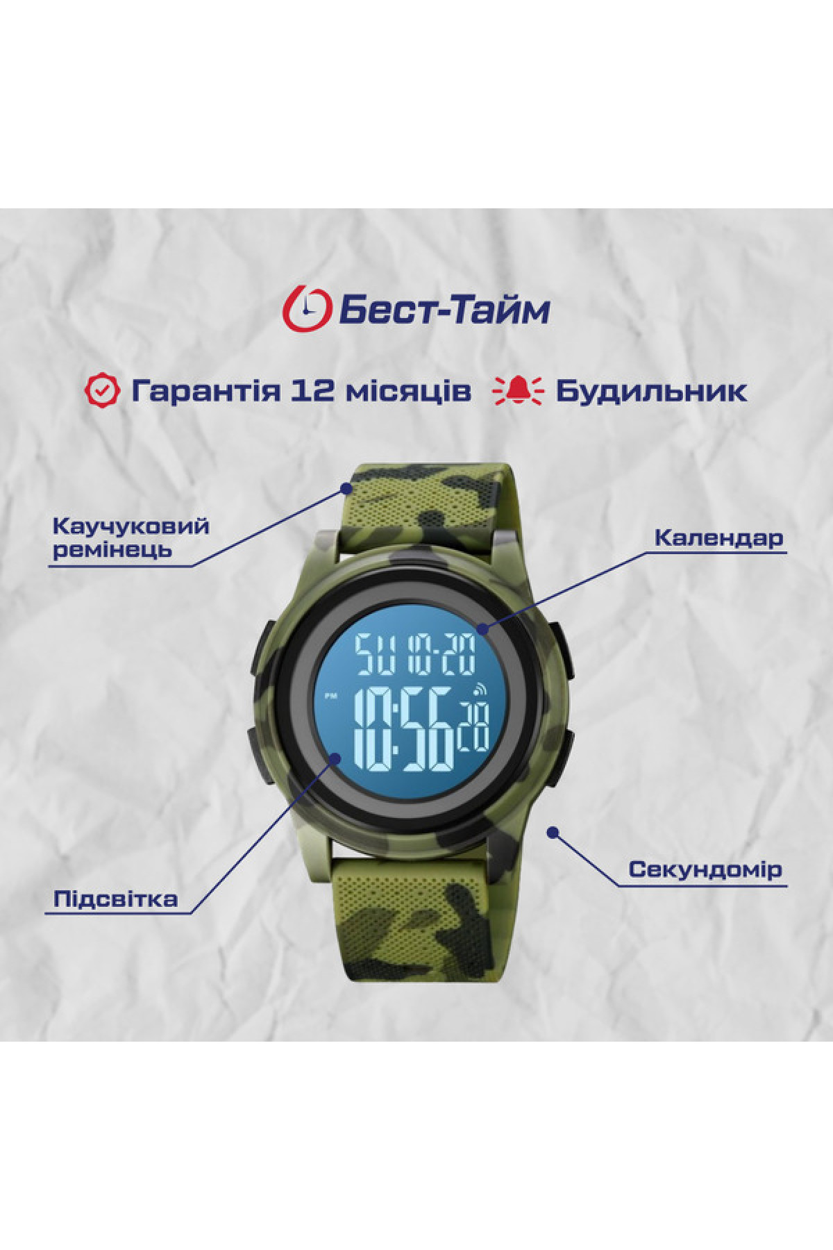 Секундомір, будильник, підсвічування, дата, день тижня, місяць