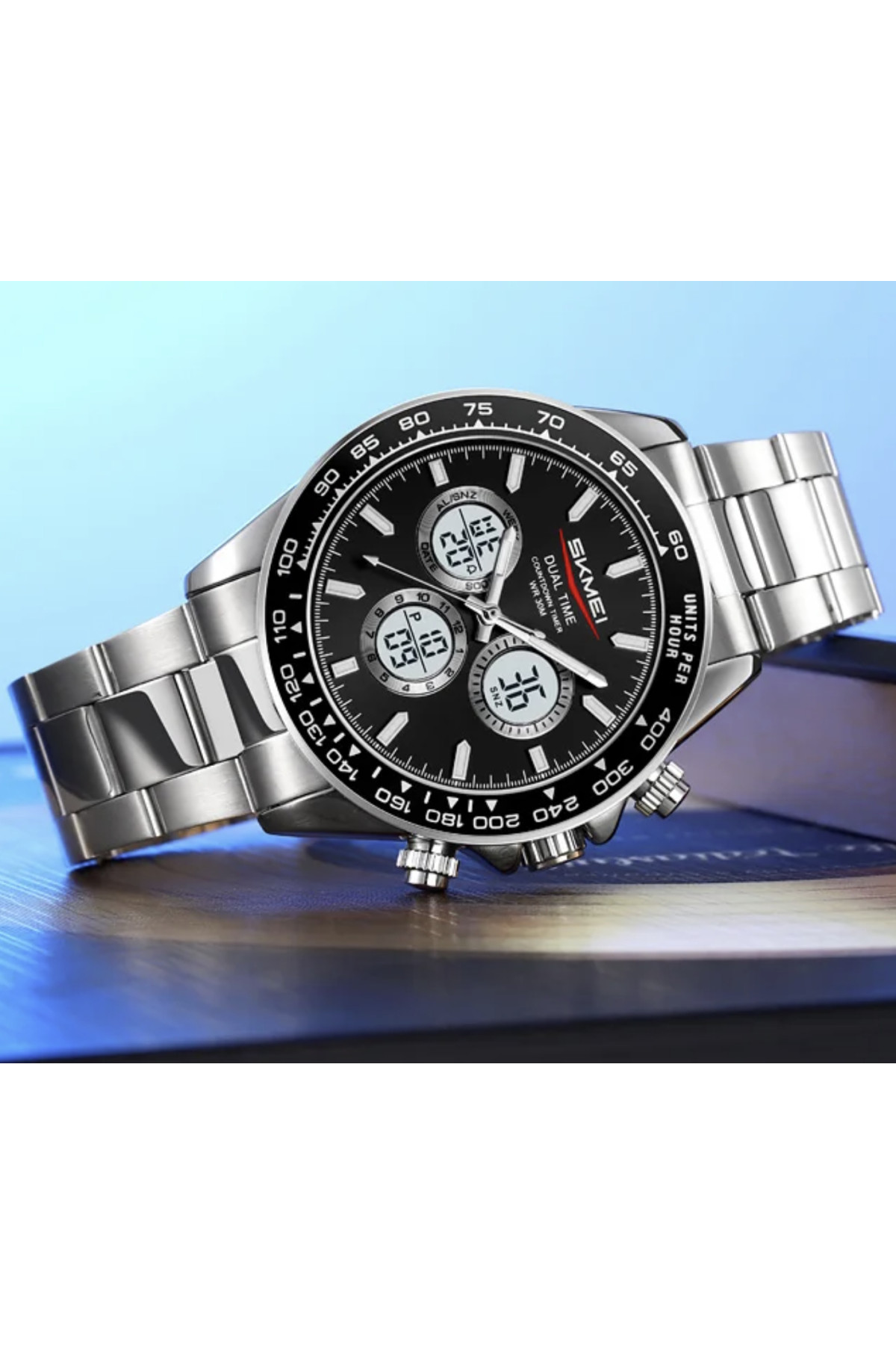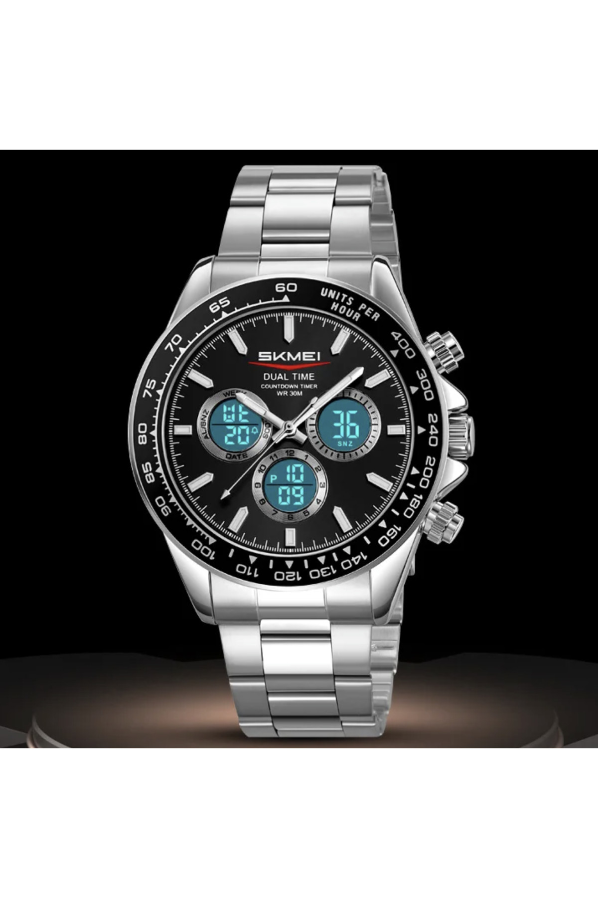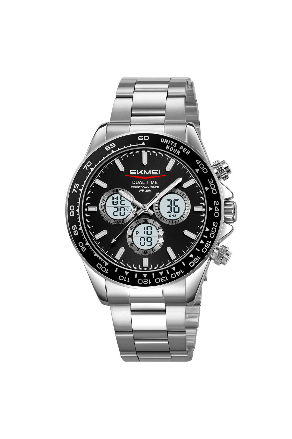Секундомір, таймер, будильник, підсвічування, час показується на циферблаті й стрілками, дата, день тижня, місяць