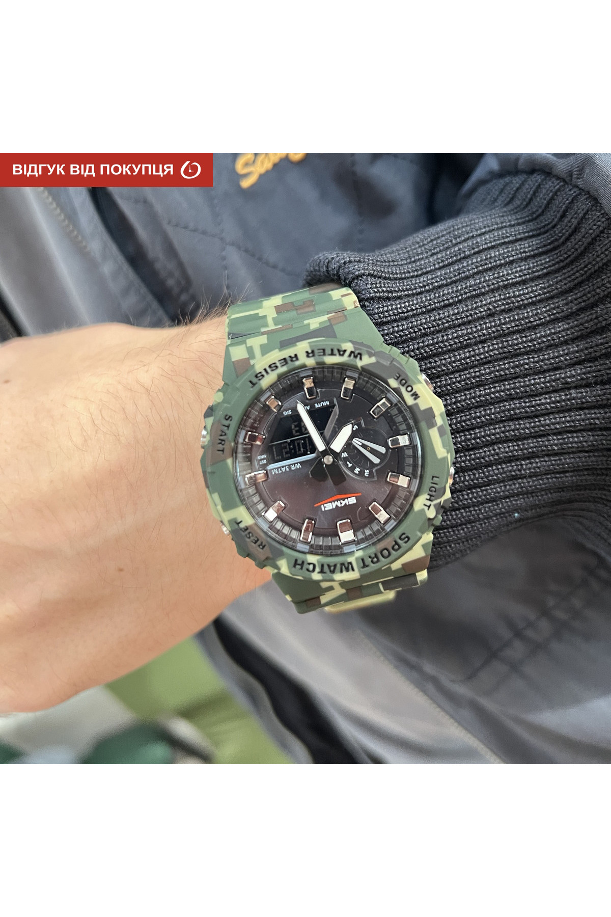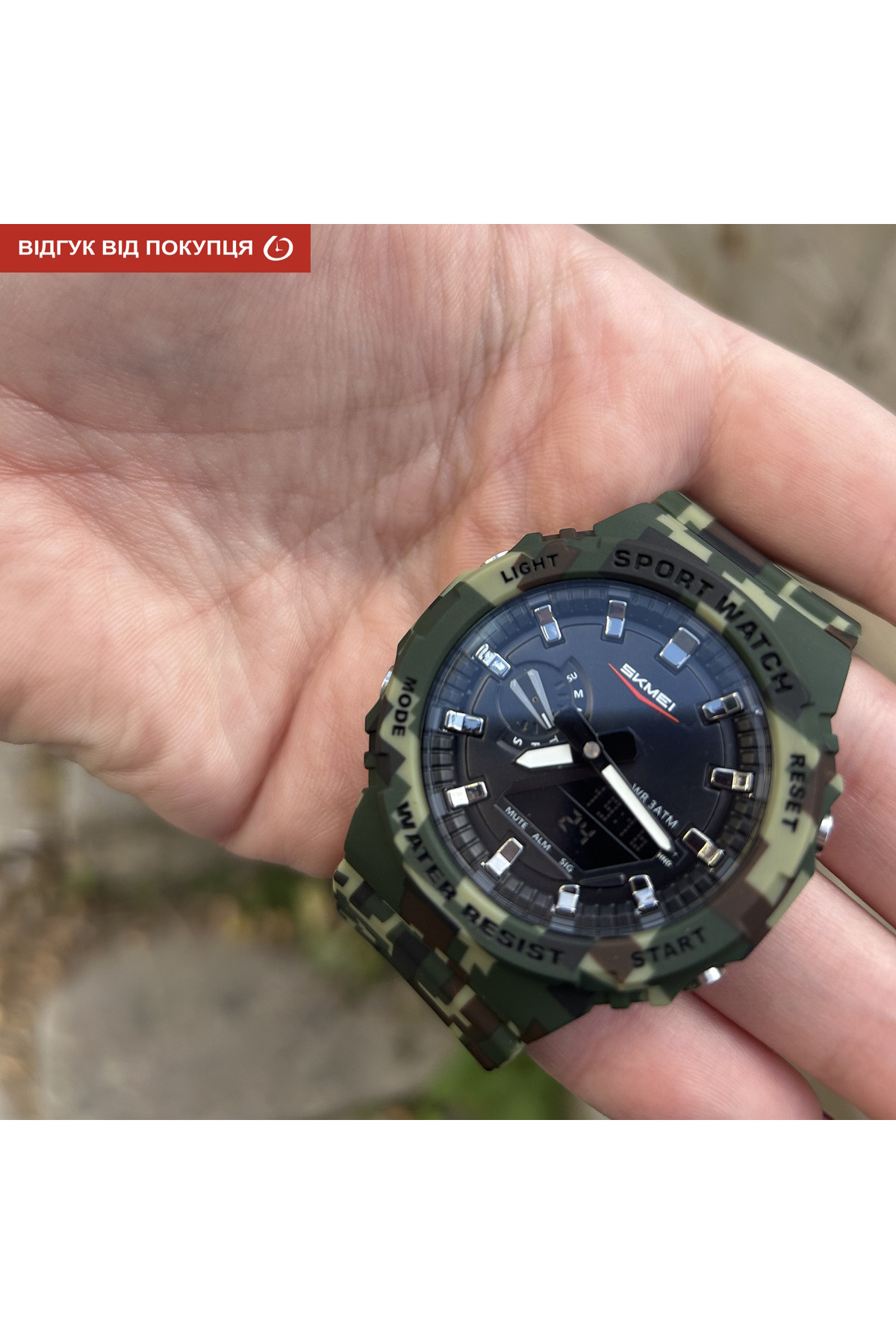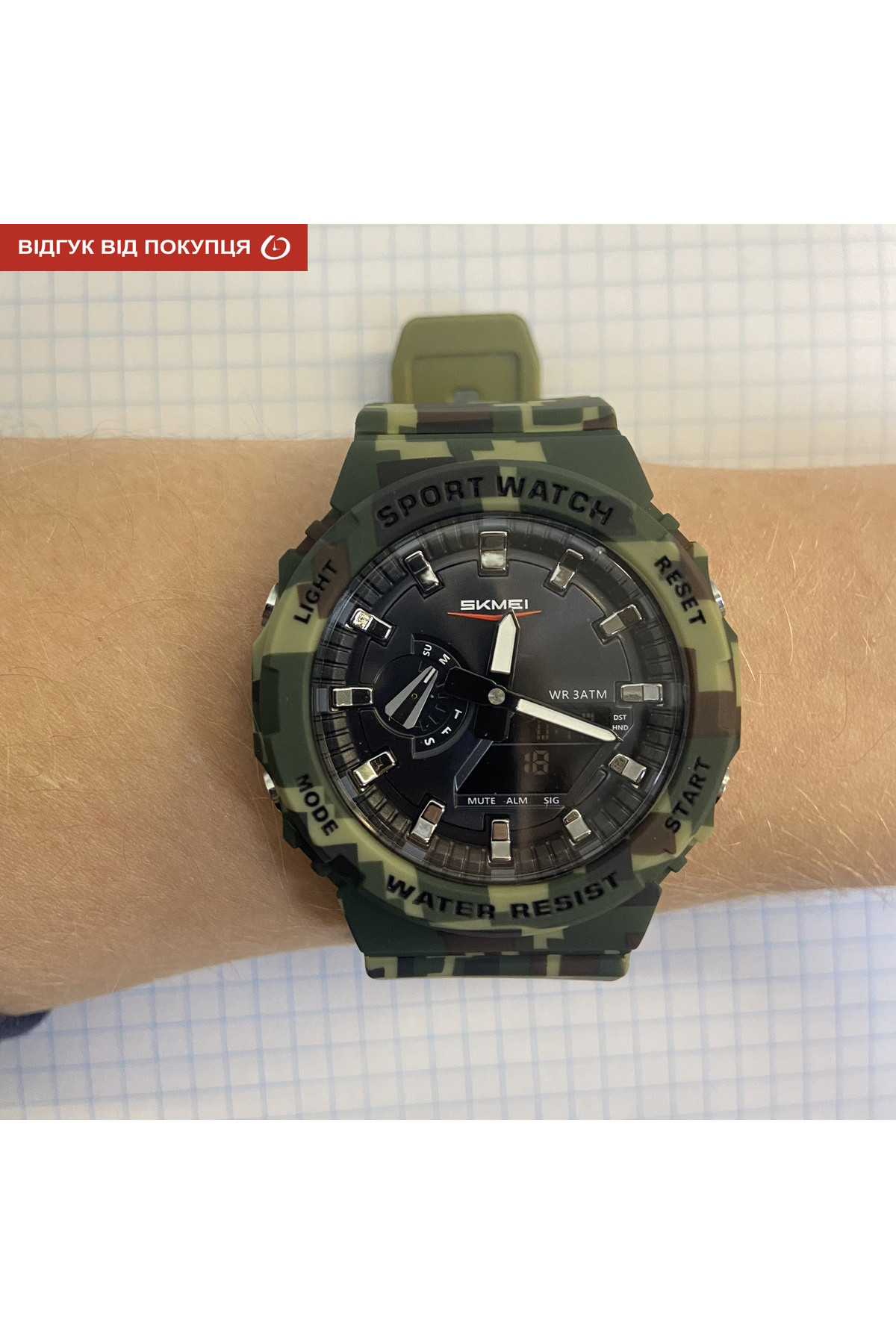 Секундомір, будильник, підсвічування, час показується на циферблаті і стрілками, дата, день тижня, місяць