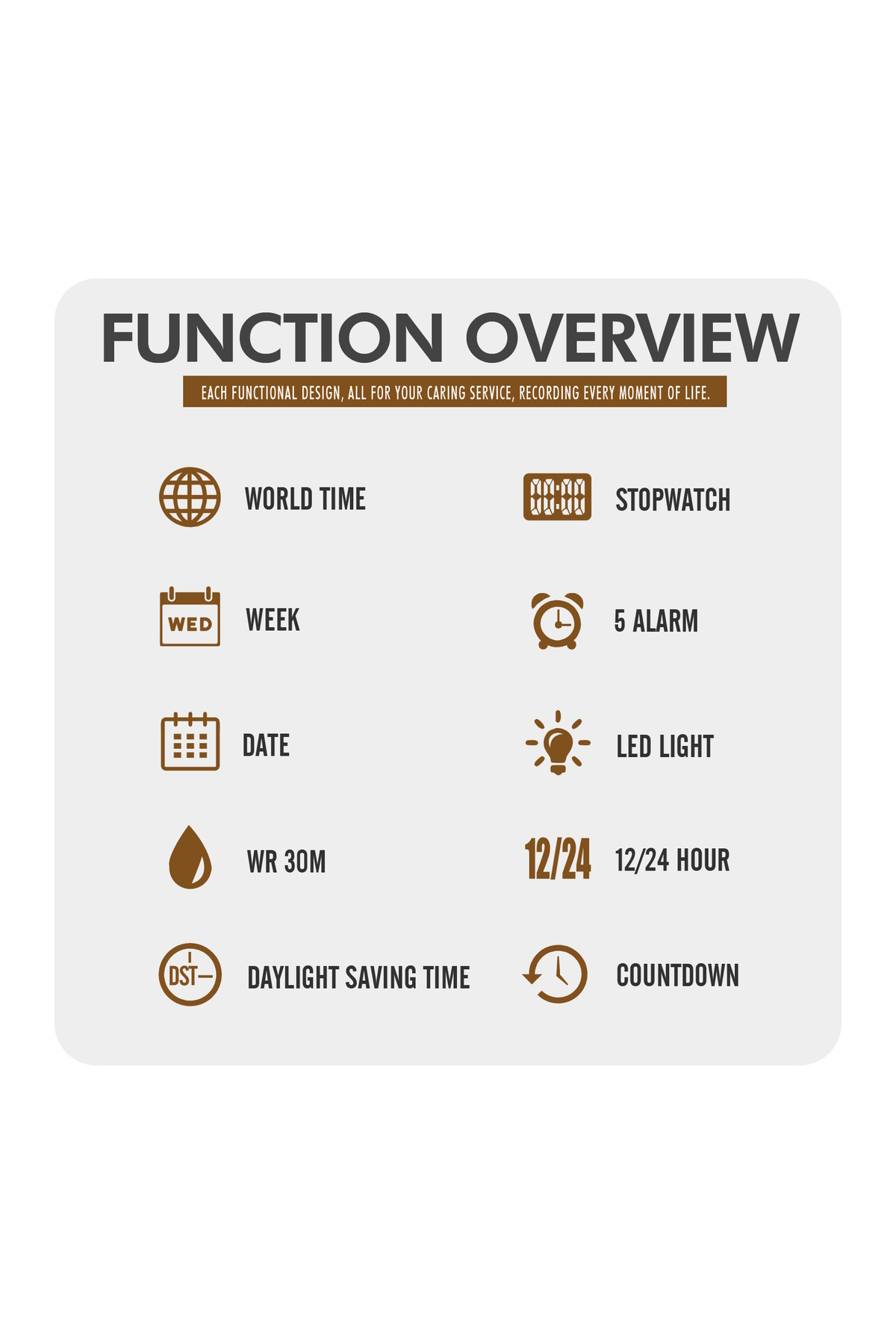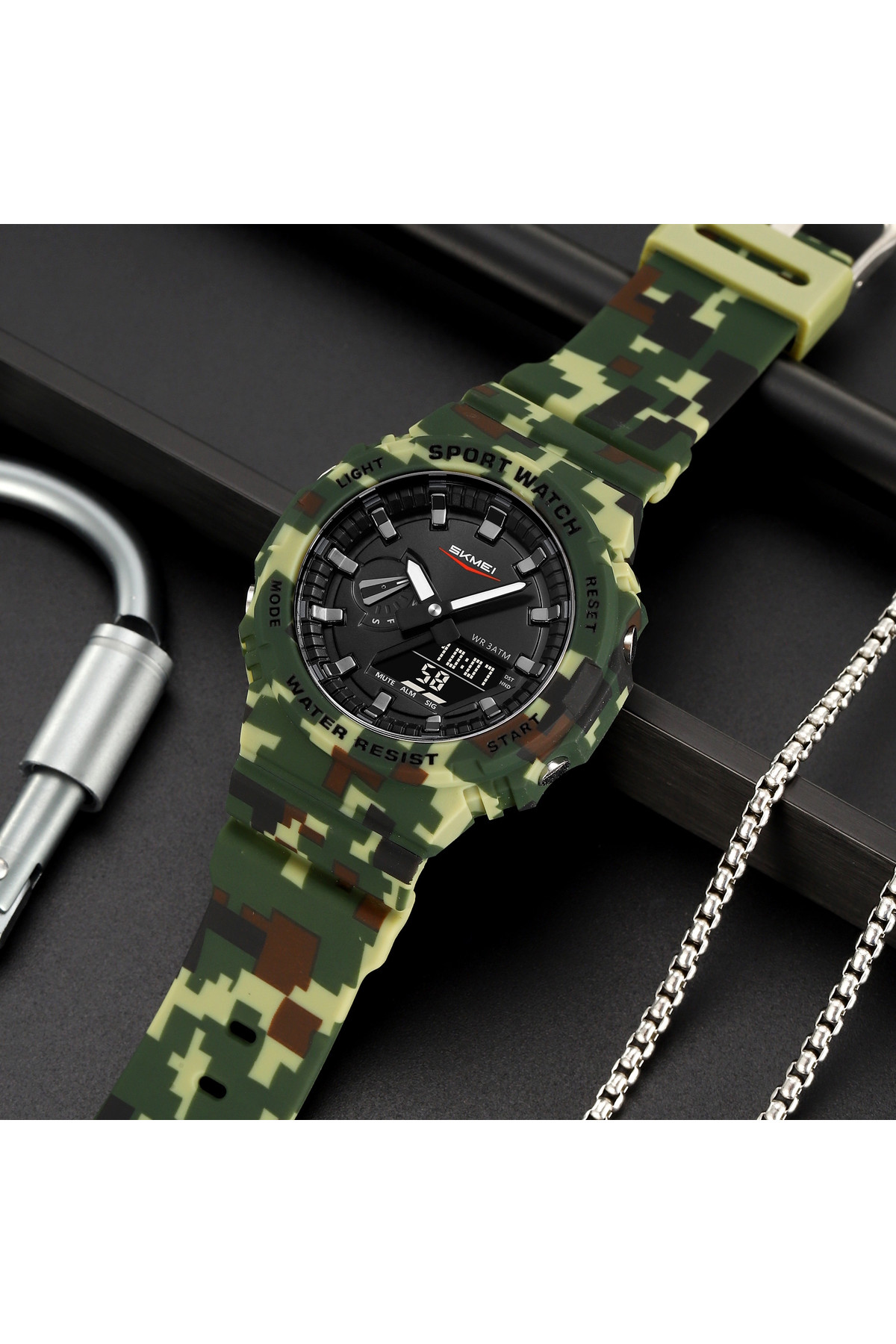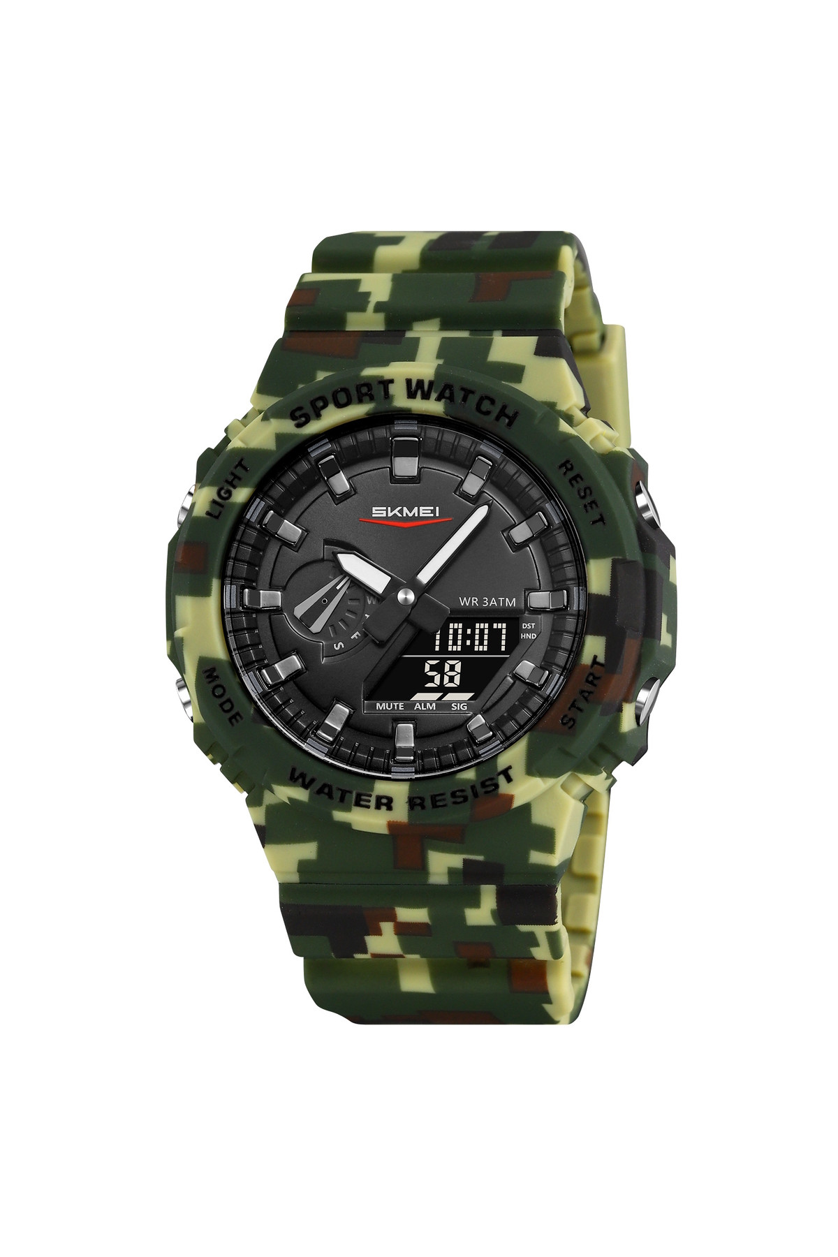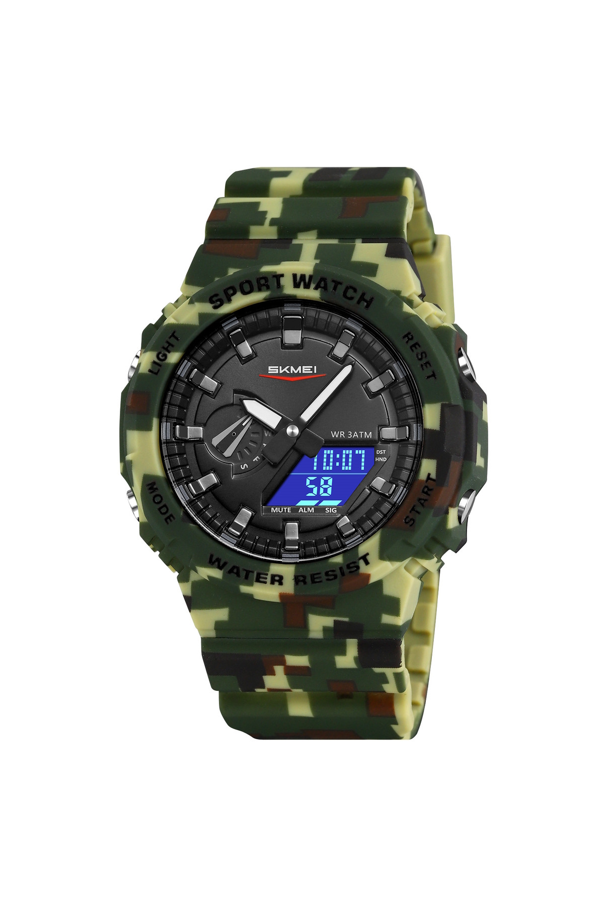 Секундомір, будильник, підсвічування, час показується на циферблаті і стрілками, дата, день тижня, місяць