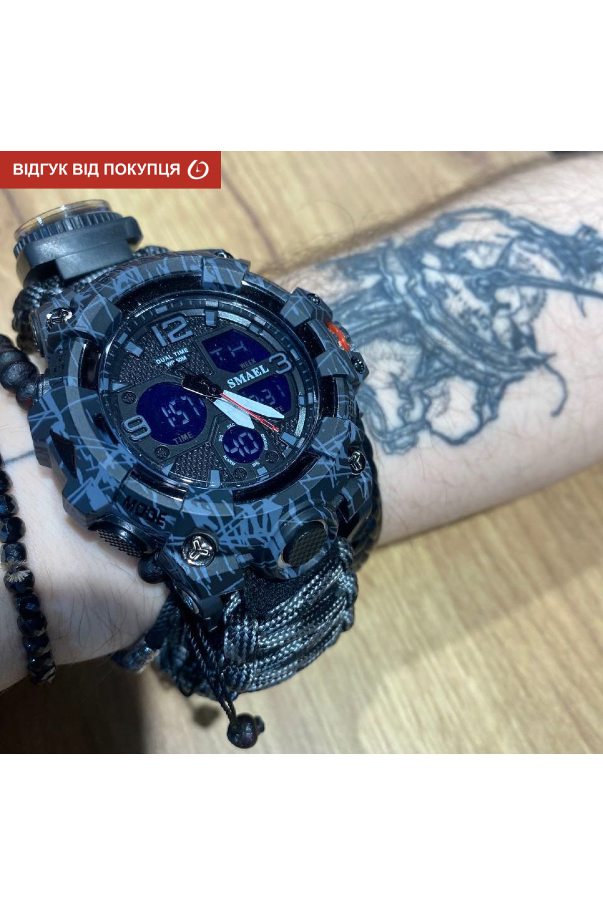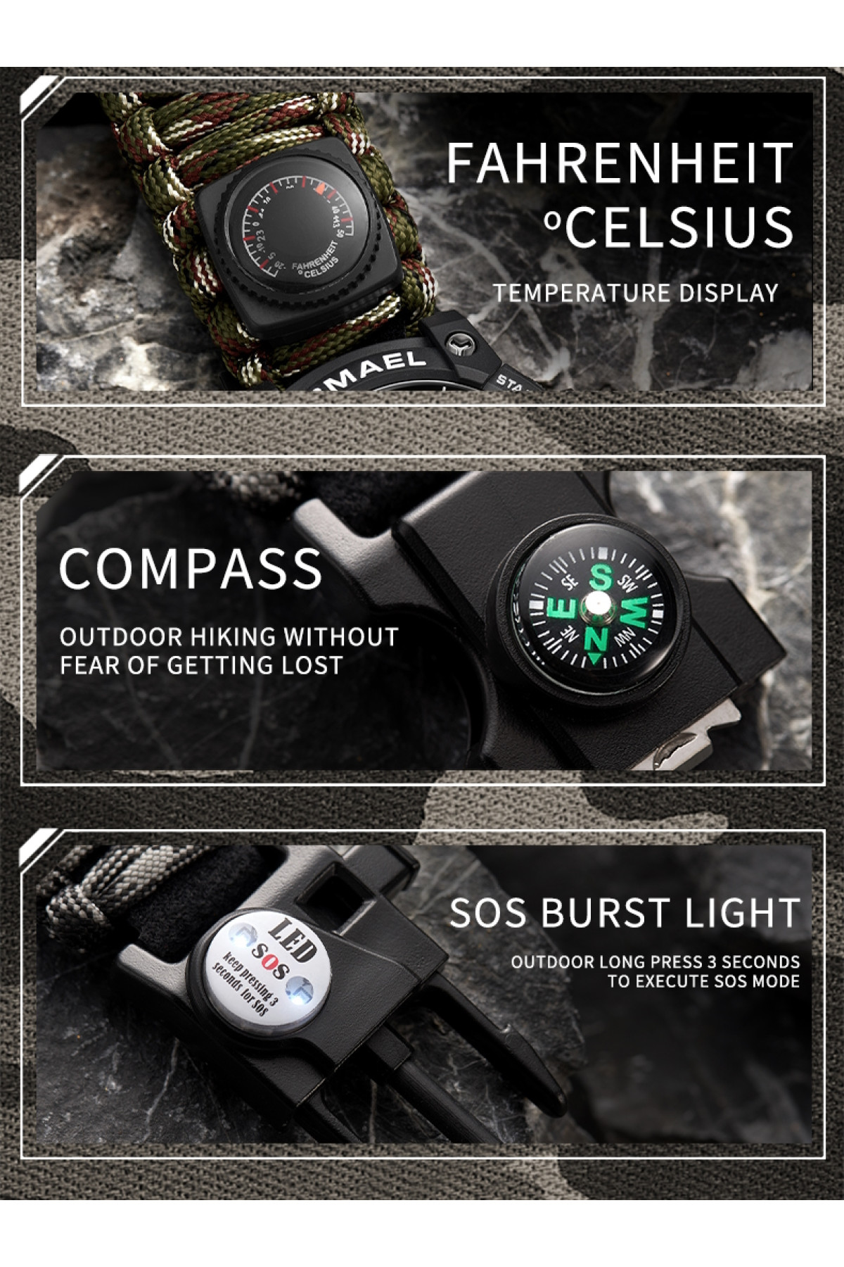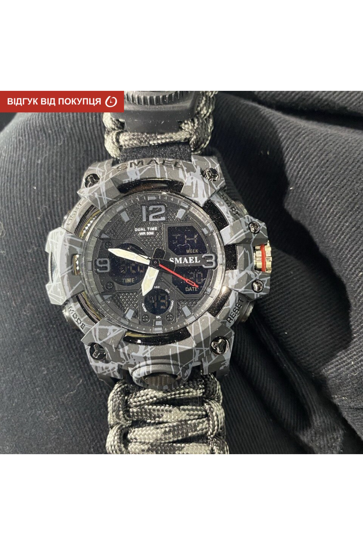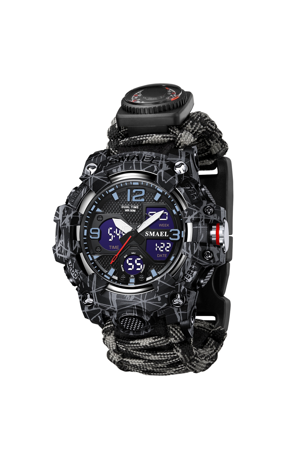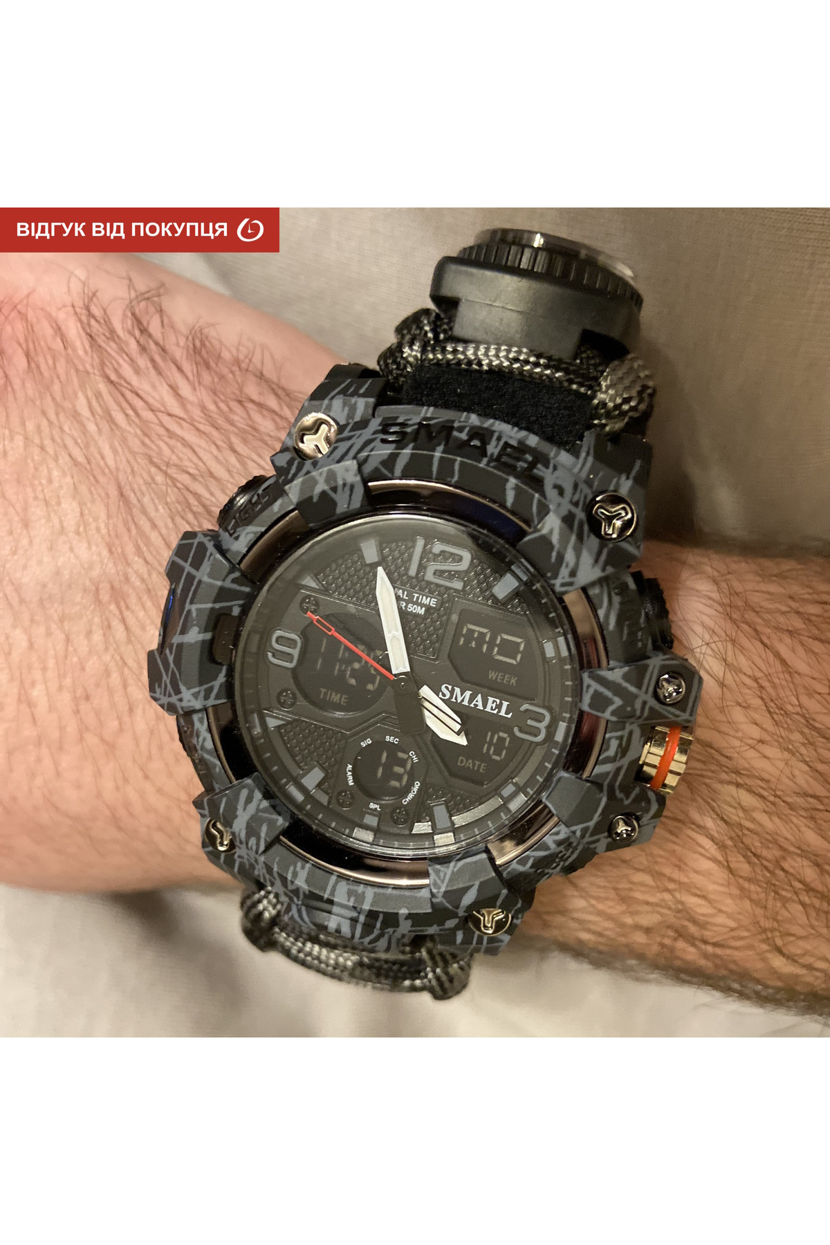 Компас, будильник, секундомір, подвійний час, кремінь, тактична застібка, підсвічування, свисток, термометр, 2 батарейки