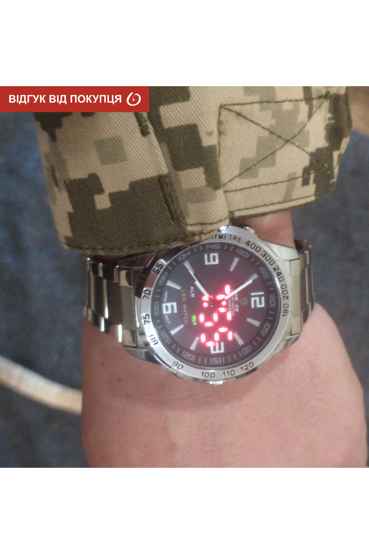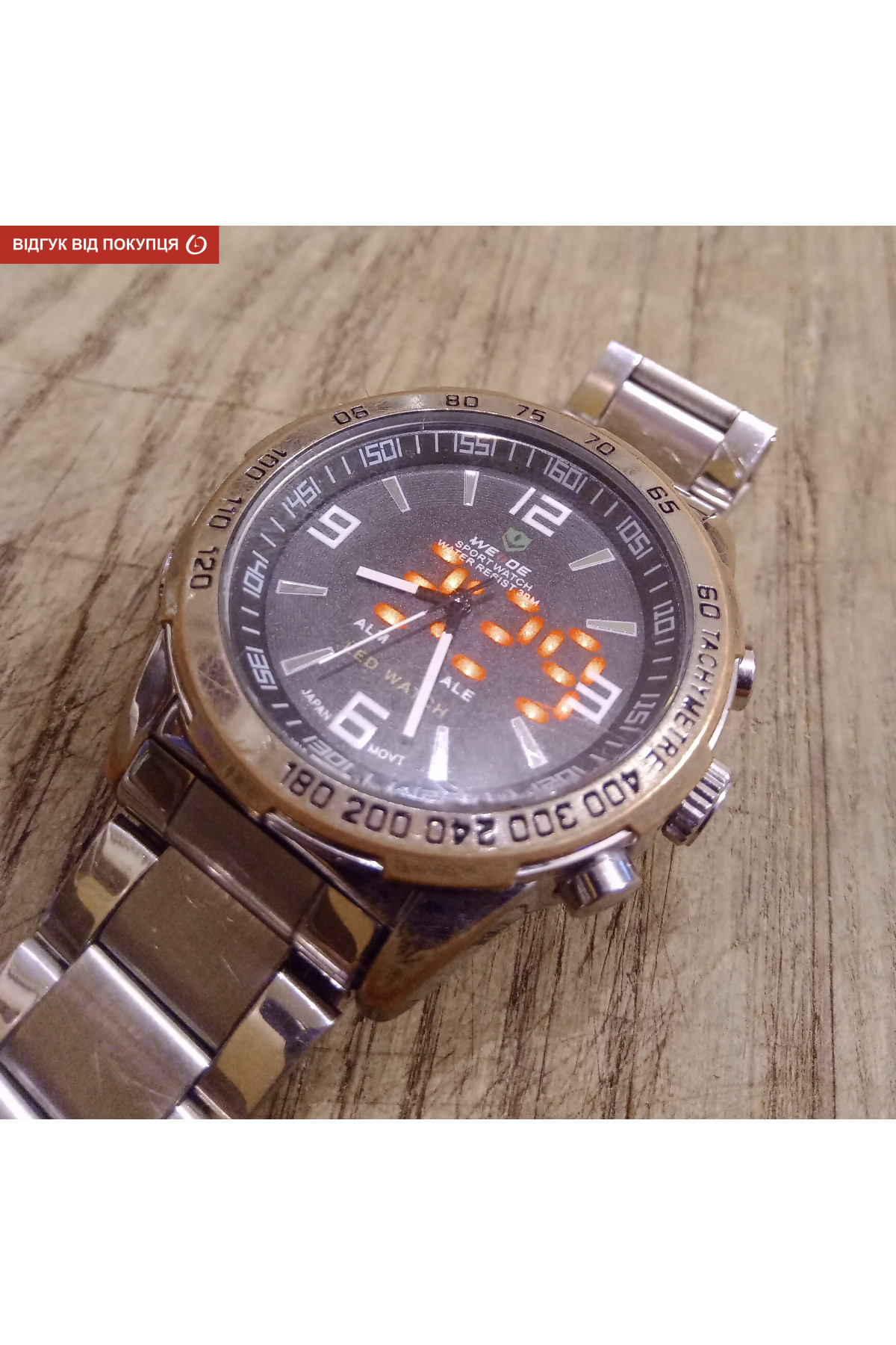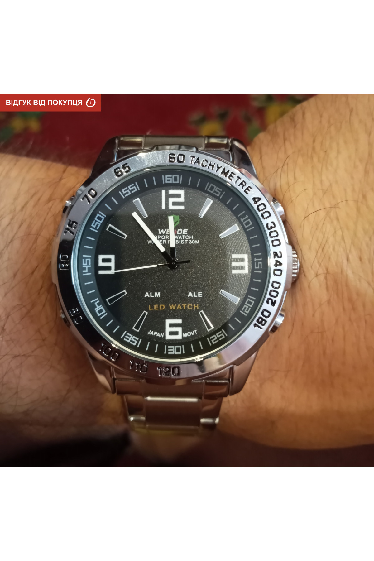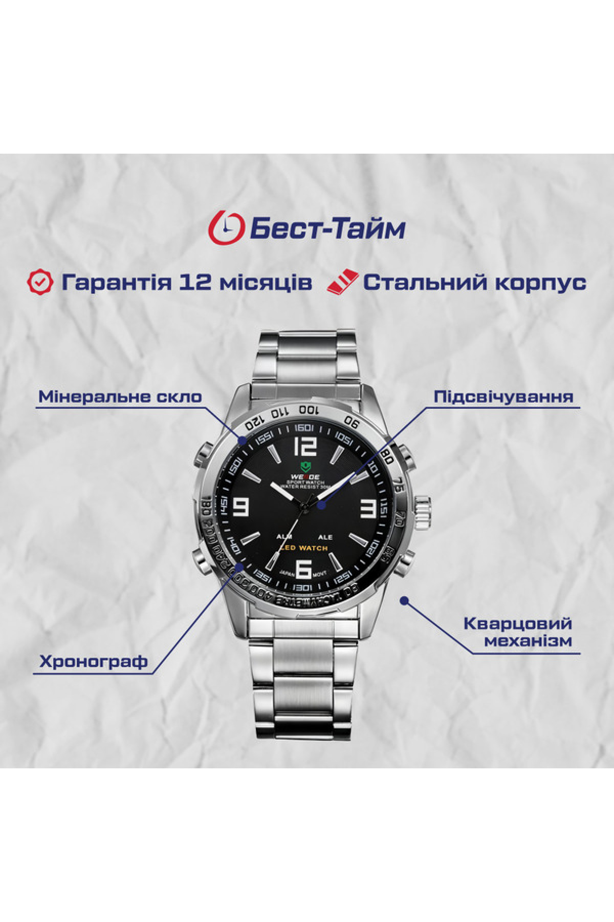Будильник, підсвічування, час показується на циферблаті й стрілками, дата, день тижня, місяць