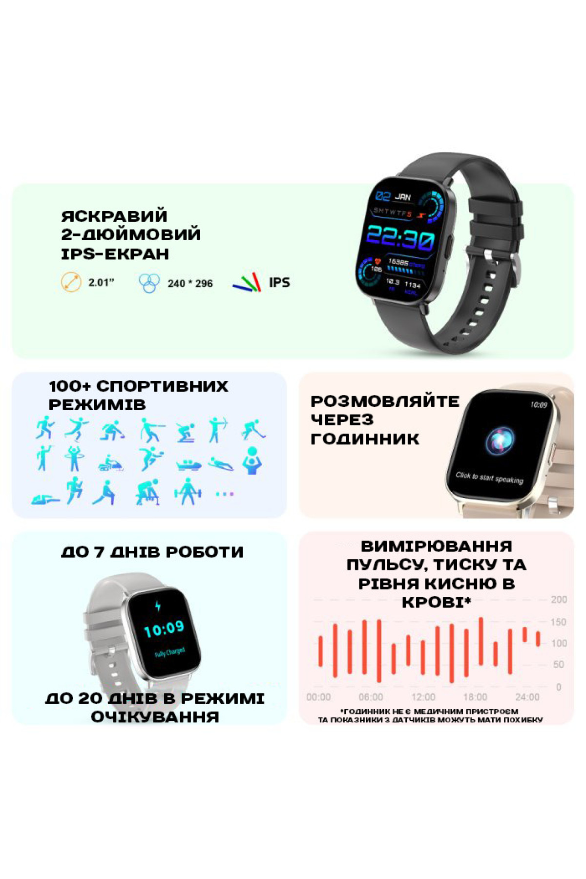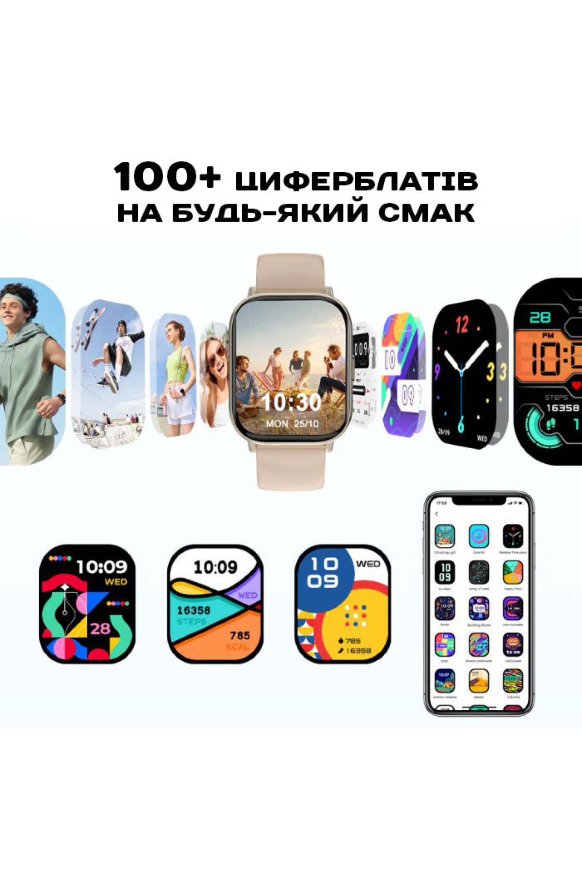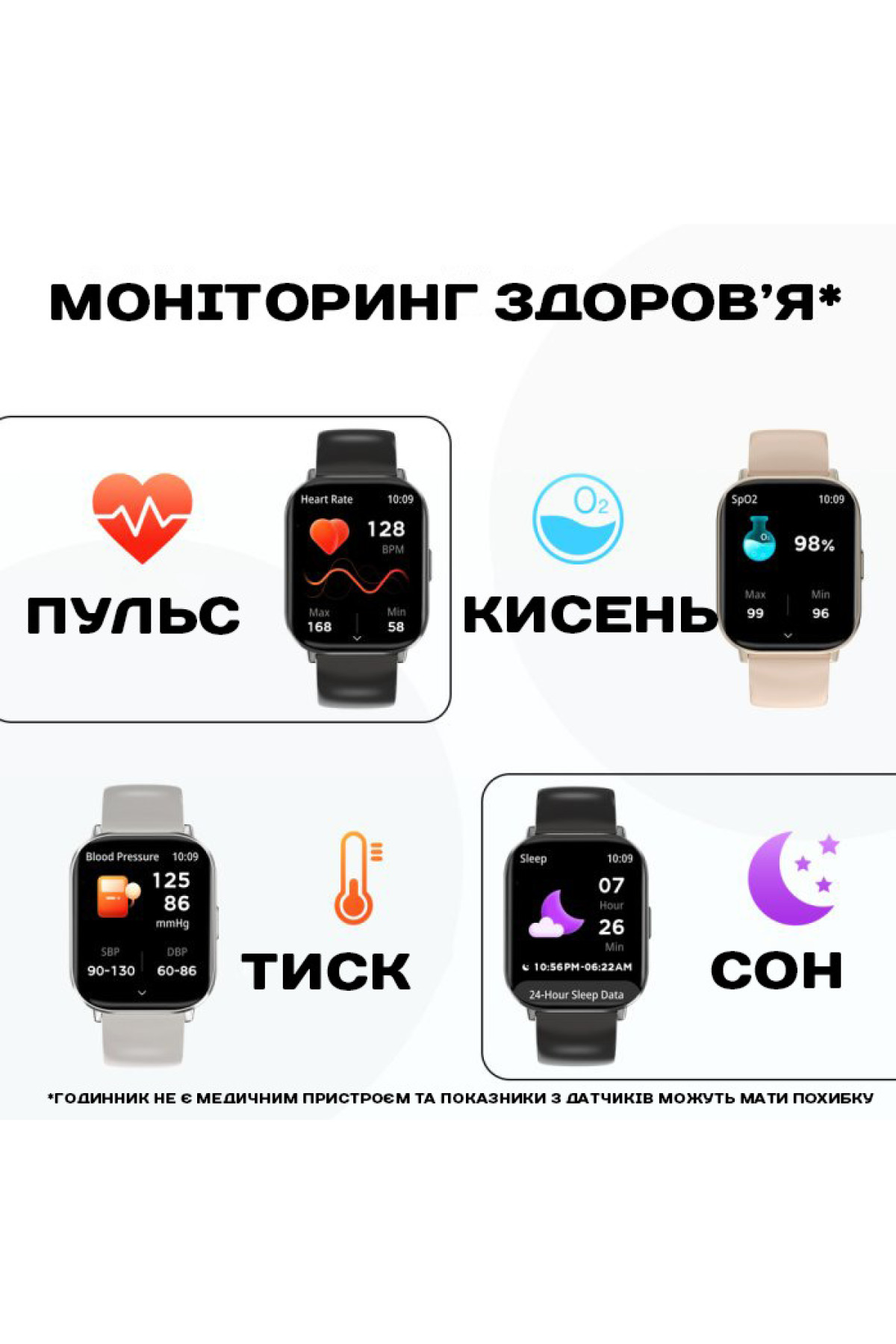 Вимірювання пульсу/тиску/кисню у крові; Понад 100 спортивних режимів та тренувань; Аналіз тренувань в реальному часі; Функція "Розумний сон +"; Підрахунок калорій; Крокомір, дистанції; Голосовий помічник; 100+ заставок екрану та можливість поставити фото з телефону; Управління музичним плеєром; Дистанційне керування камерою