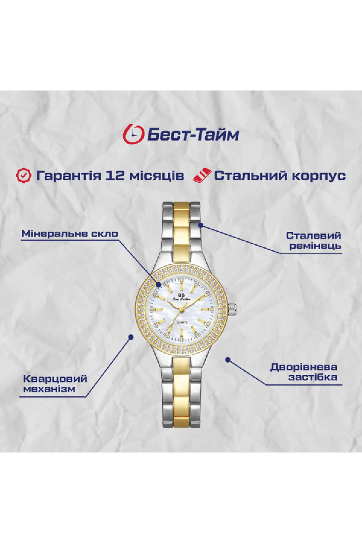 BS - новий бренд жіночих наручних годинників, вперше представлений в Україні. Годинники цього виробника надзвичайно витончені, мають неповторний дизайн та підійдуть під будь-який образ. Моделі працюють на кварцовому японському механізмі, оснащені надійним мінеральним склом й мають базову водонепроникність.В комплекті йде офіційна гарантія на 12 місяців.