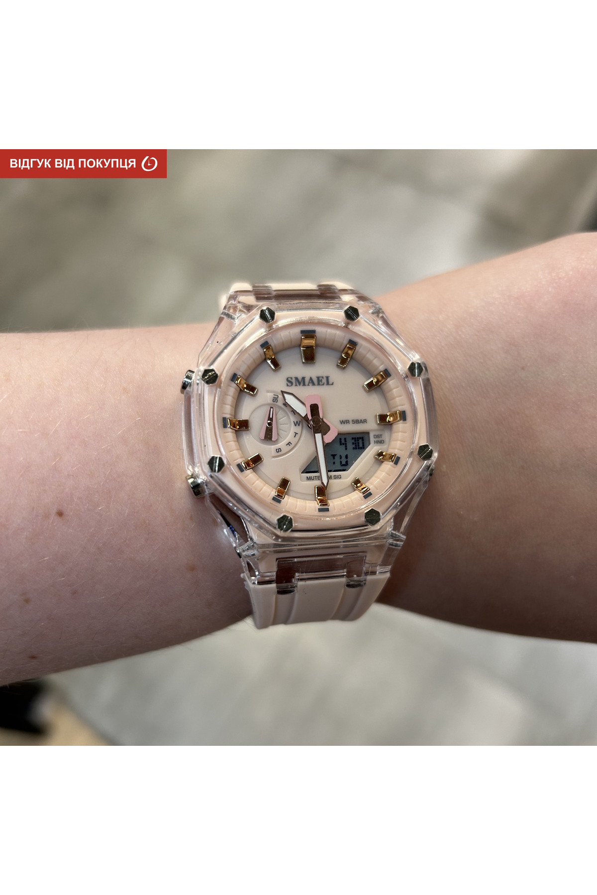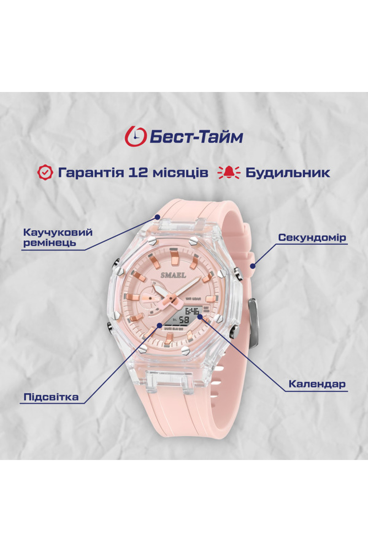 Подвійний час, 2 механізми, секундомір, будильник, підсвічування, дата, день тижня, місяць